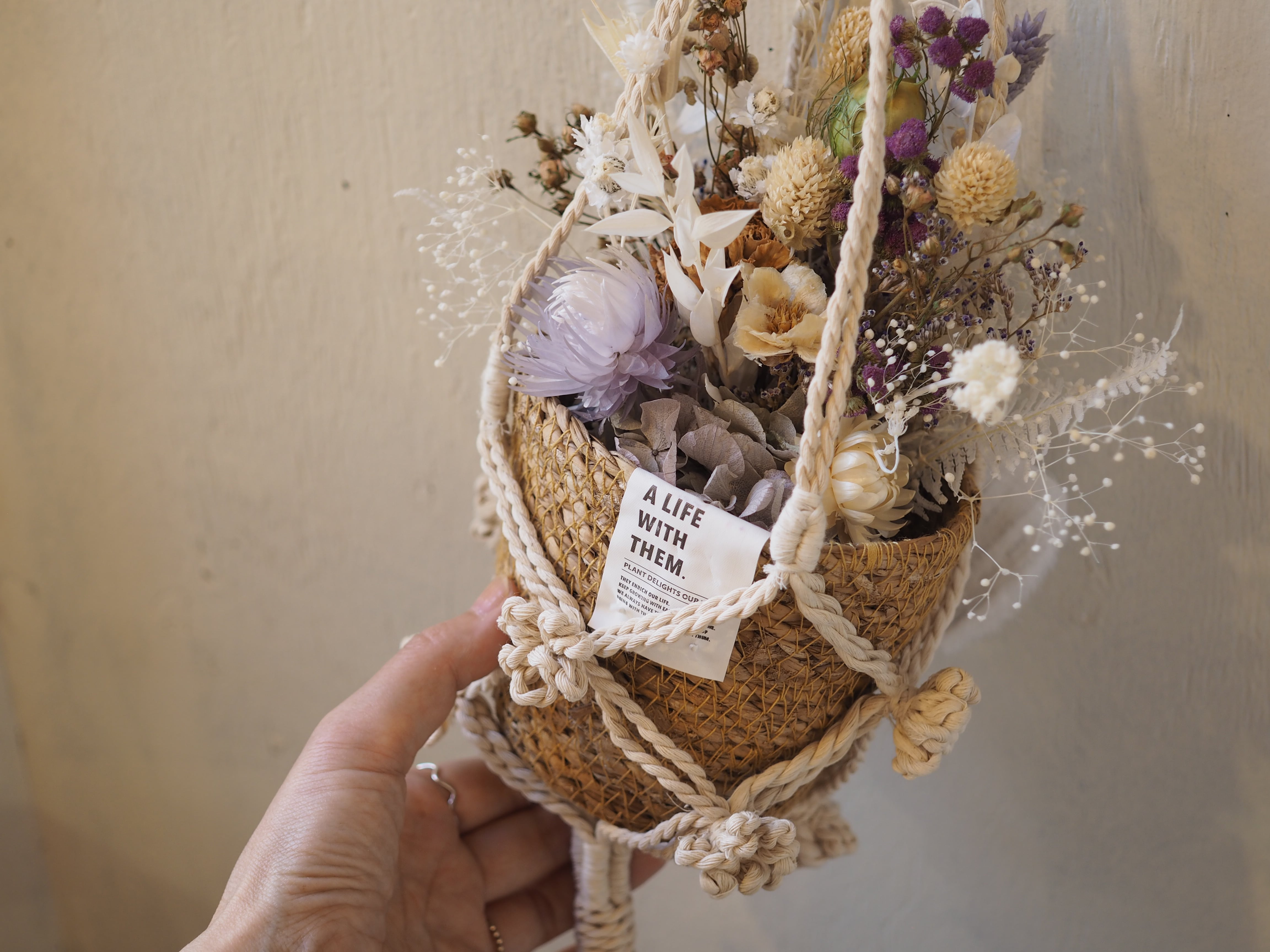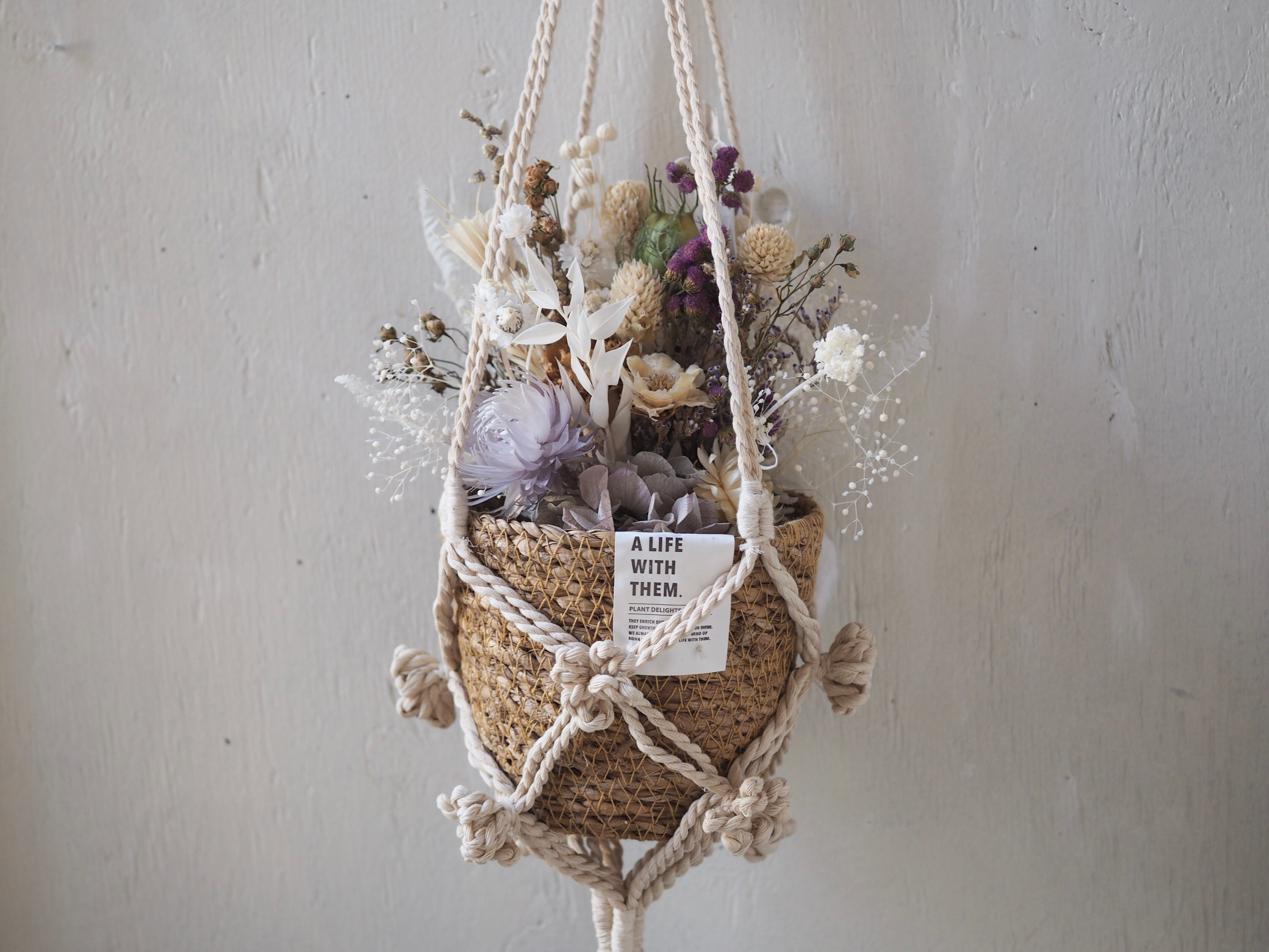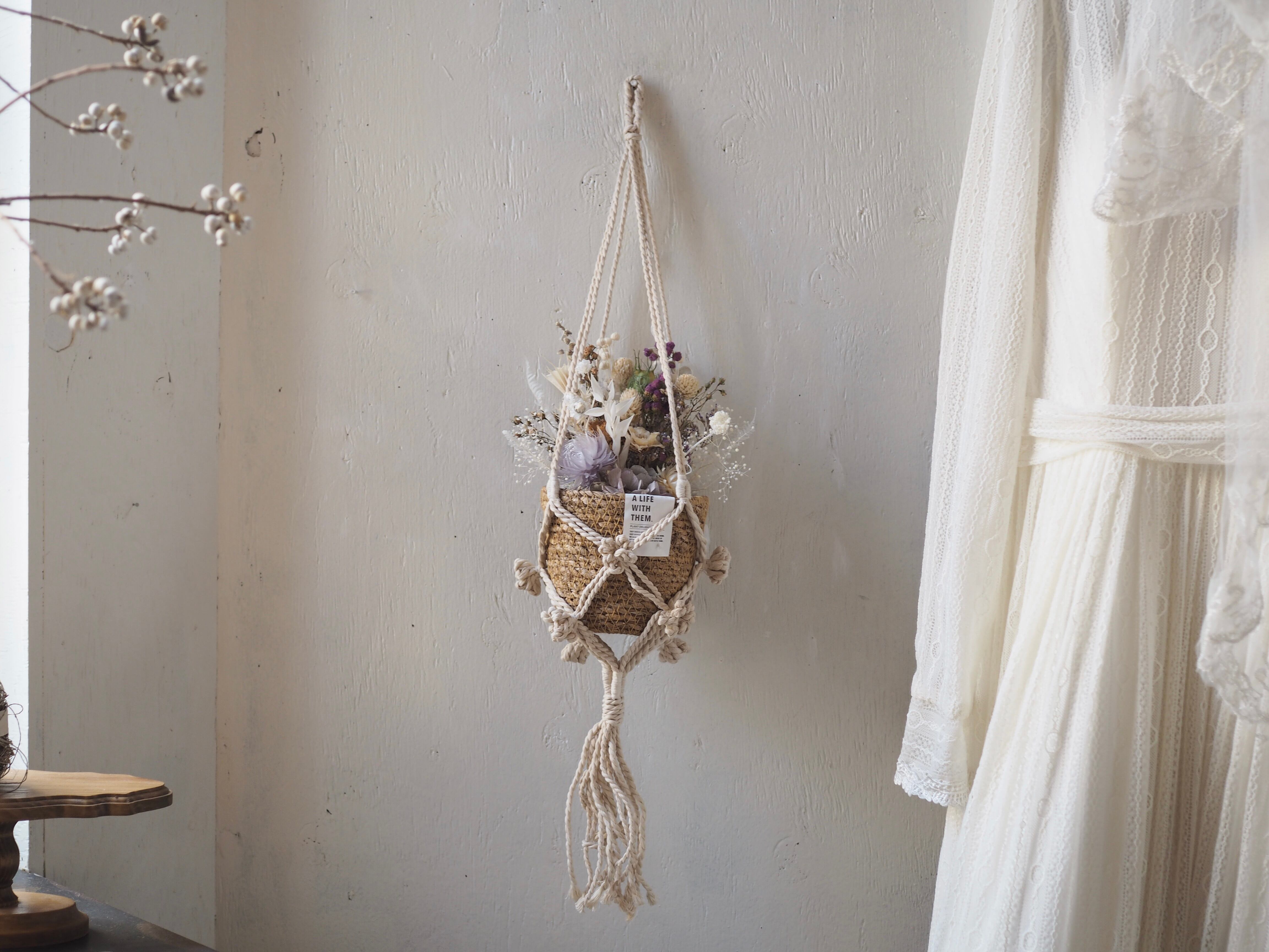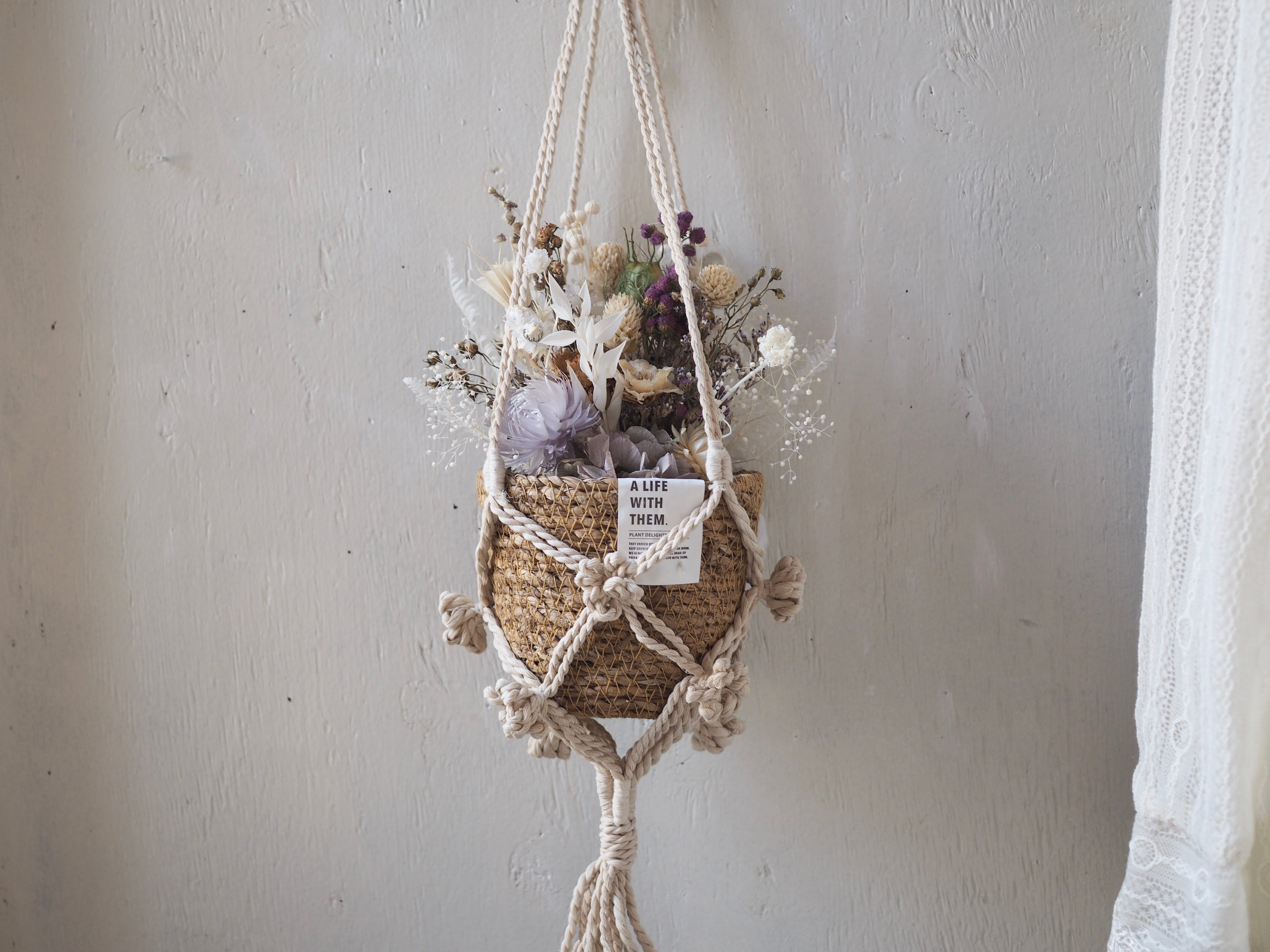 ナチュラルな風合いのマクラメハンギングポットに、ドライフラワーをあわせた、吊るして楽しむアイテムです。