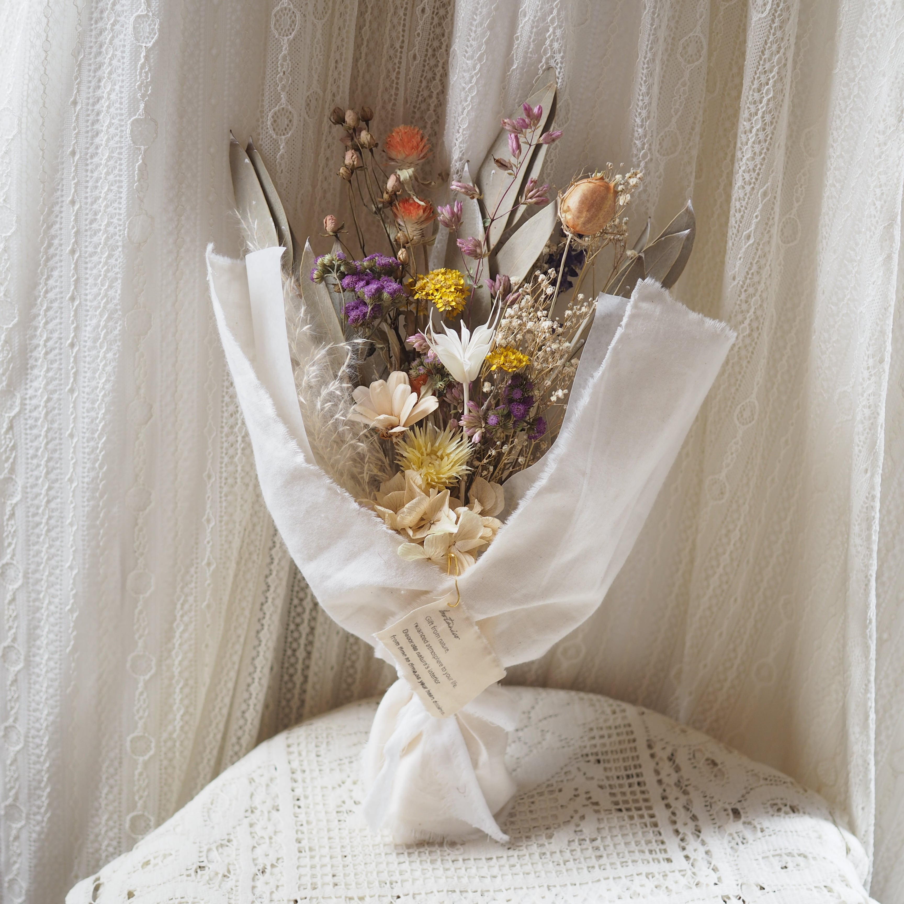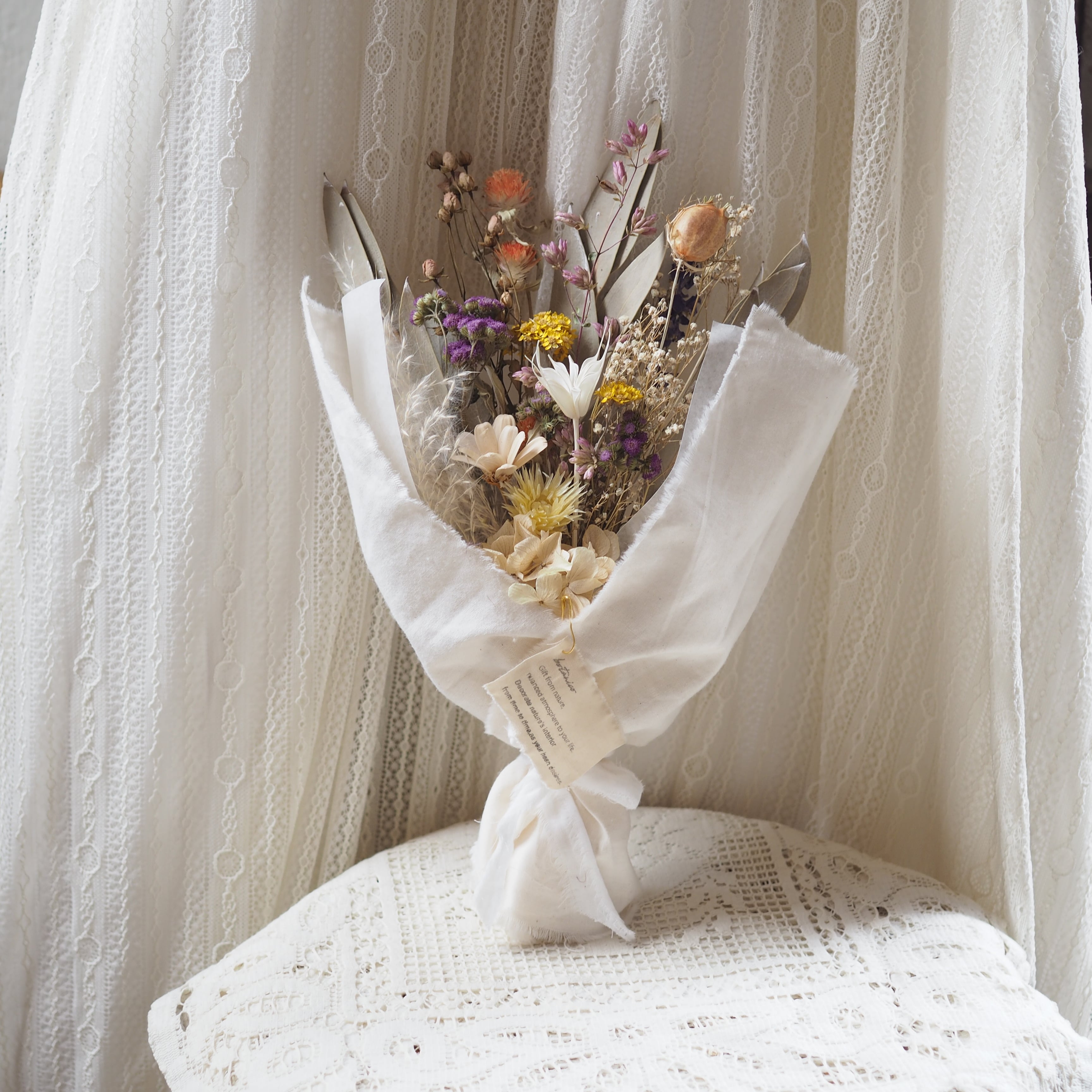可愛い小花をたっぷり束ね、布で包んだブーケです。