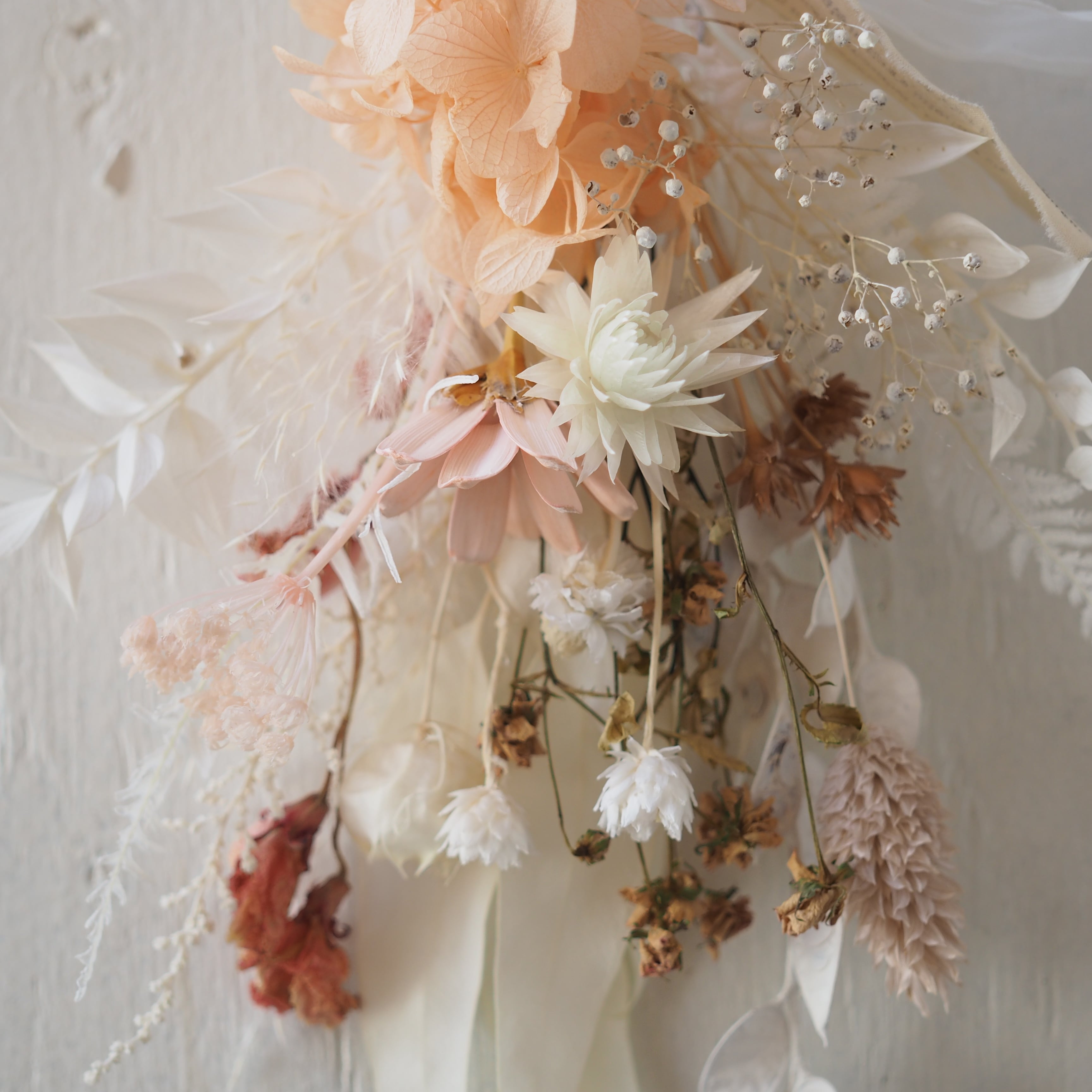 スワッグの雰囲気に合う、ナチュラルなお花や葉を使って、一つ一つ丁寧に作りました。