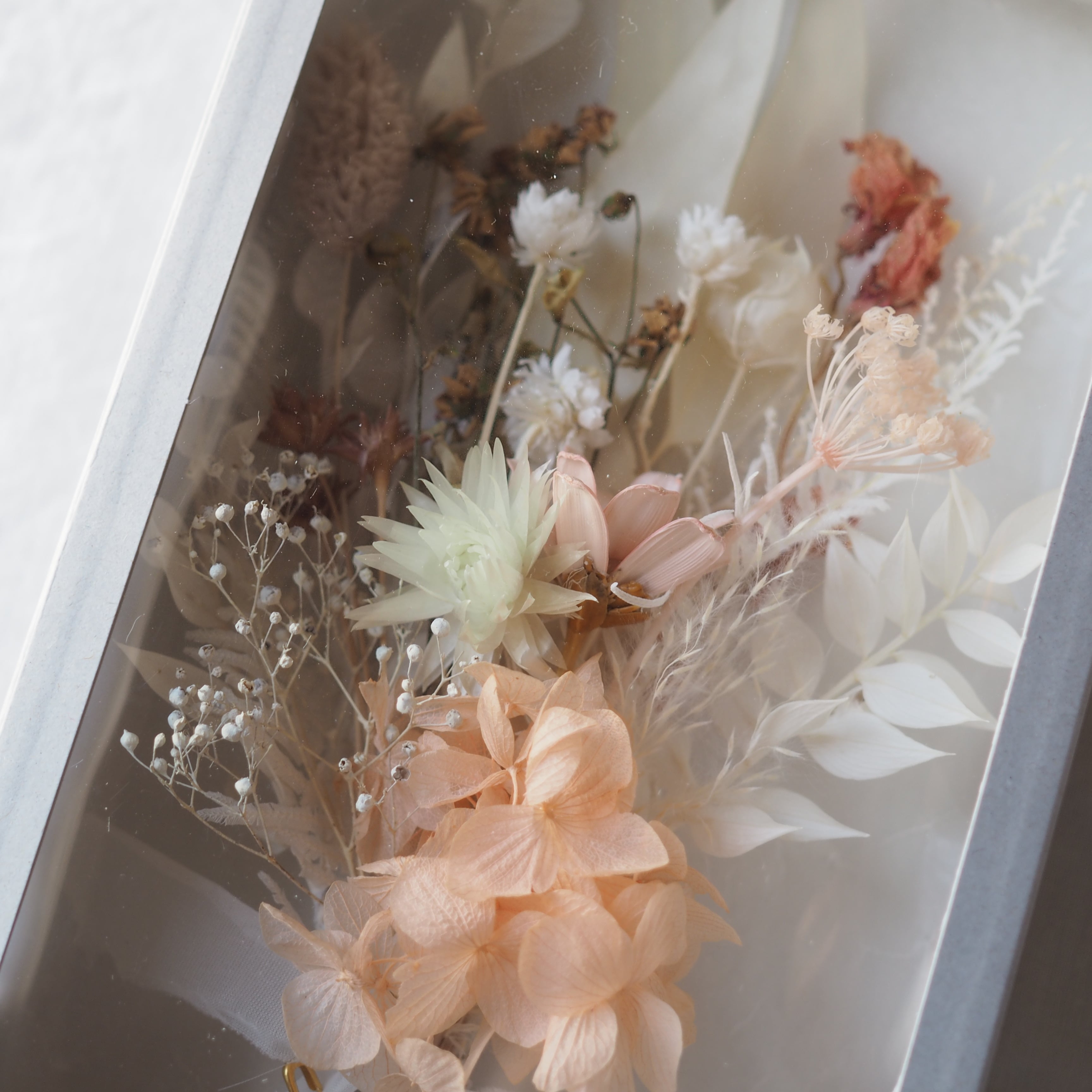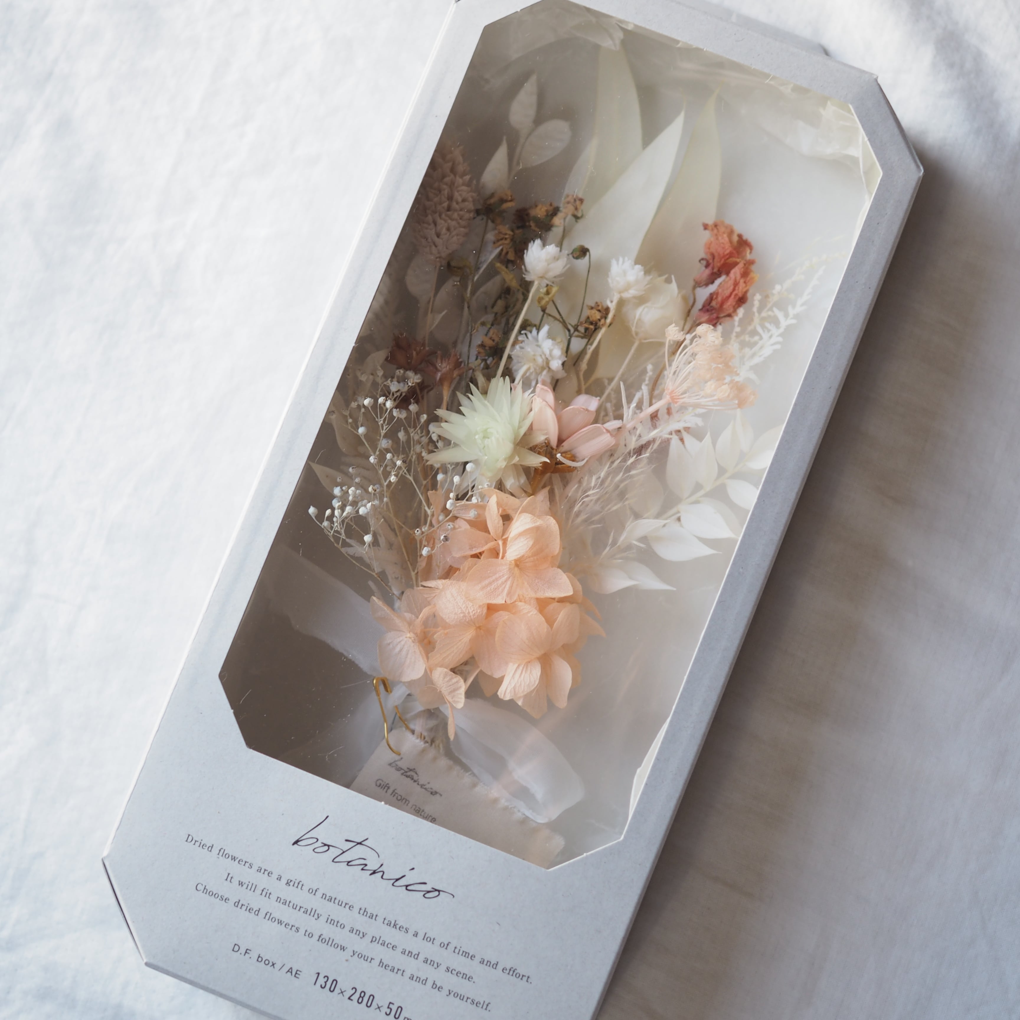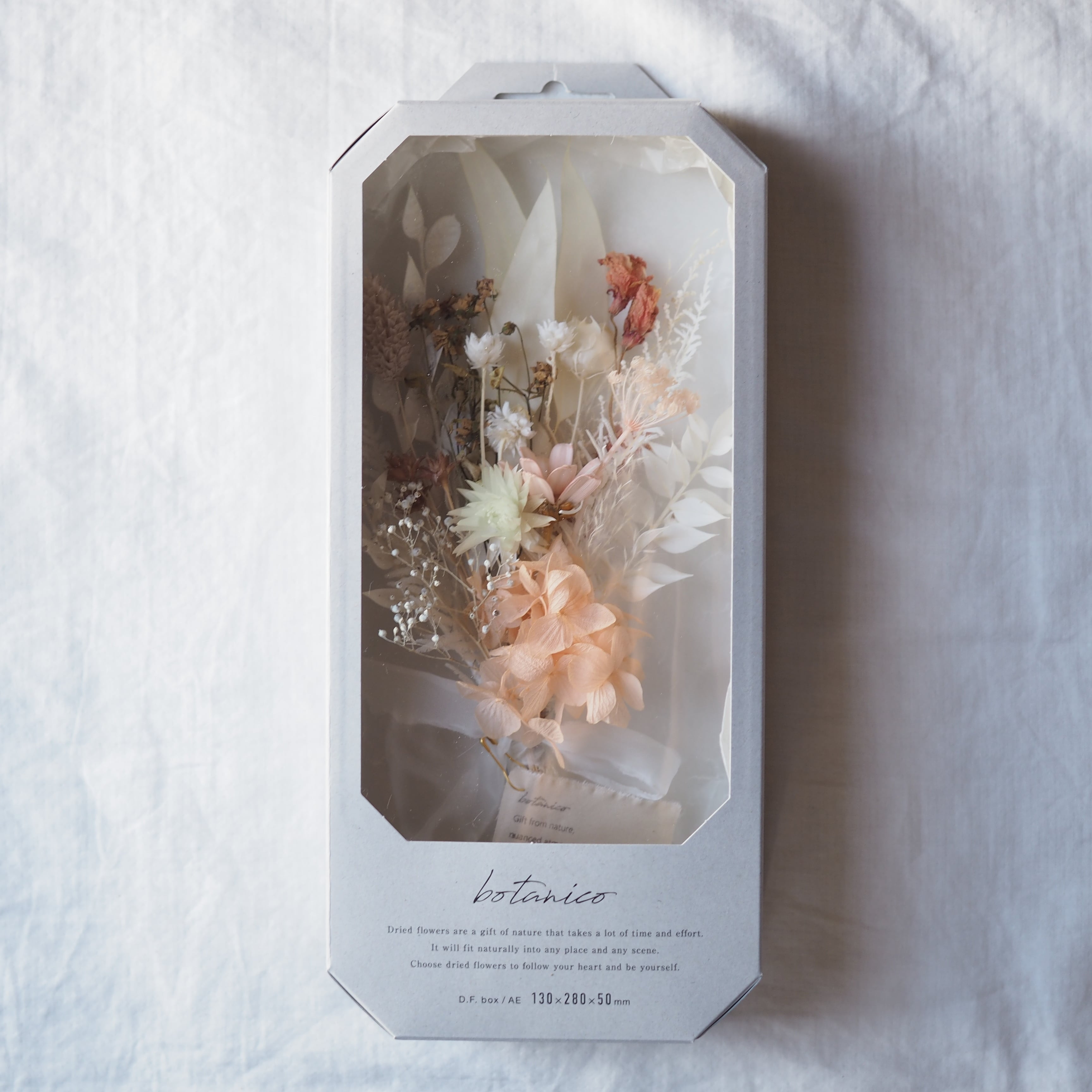 botanicoオリジナルのboxには、たっぷり束ねたドライフラワーが入っています。繊細なドライフラワーは箱で守られているので型崩れの心配がなく、贈り物としてもおすすめです。