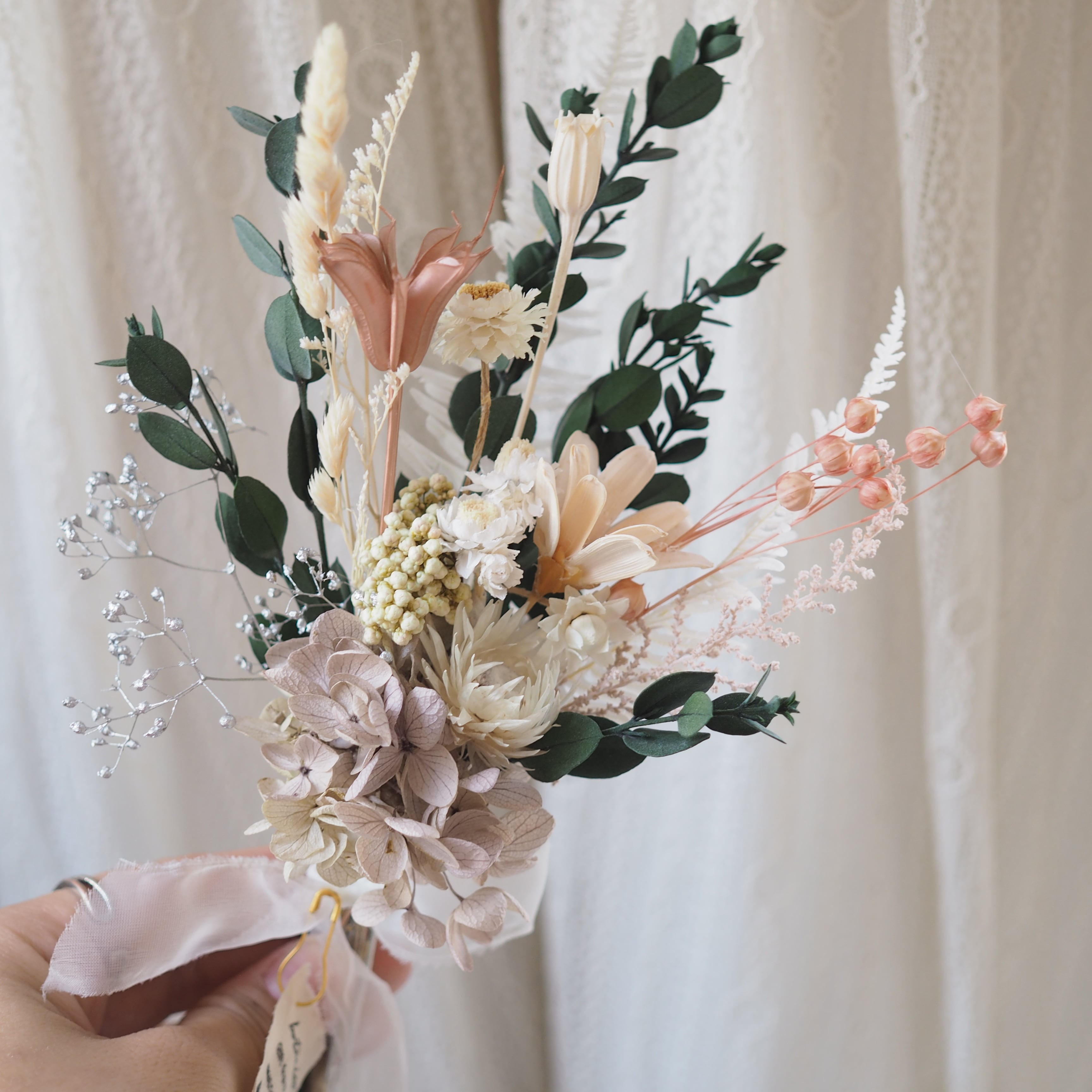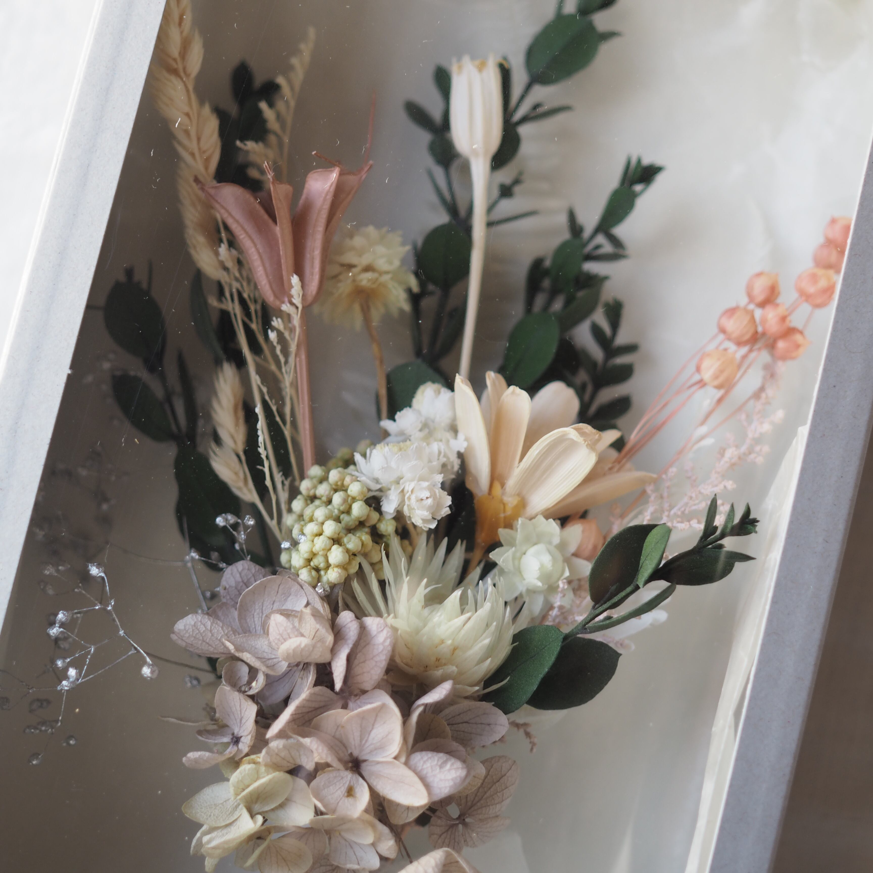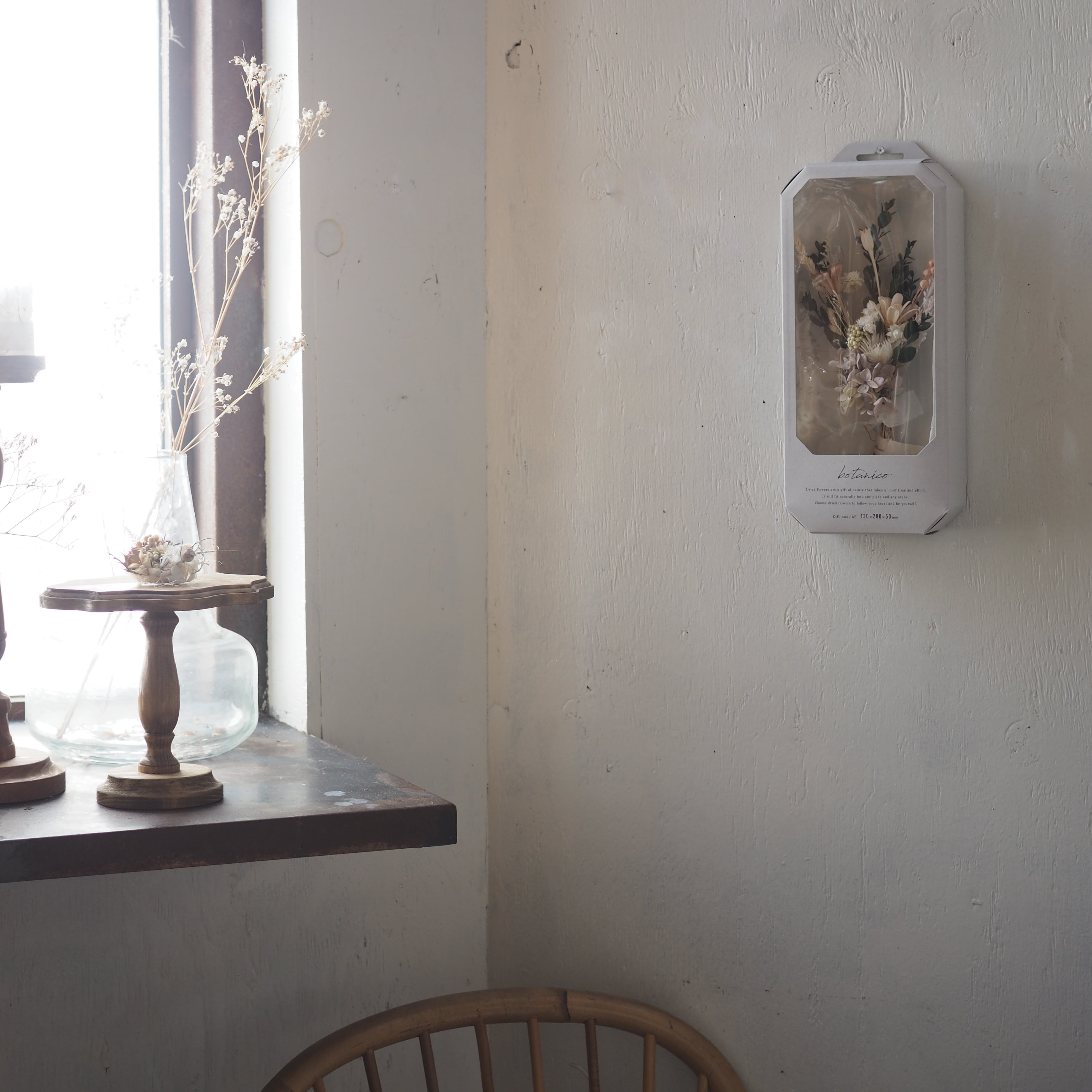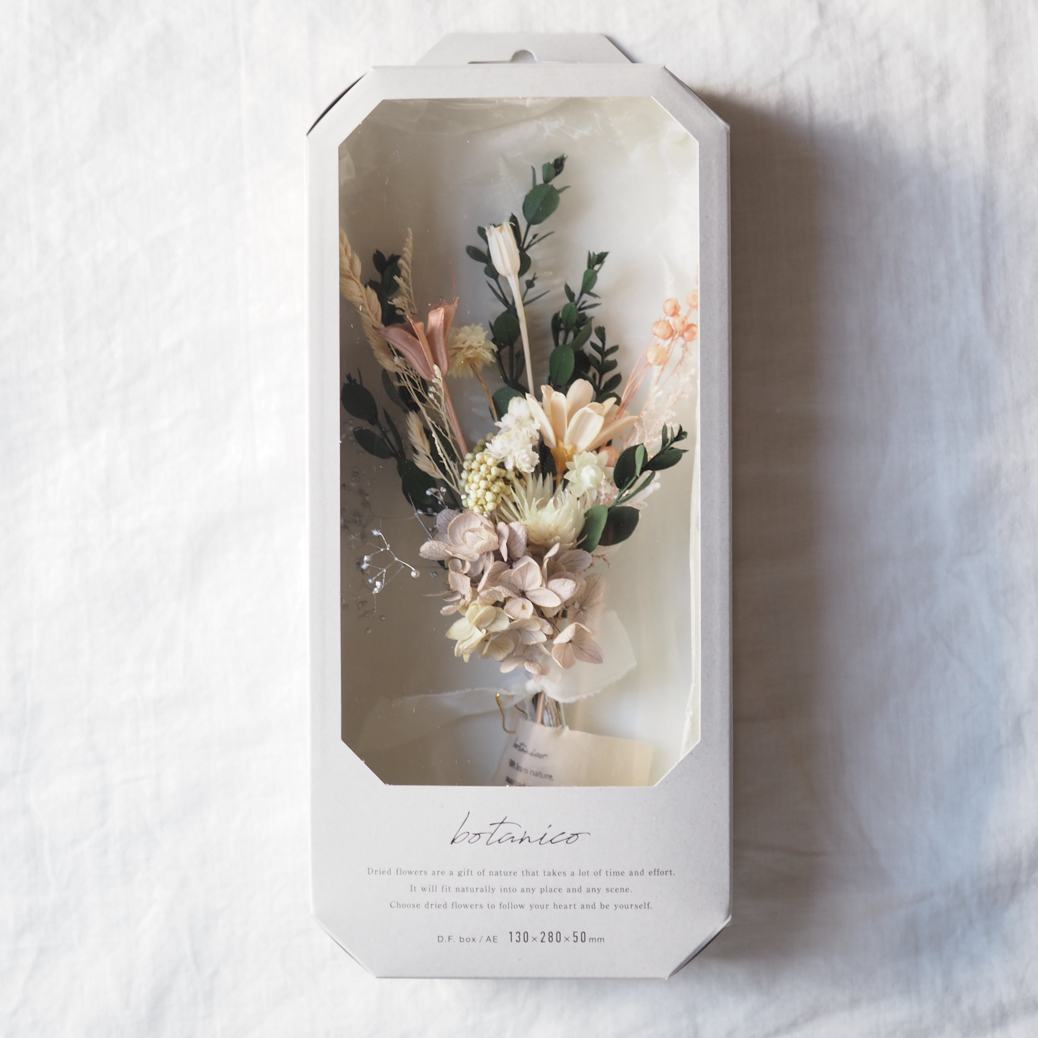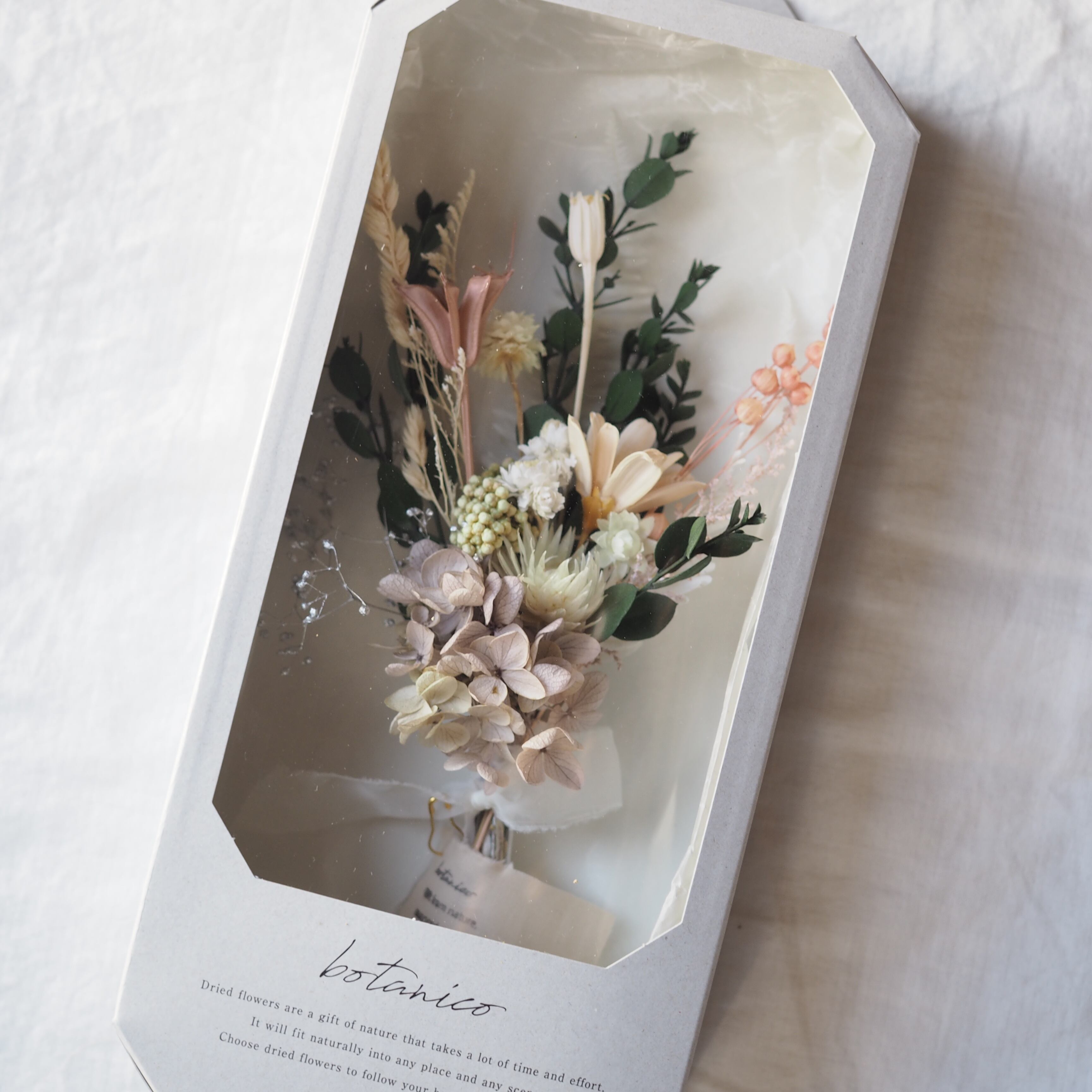botanicoオリジナルのboxには、たっぷり束ねたドライフラワーが入っています。繊細なドライフラワーは箱で守られているので型崩れの心配がなく、贈り物としてもおすすめです。