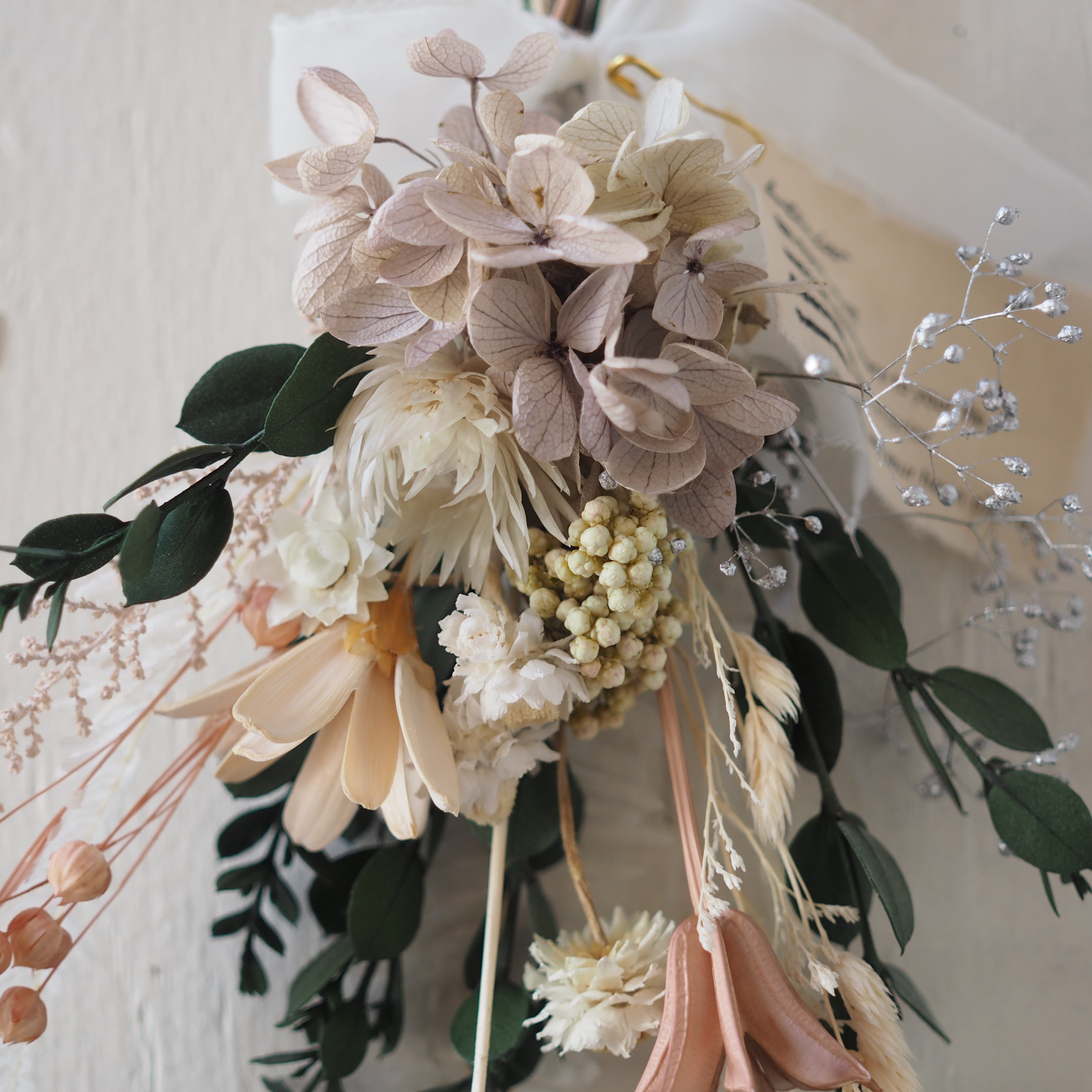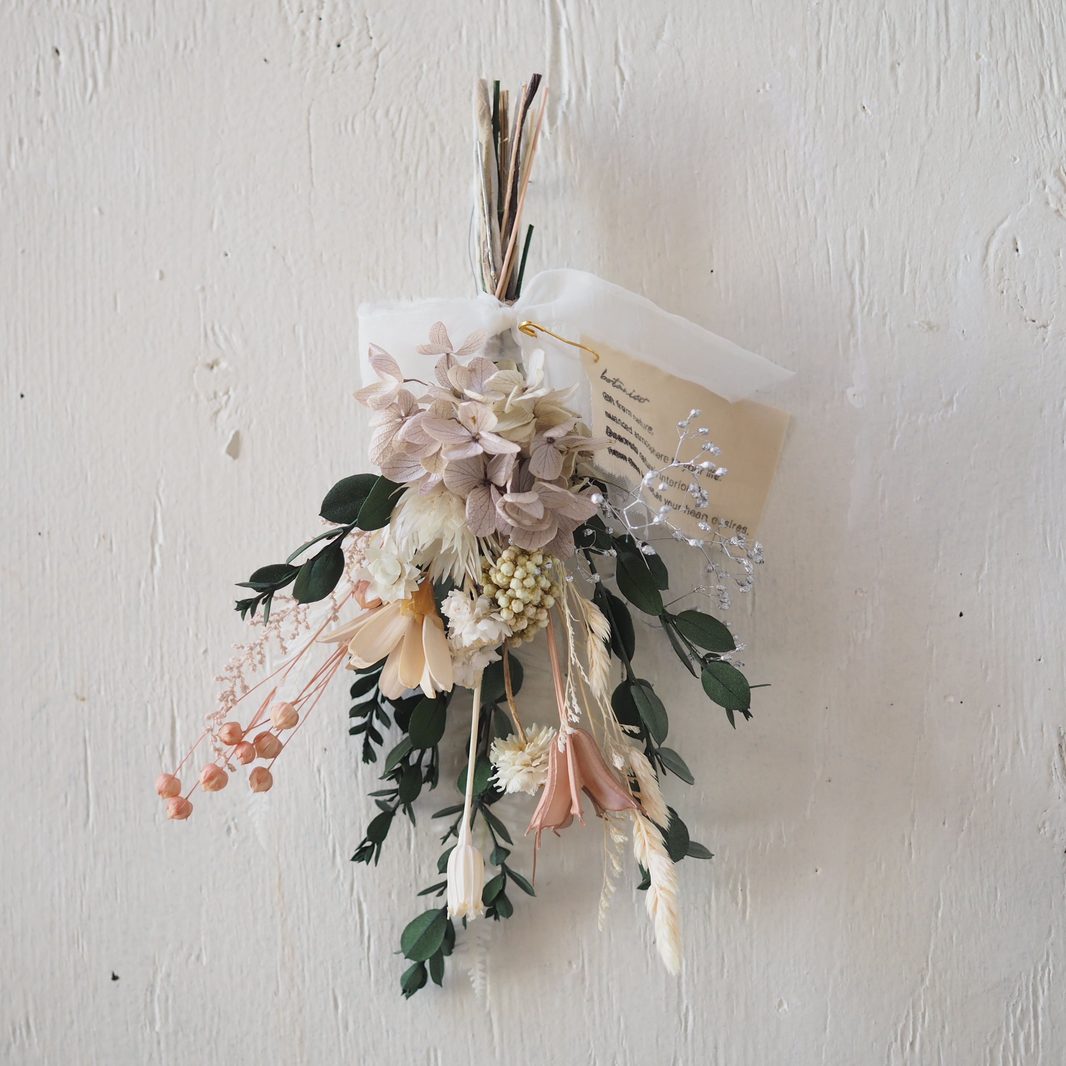 スワッグの雰囲気に合う、ナチュラルなお花や葉を使って、一つ一つ丁寧に作りました。