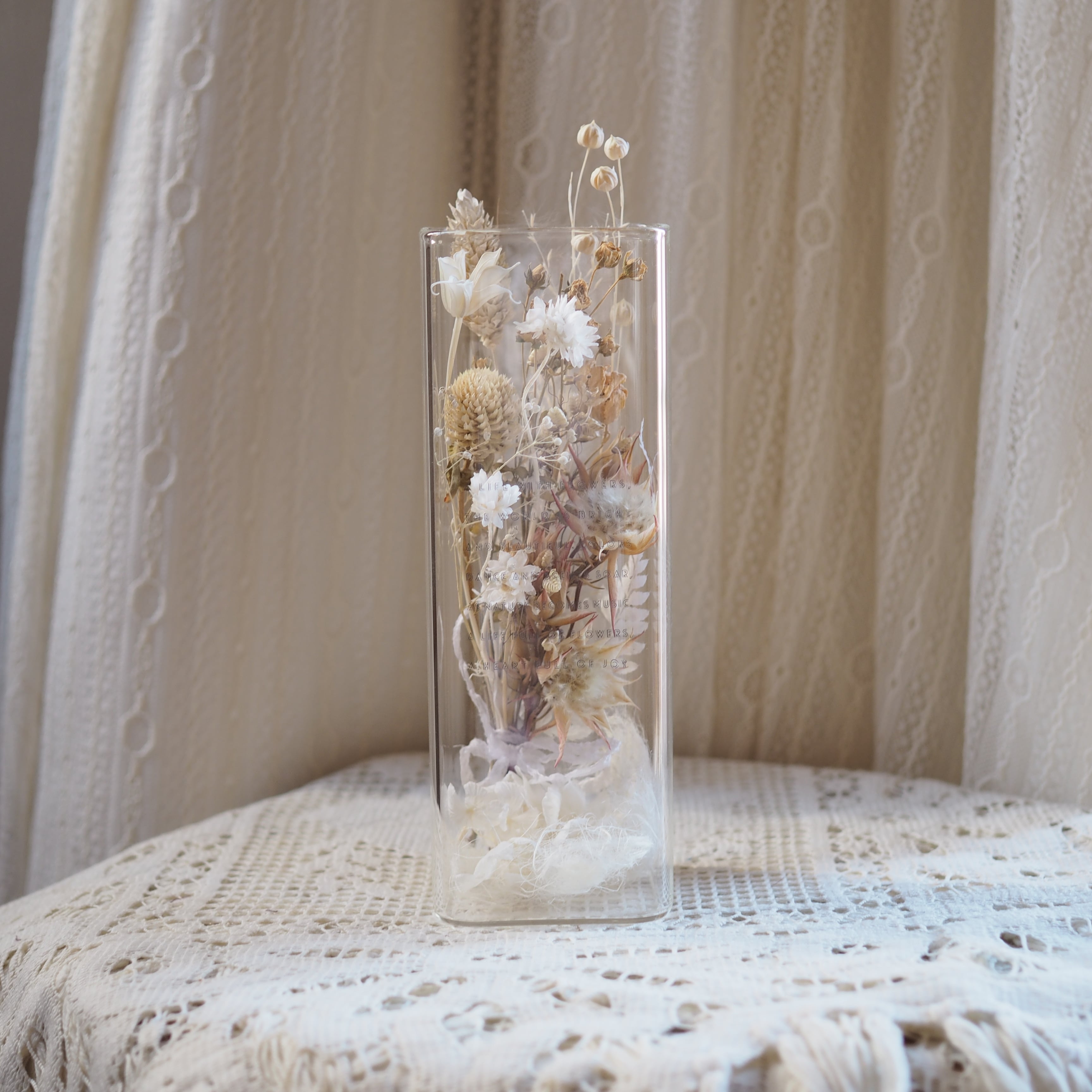 シンプルな形と落ち着いた色合いのドライフラワーを組み合わせ、ナチュラルでおしゃれな雰囲気に仕上げました。