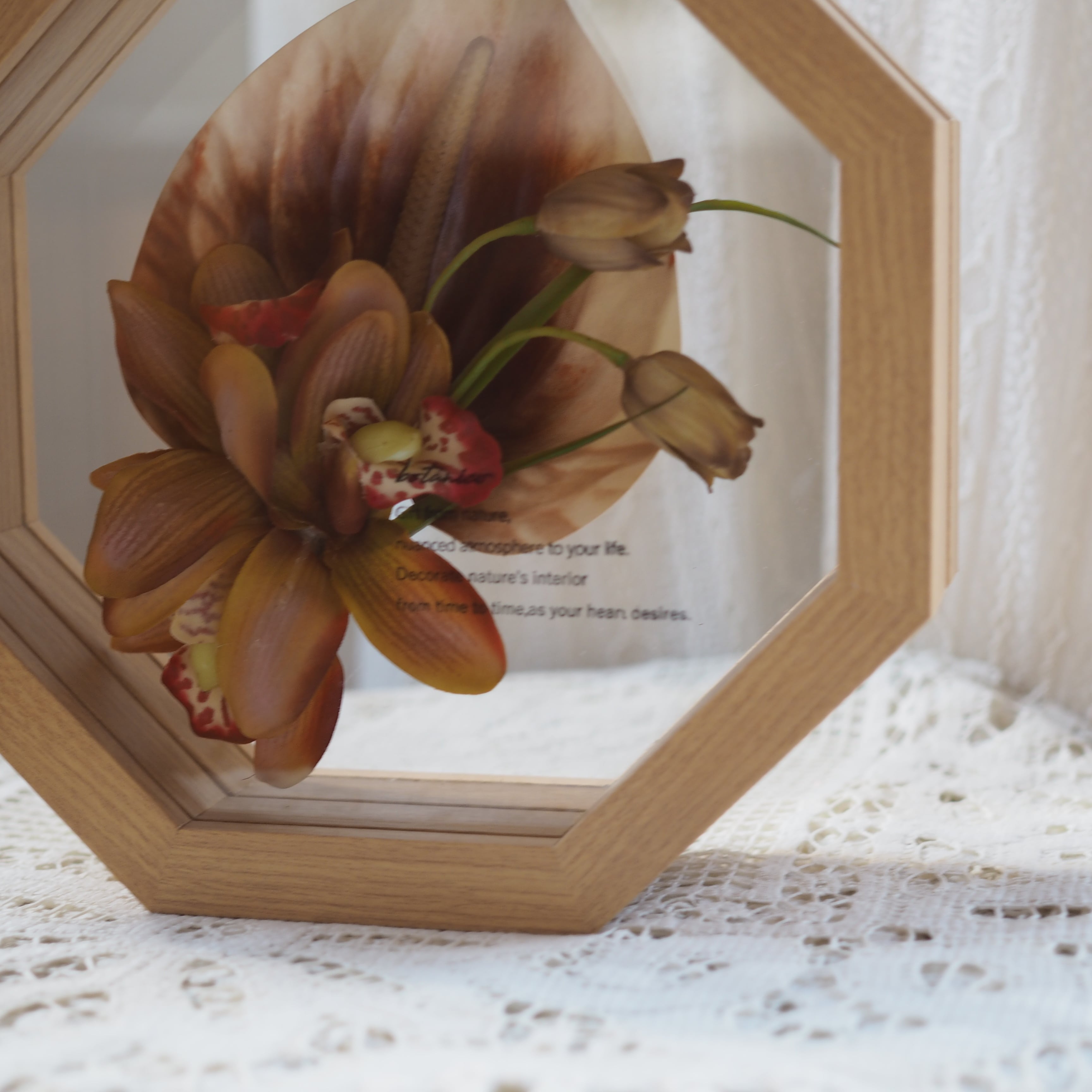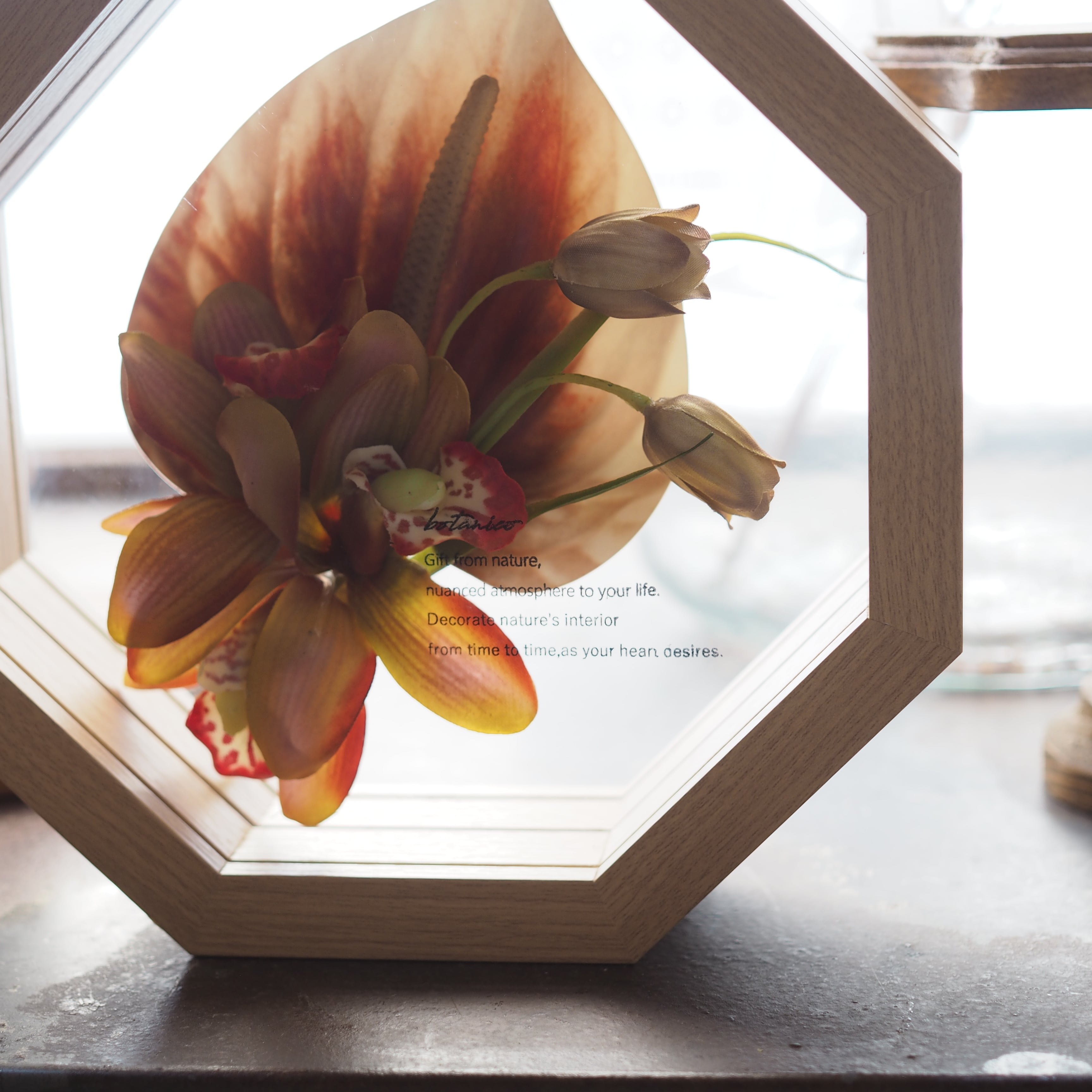 八角形のウッドフレームに、アーティフィシャルフラワーをメインにアレンジしたデザインです。