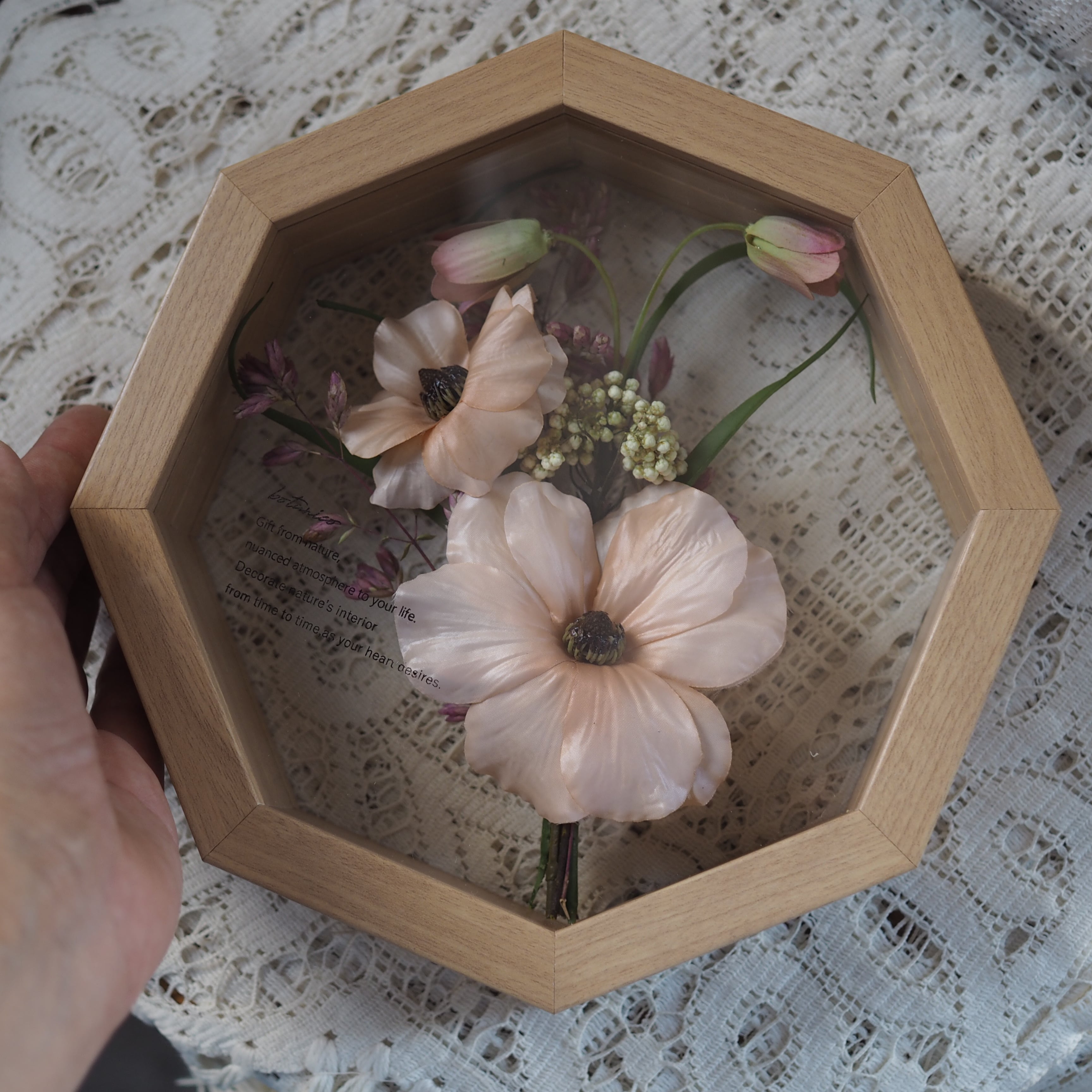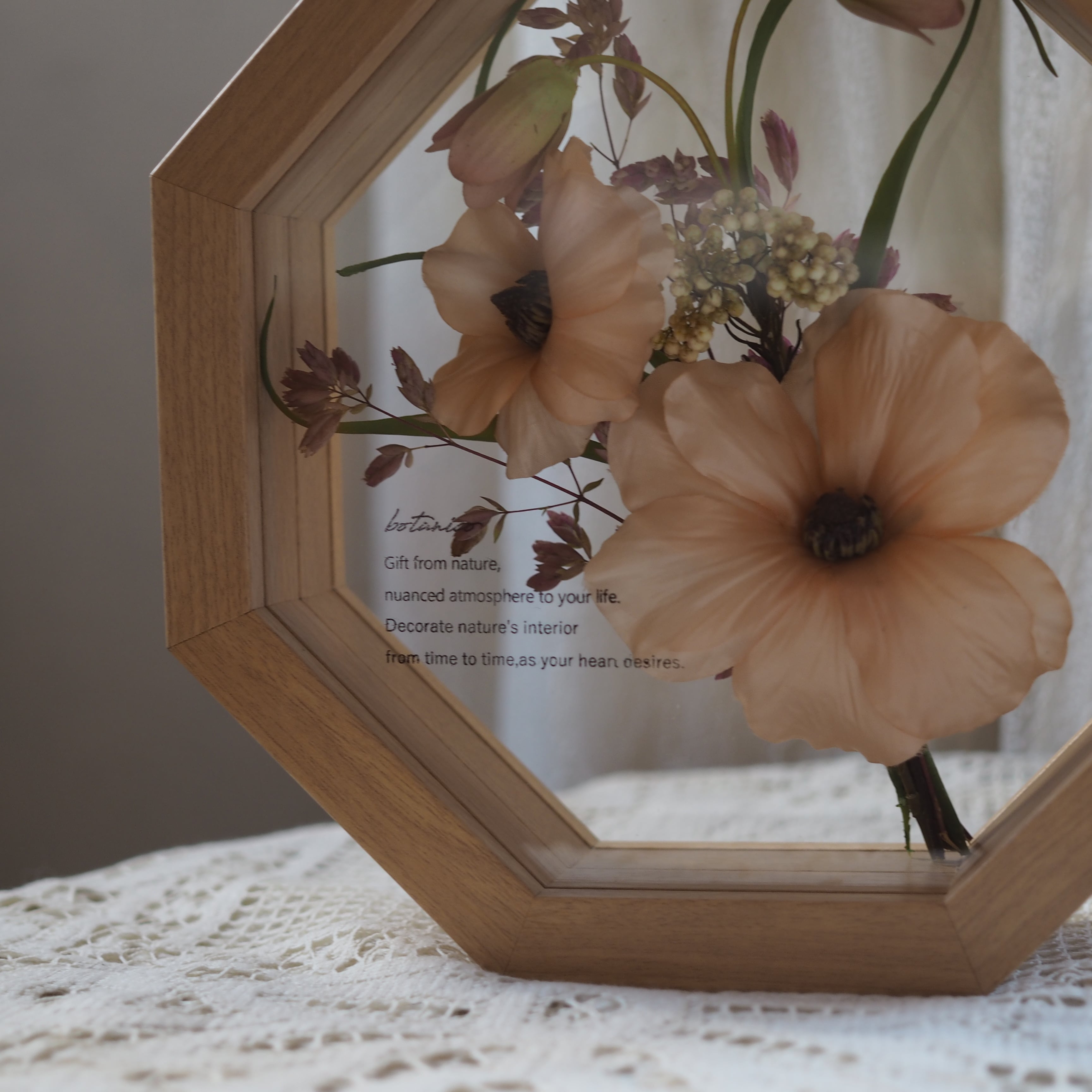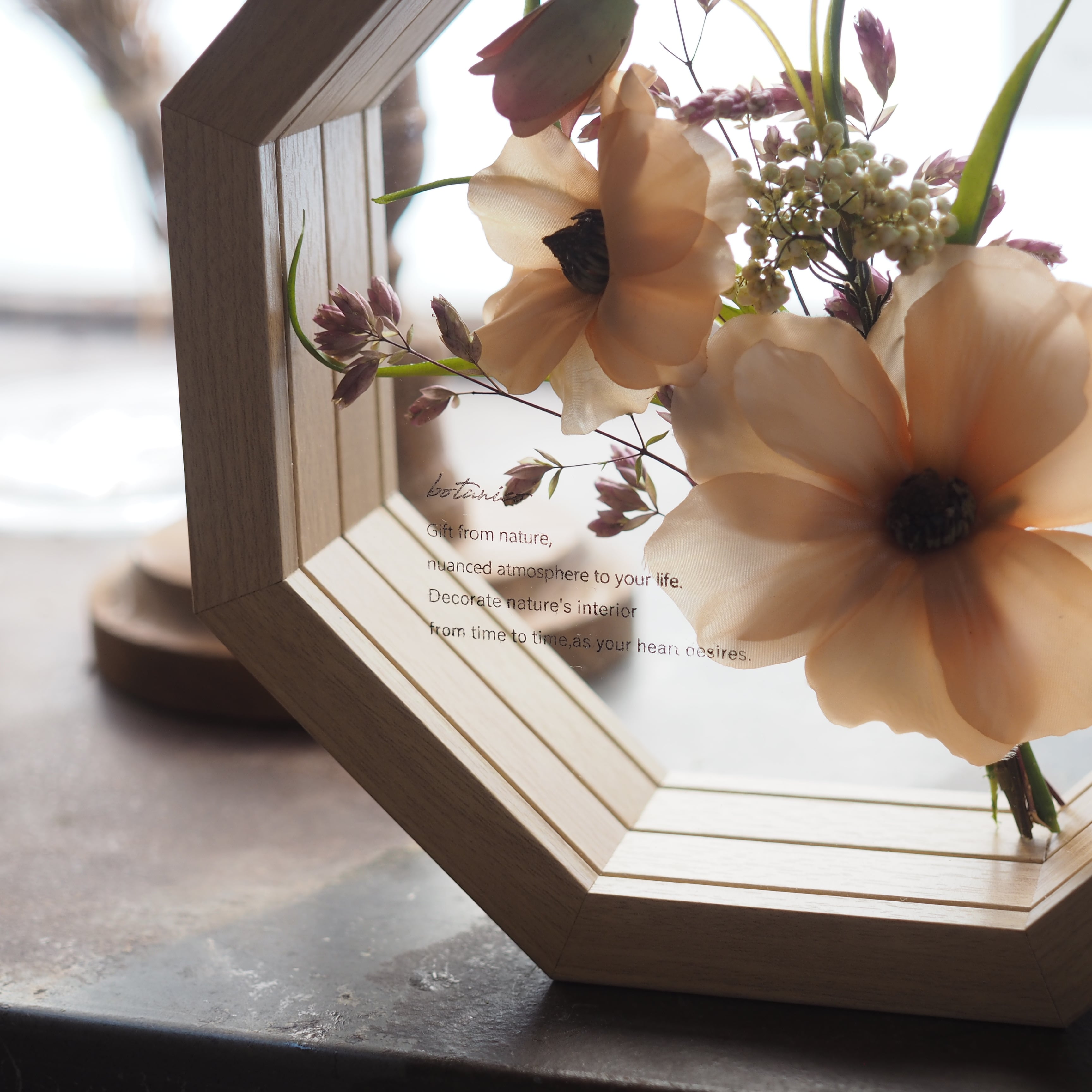 八角形のウッドフレームに、アーティフィシャルフラワーをメインにアレンジしたデザインです。