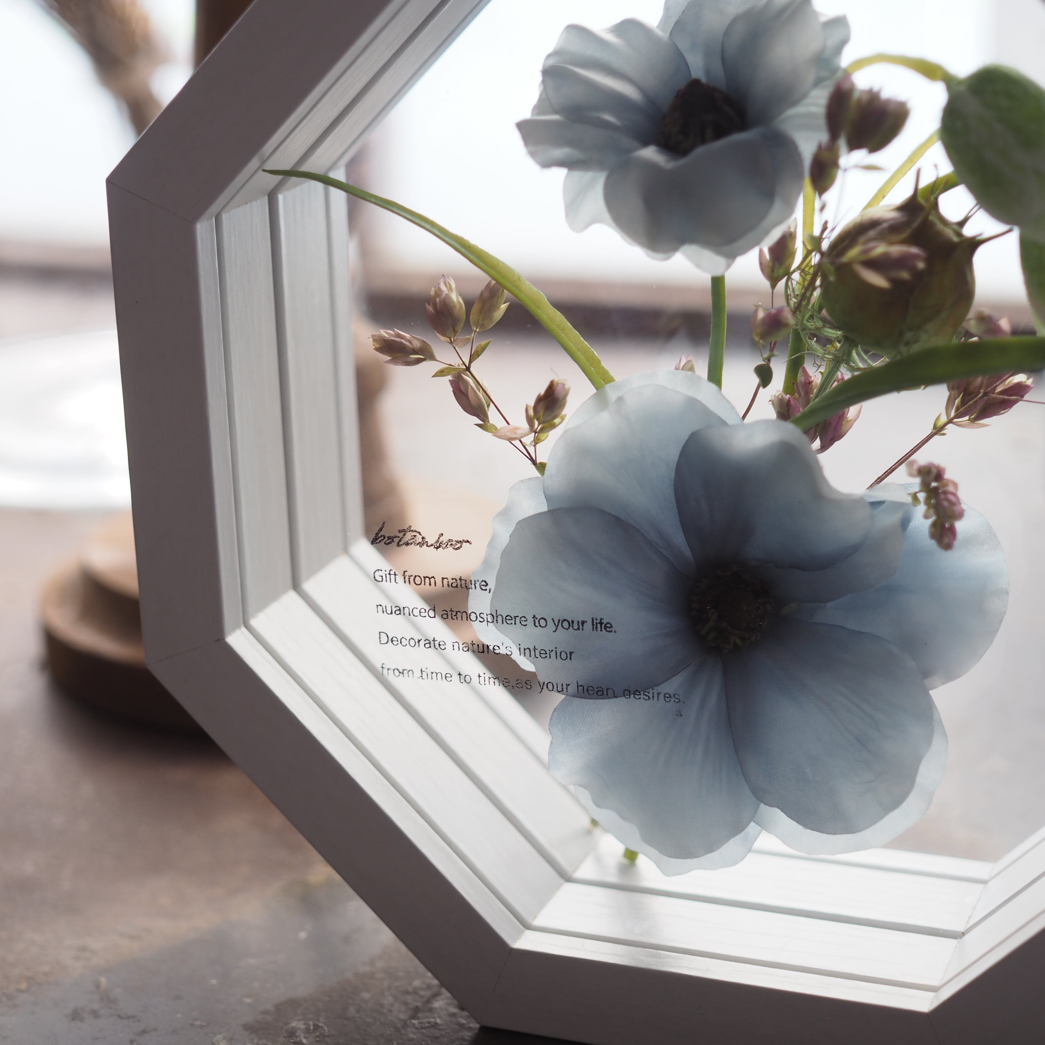 八角形のウッドフレームに、アーティフィシャルフラワーをメインにアレンジしたデザインです。