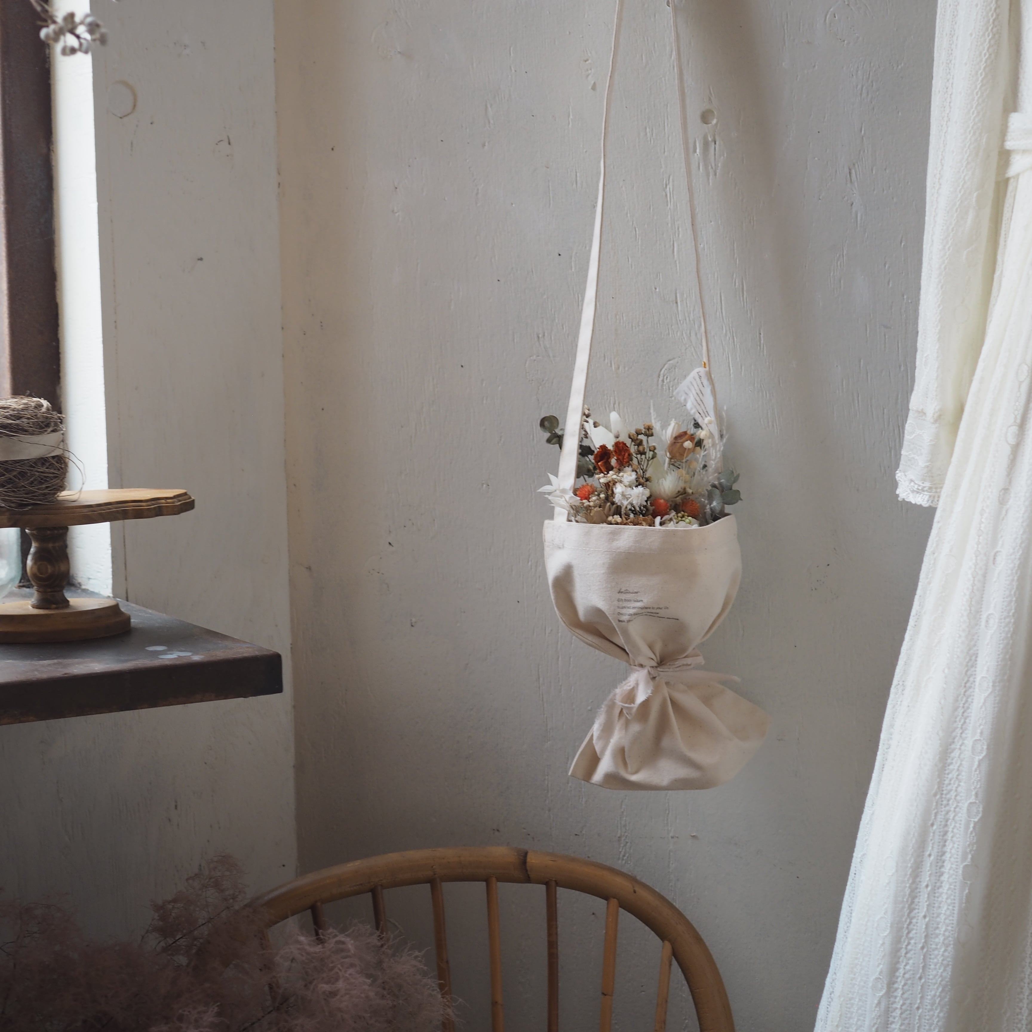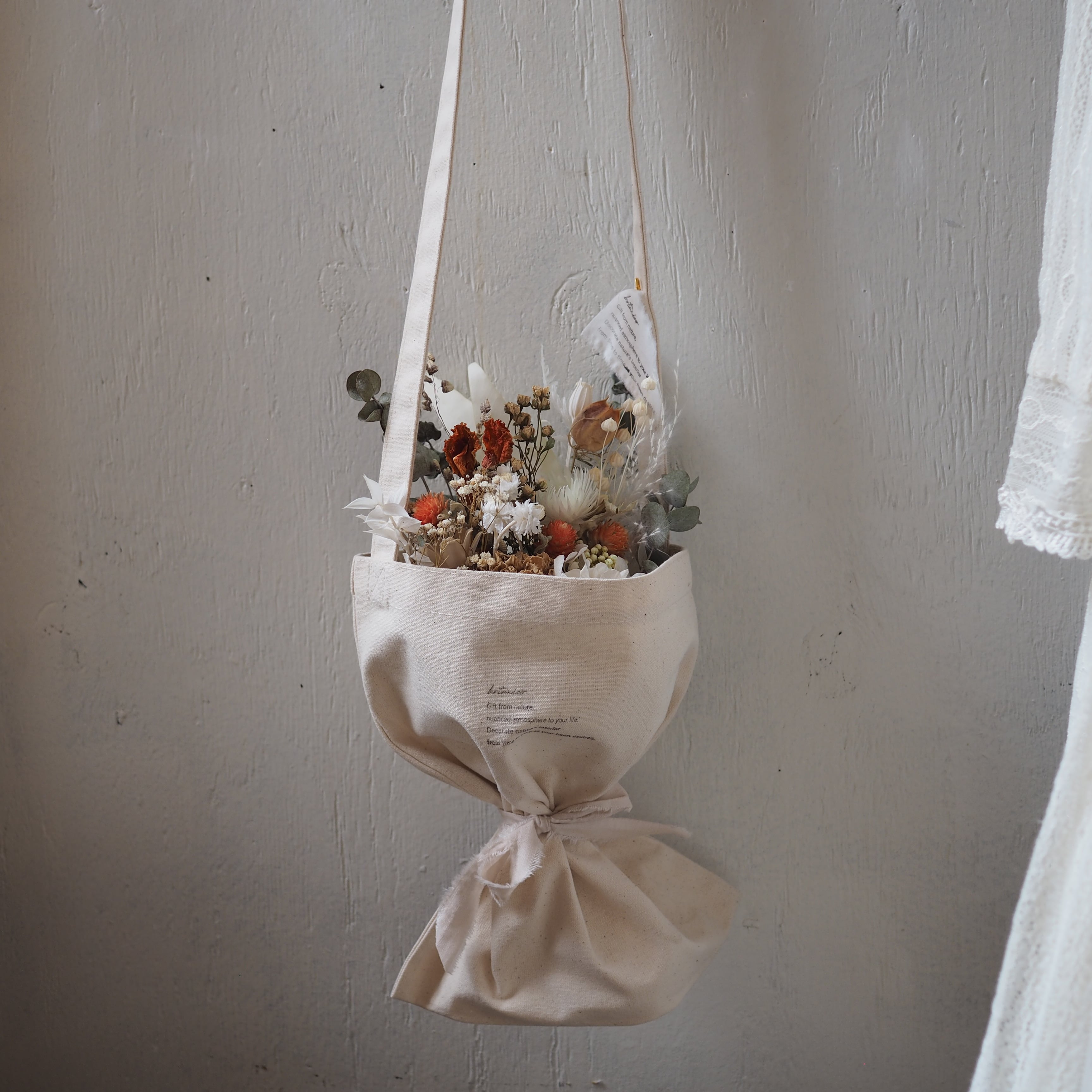 可愛いドライフラワーのブーケをポシェットにinして、ポシェットタイプの花束にしました。