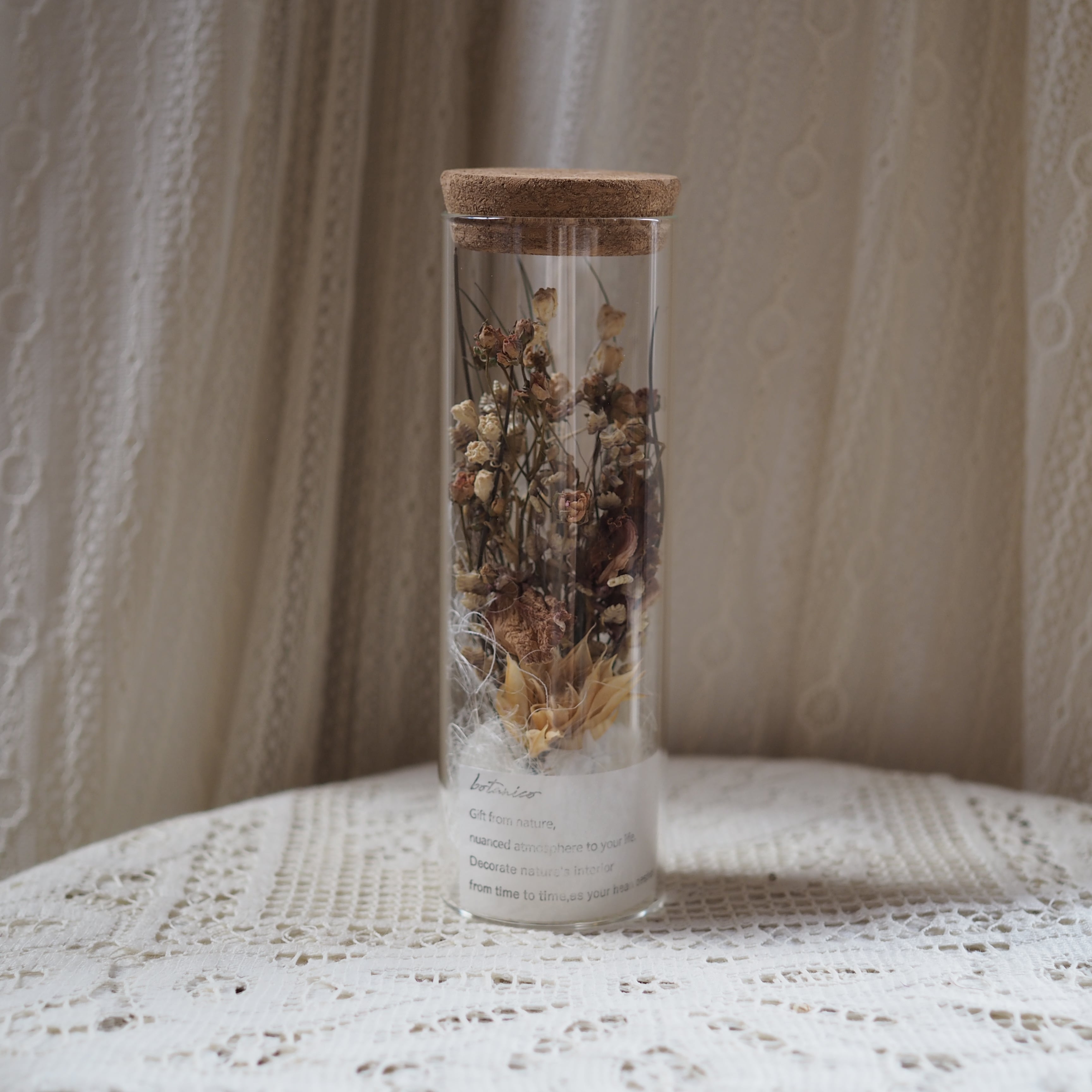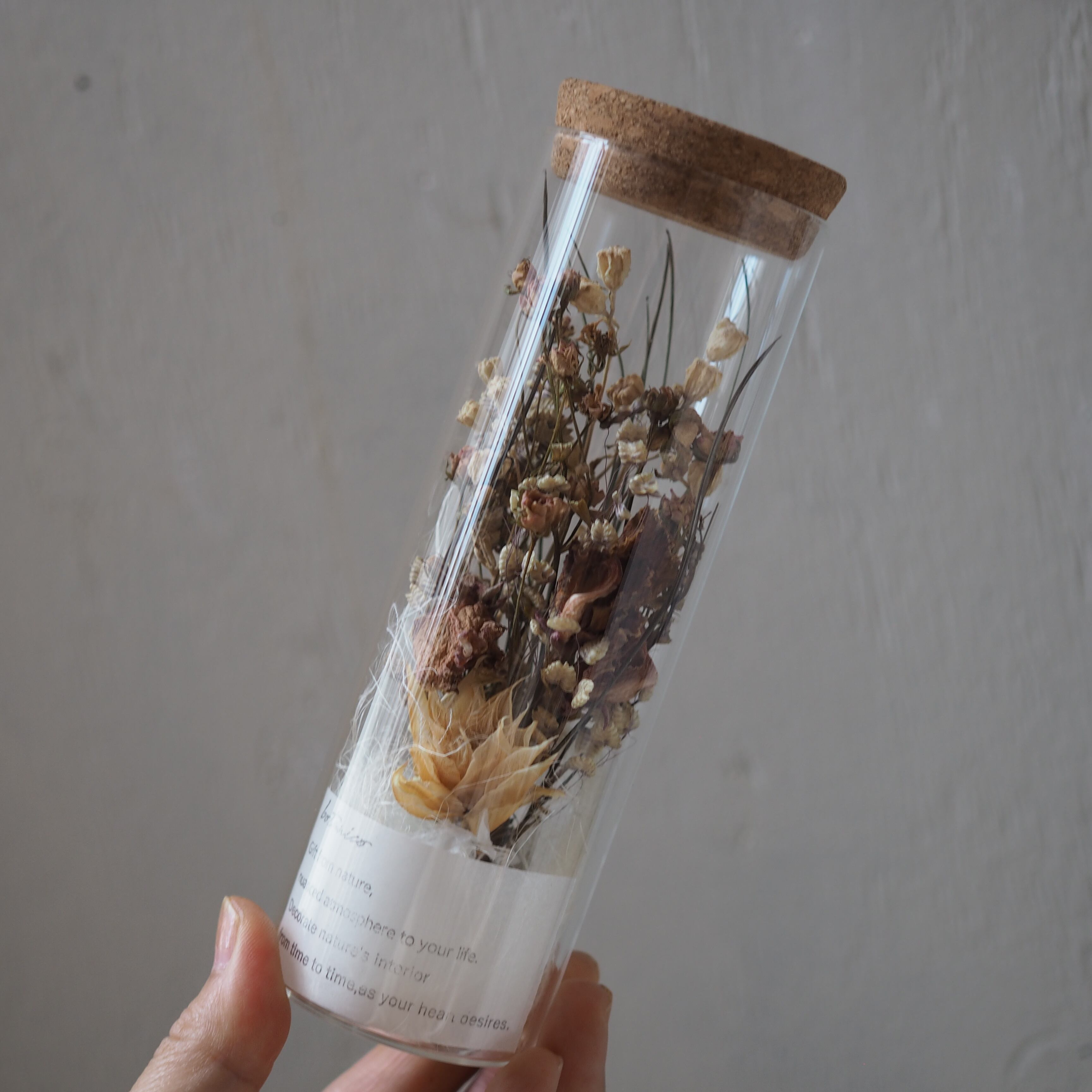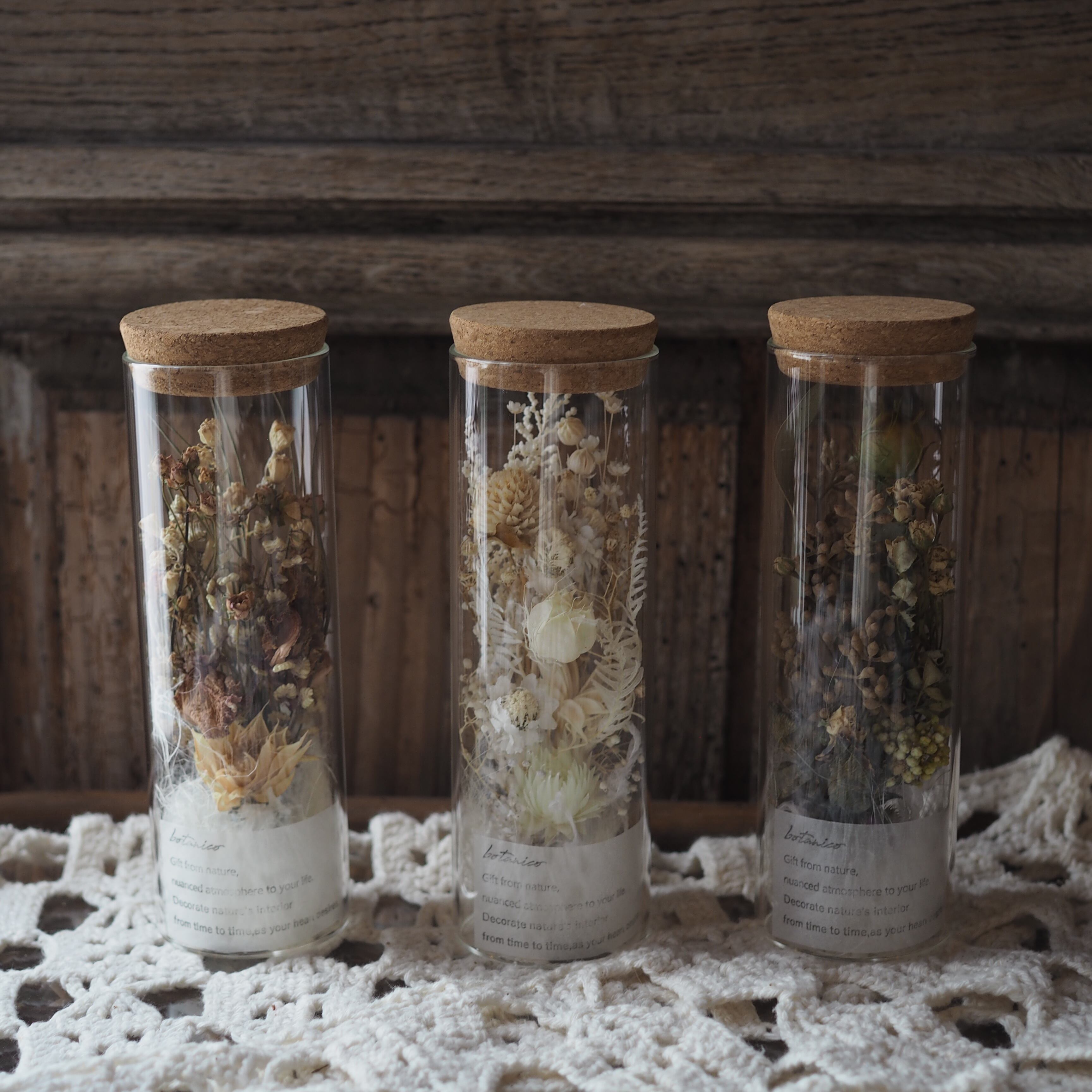 すらりとしたボトルの中に、繊細なドライフラワーを束ねました。