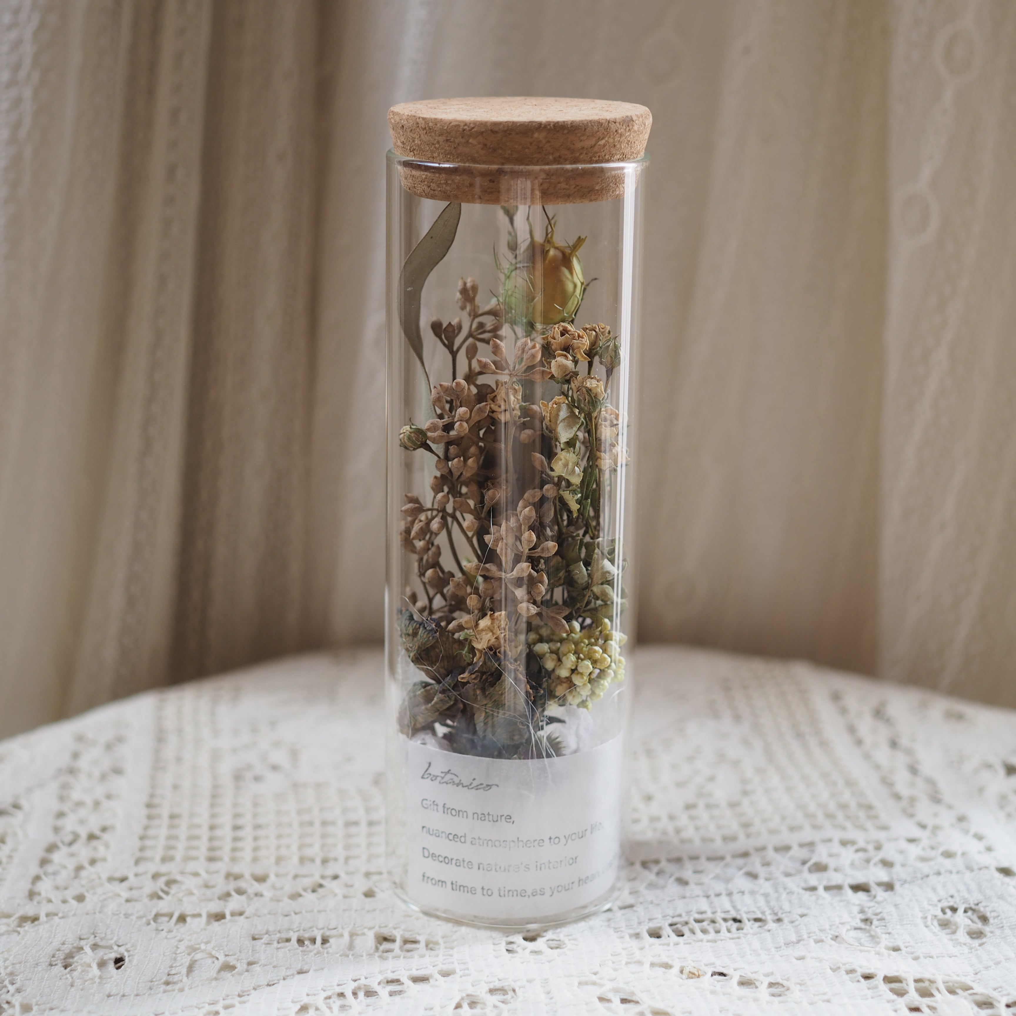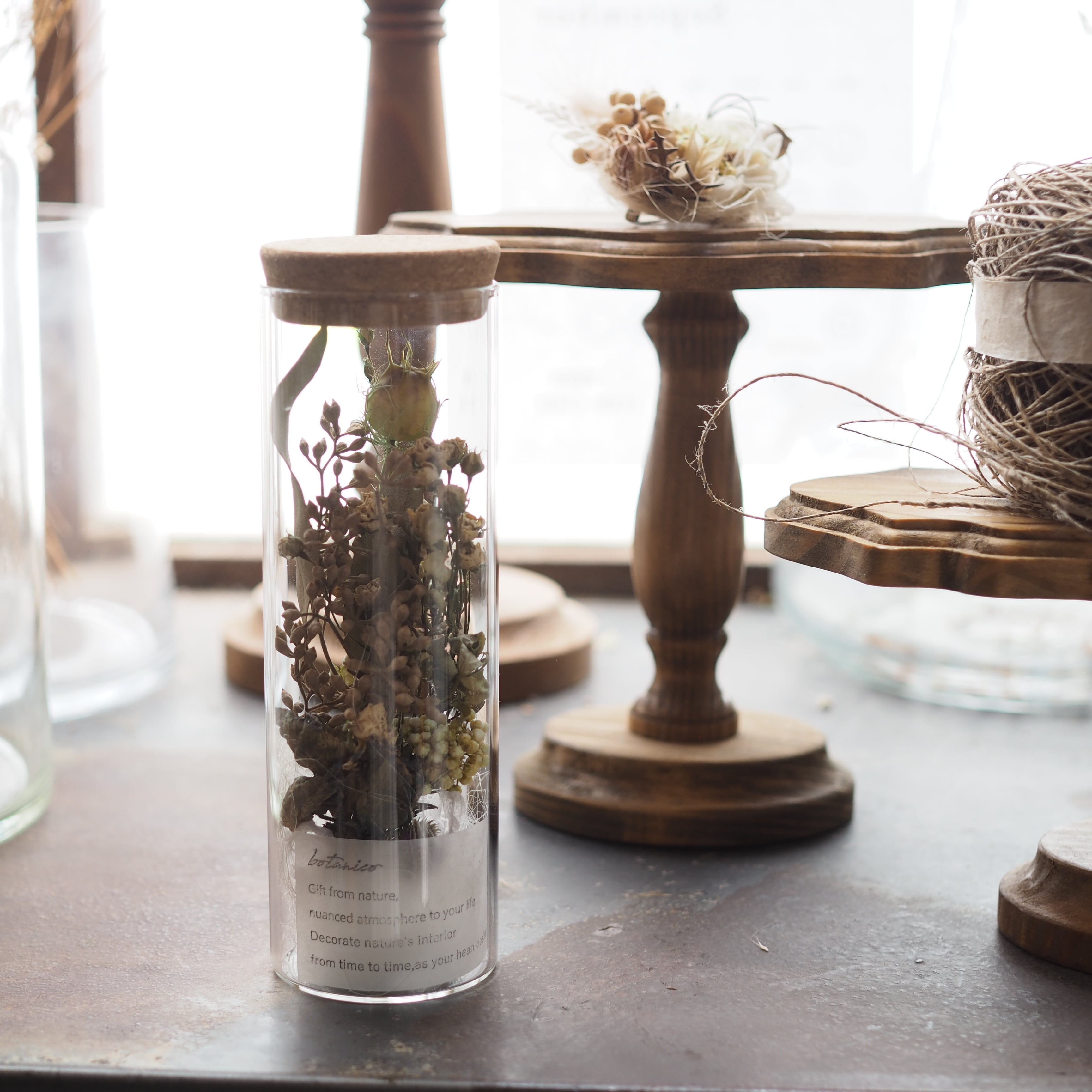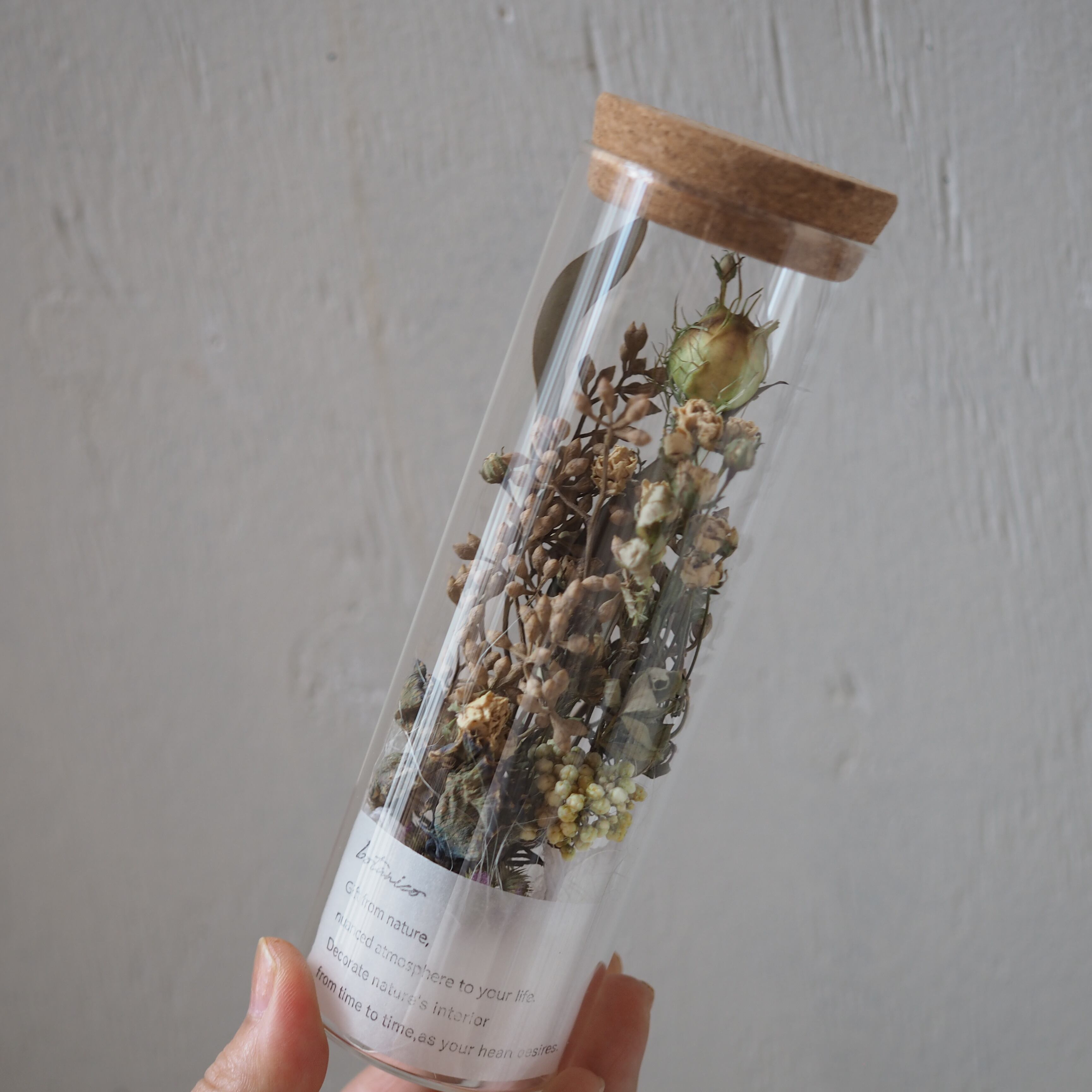 すらりとしたボトルの中に、繊細なドライフラワーを束ねました。