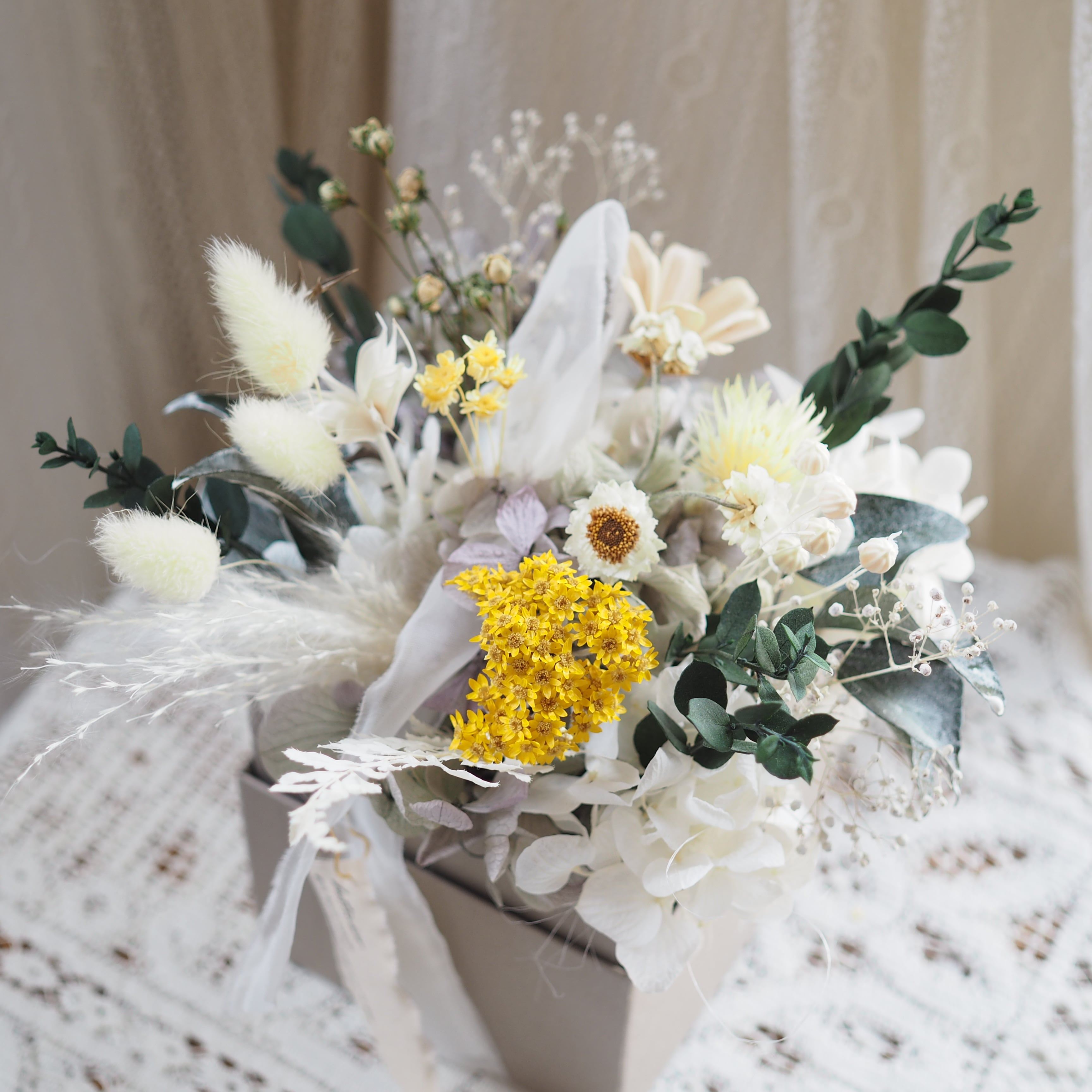 上質なボックスに贅沢にお花をアレンジして、プレゼントのようにリボンを結びました。