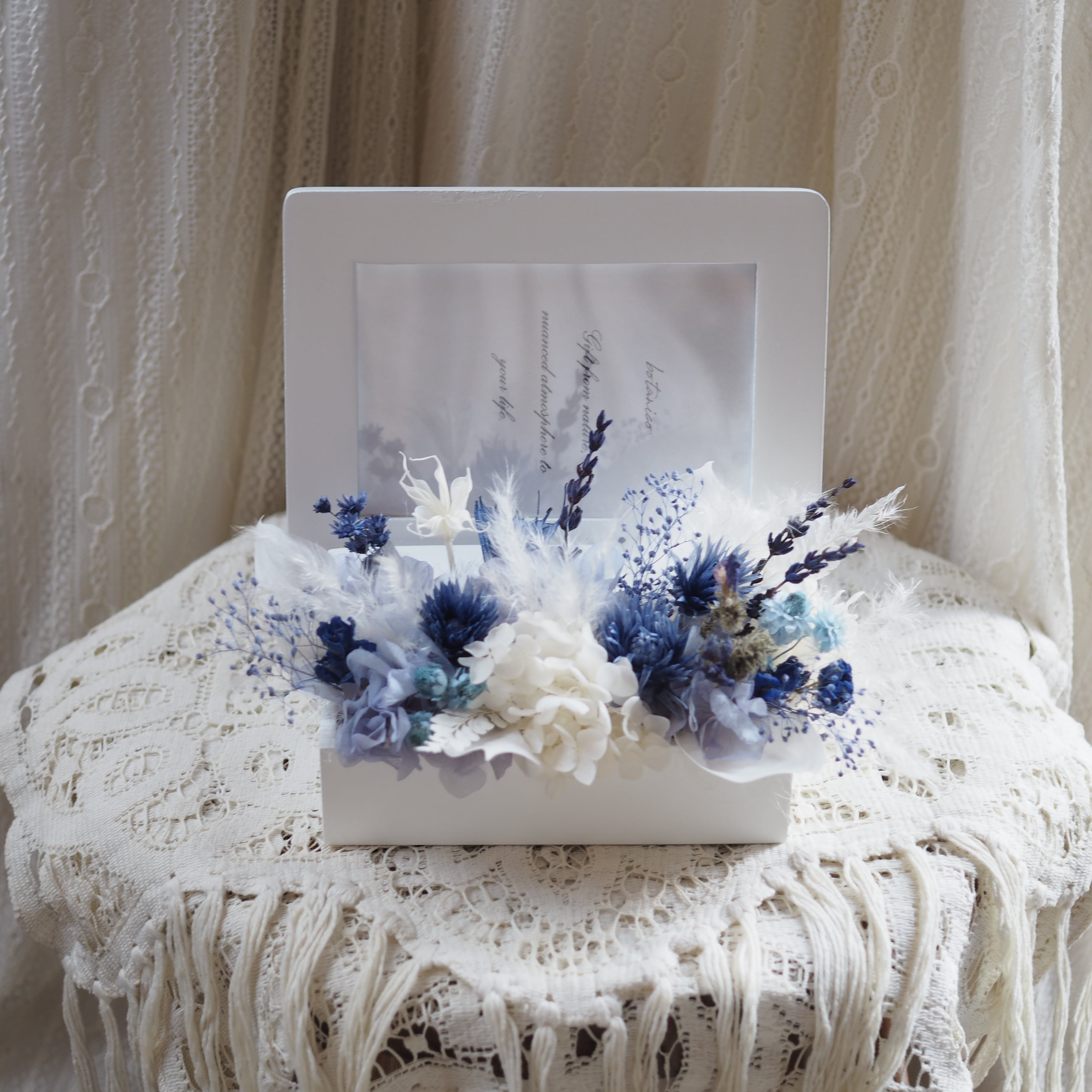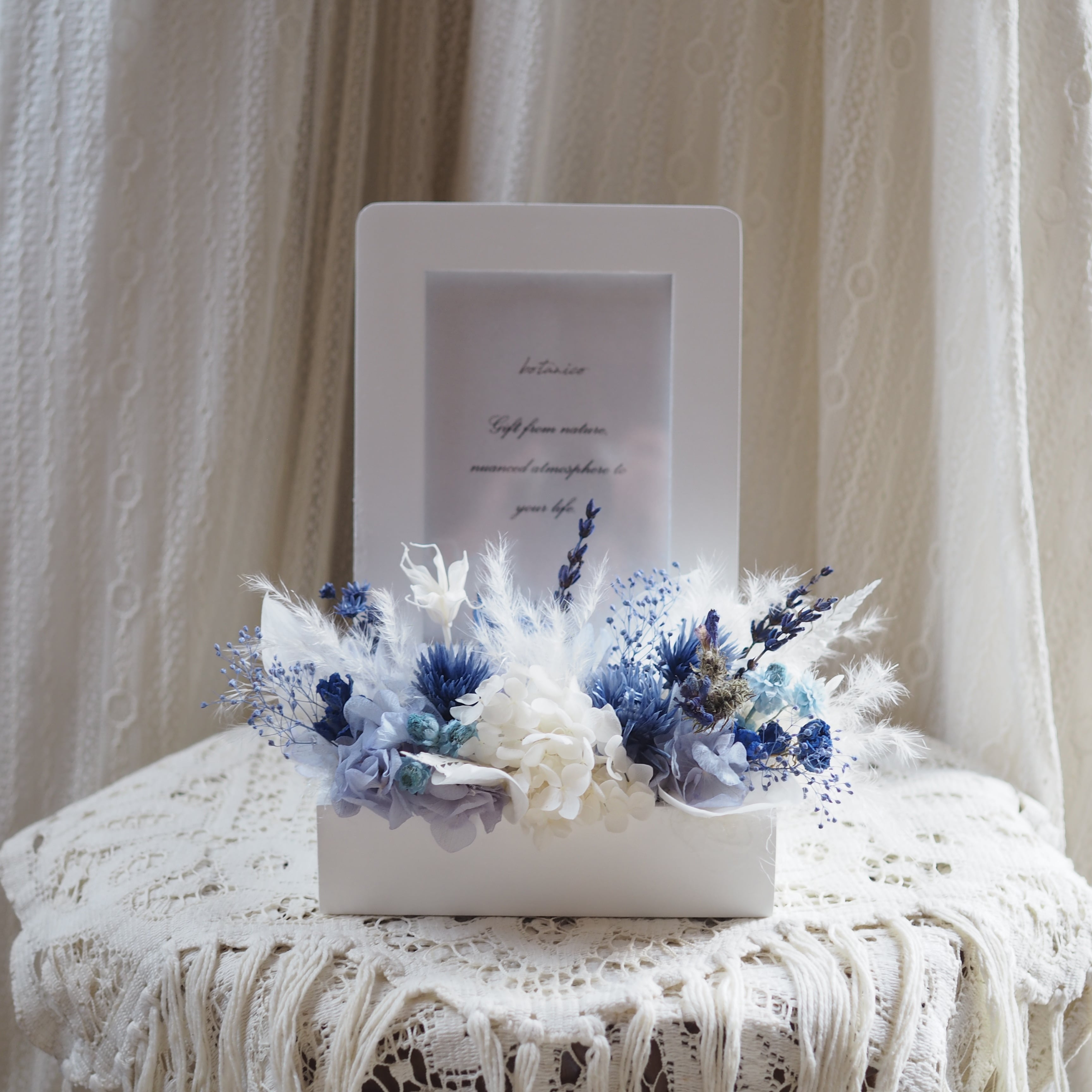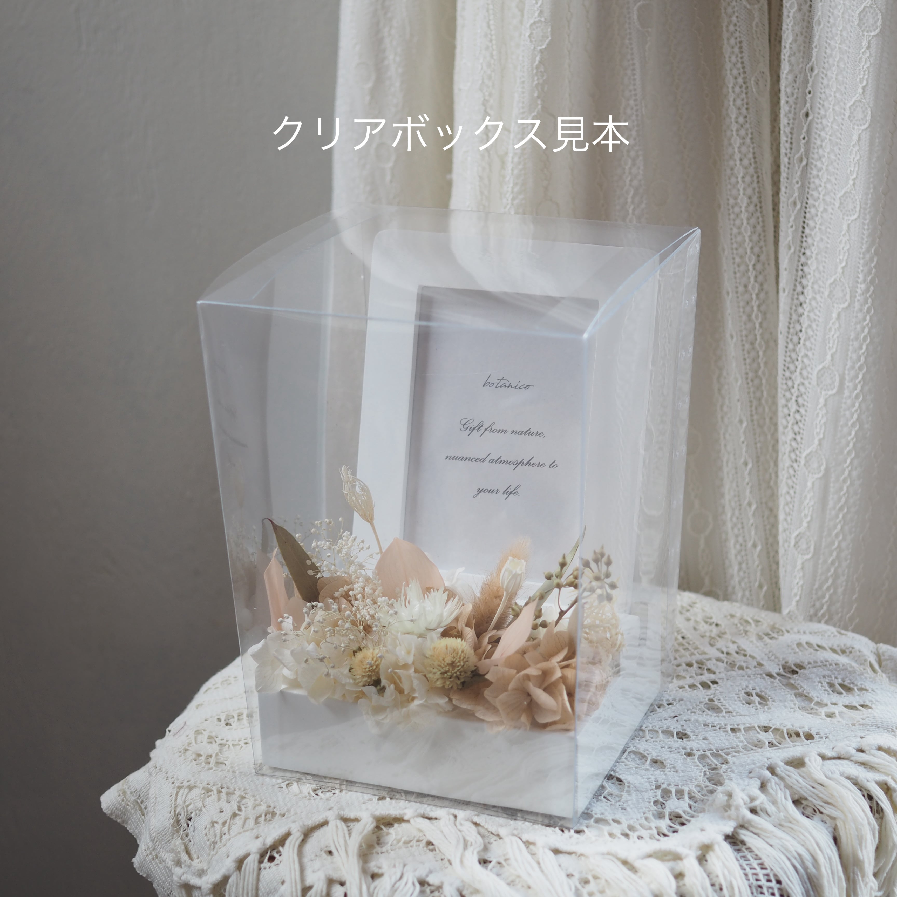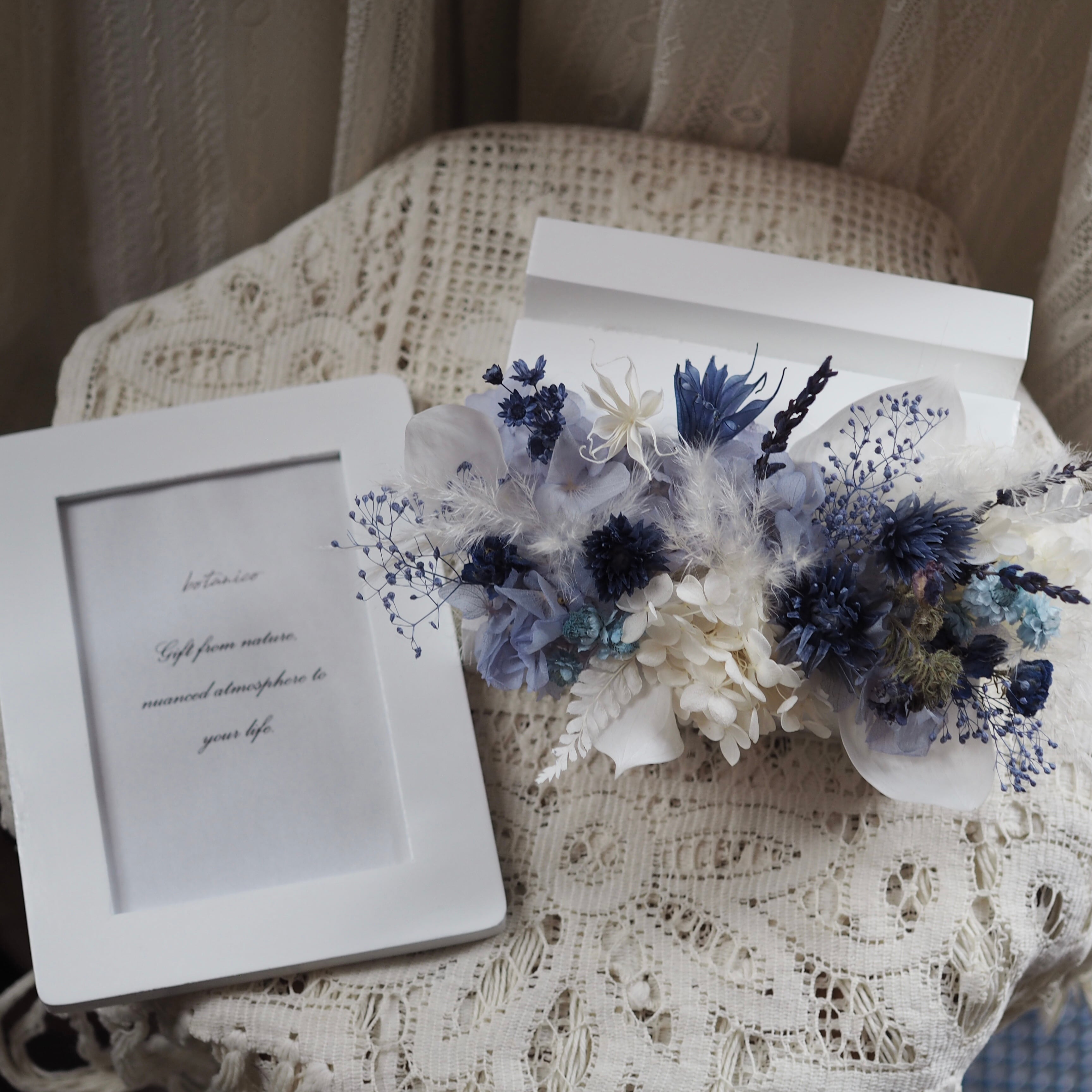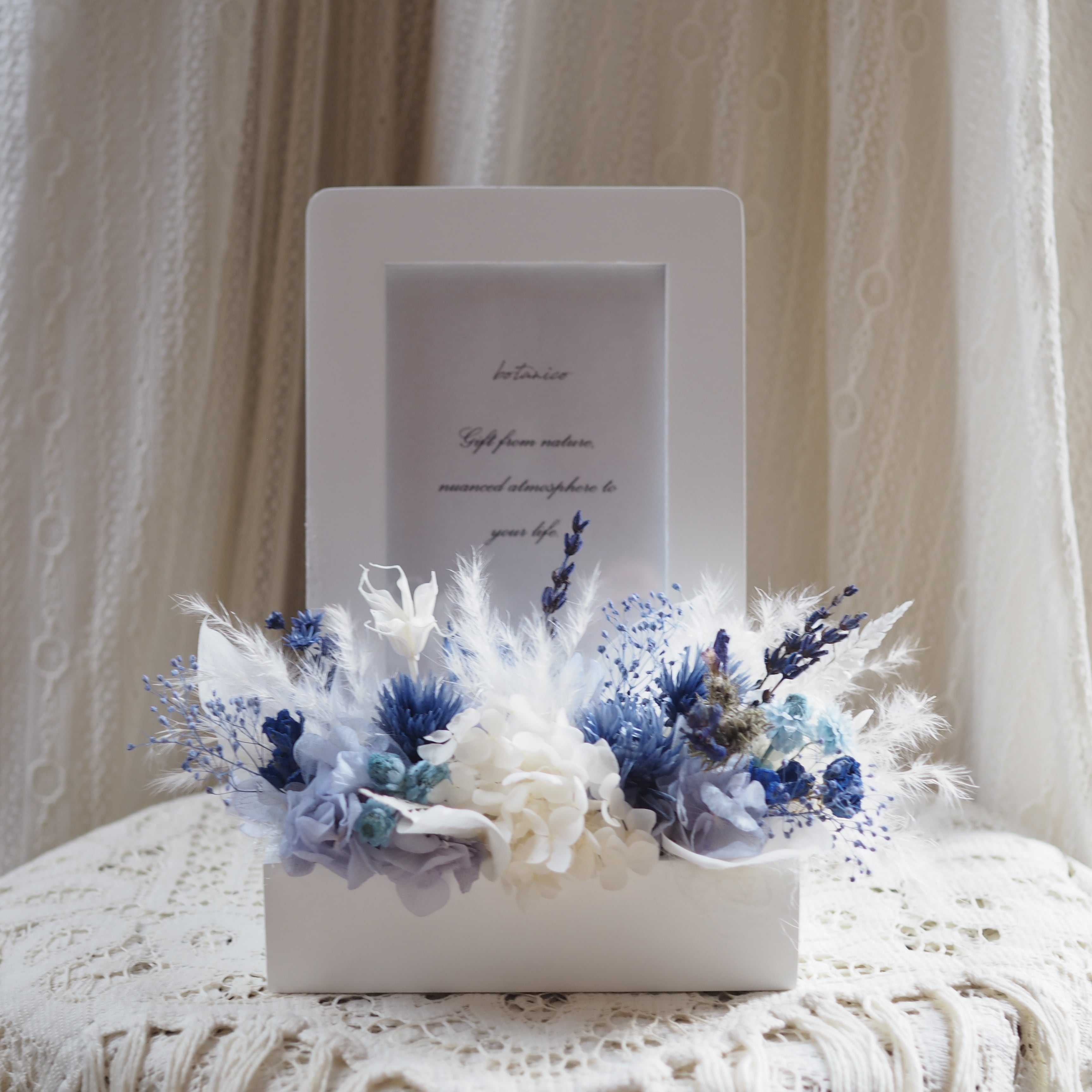 柔らかな色合いのプリザーブドフラワーやドライフラワーを贅沢にあしらった、ナチュラルテイストのフォトフレームです。