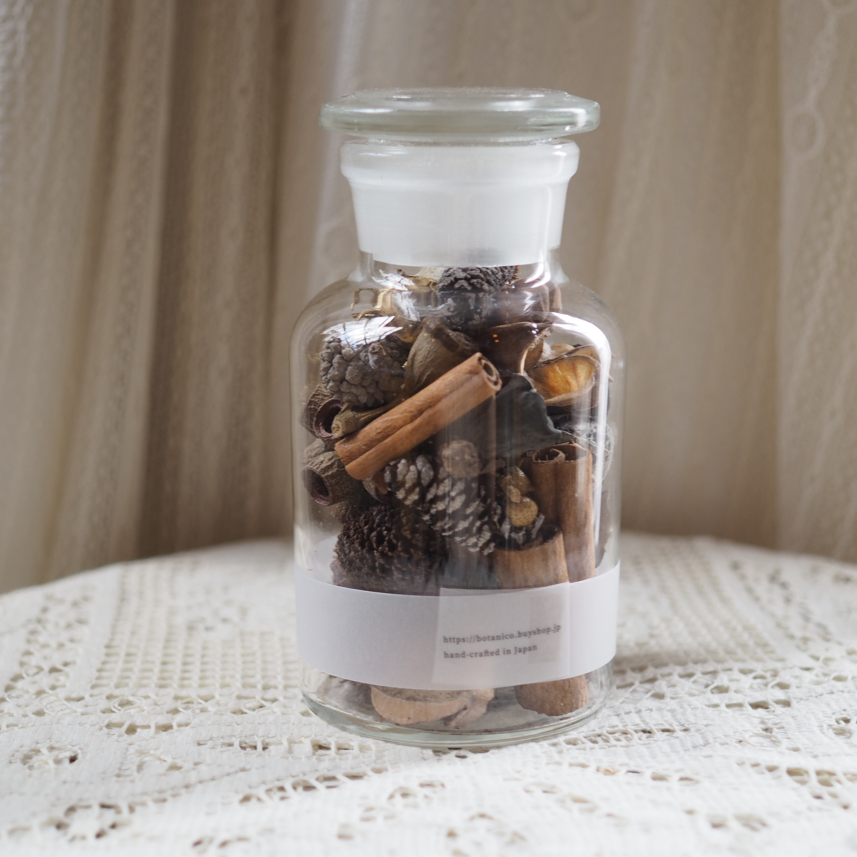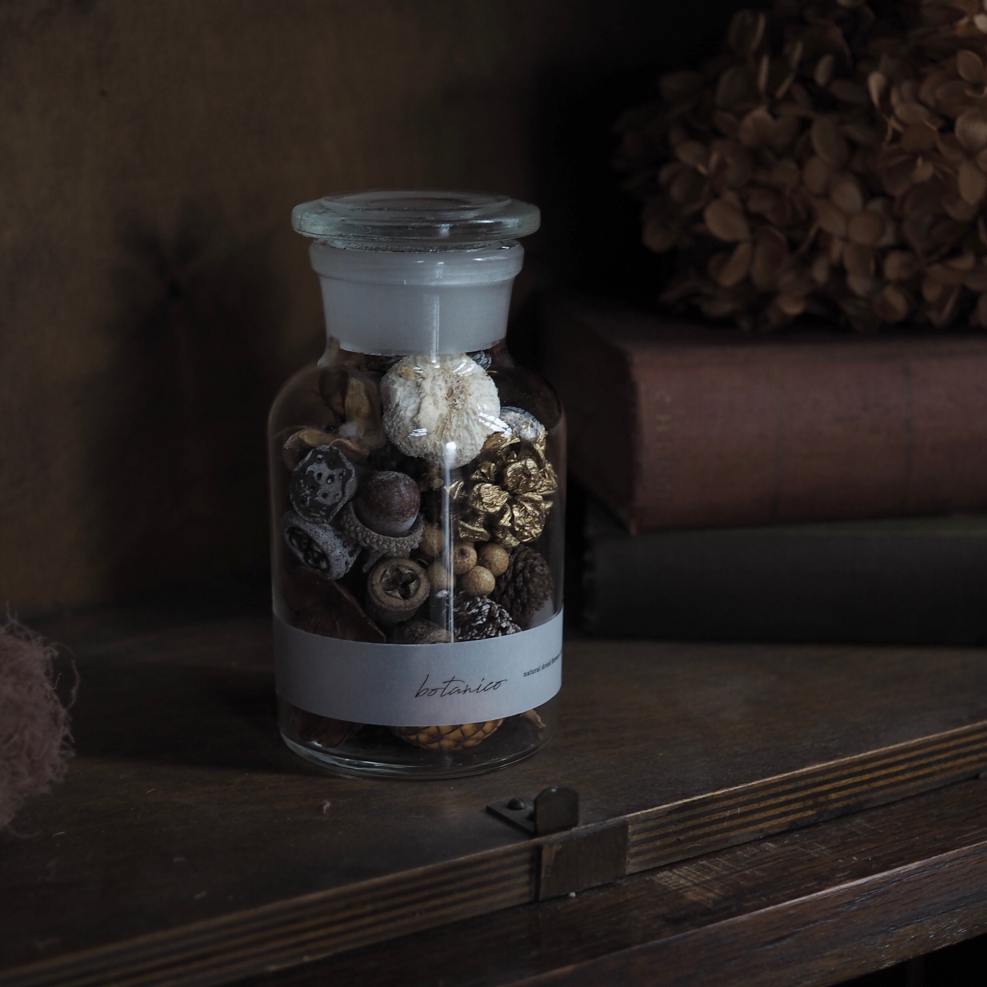 アンティーク調のメディシンボトルに、さまざまな木の実をたっぷりと詰め合わせました。