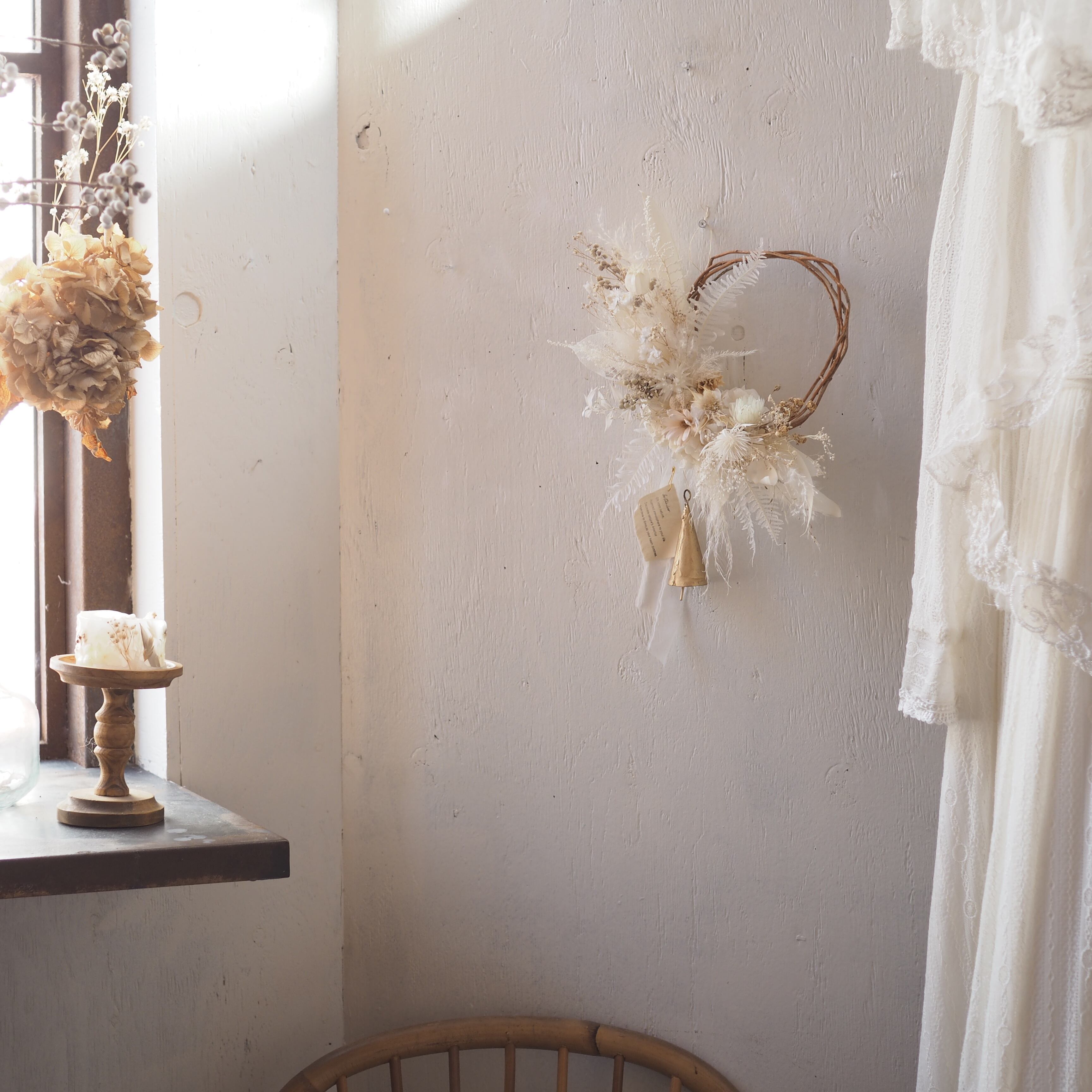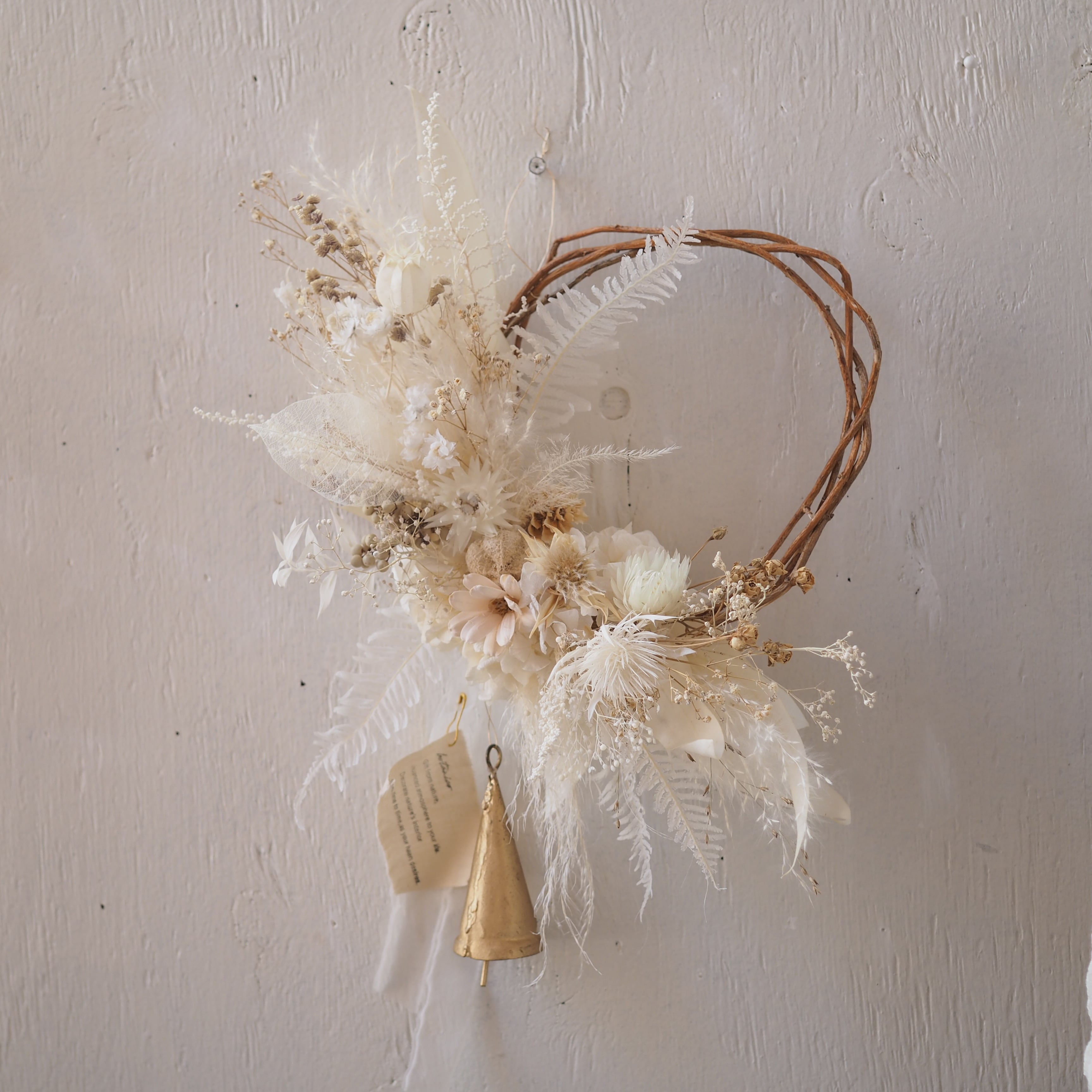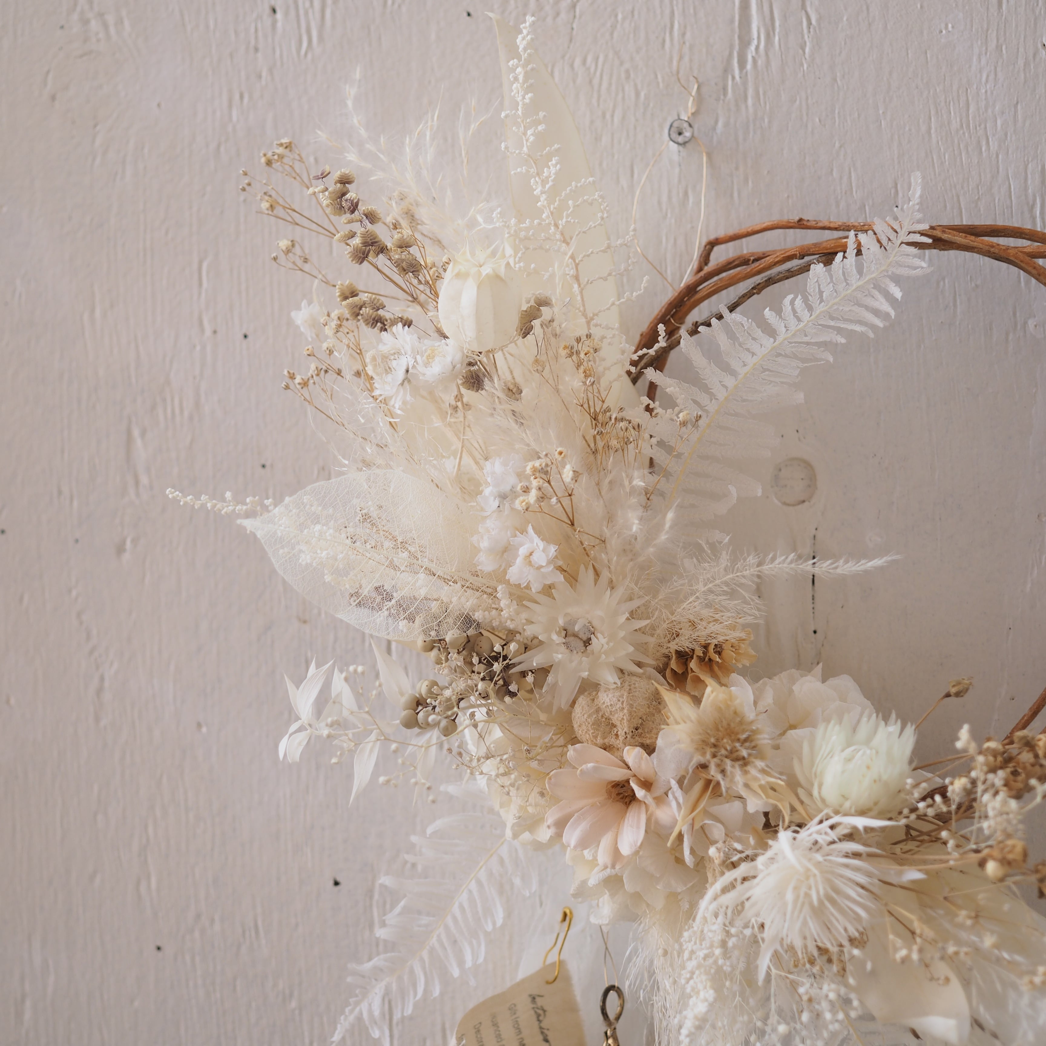 ナチュラルな枝のリースベースに、繊細な花や葉を添えた、ドライフラワーリースです。