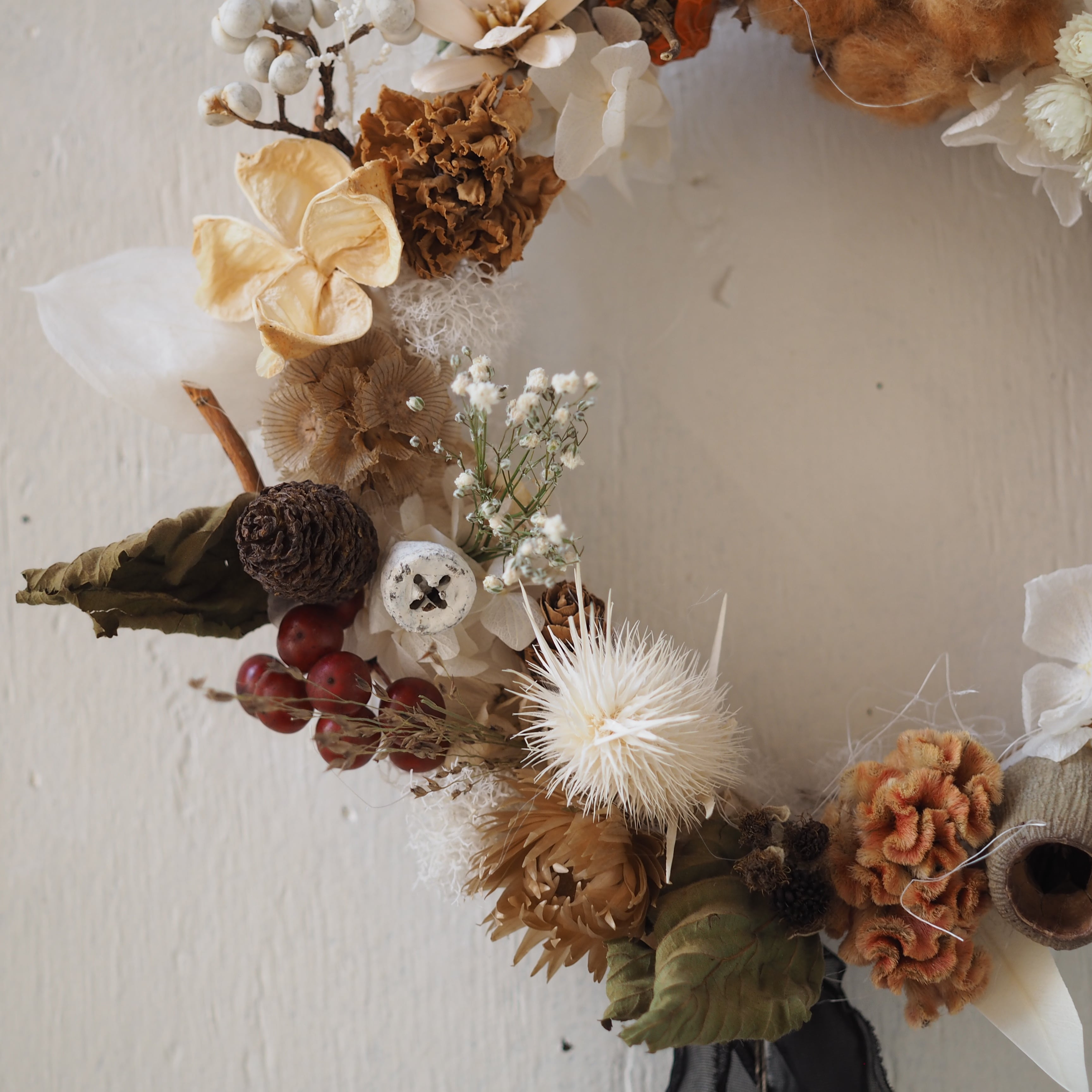 通年を通して飾っていただける落ち着いた彩りで、自然の美しさをそのままに、優しい雰囲気のリースです。