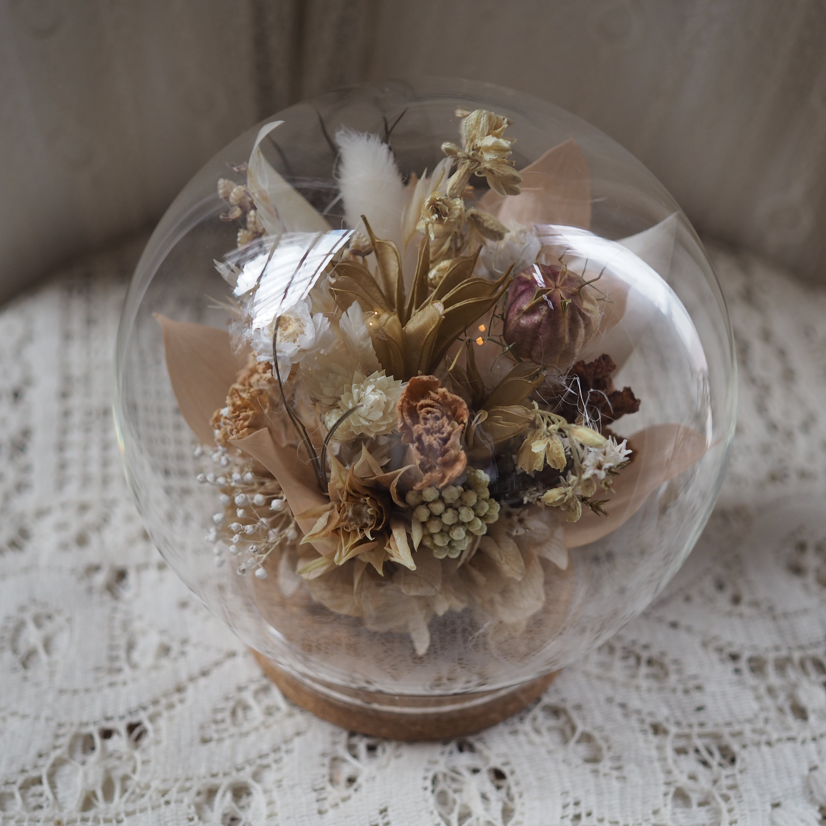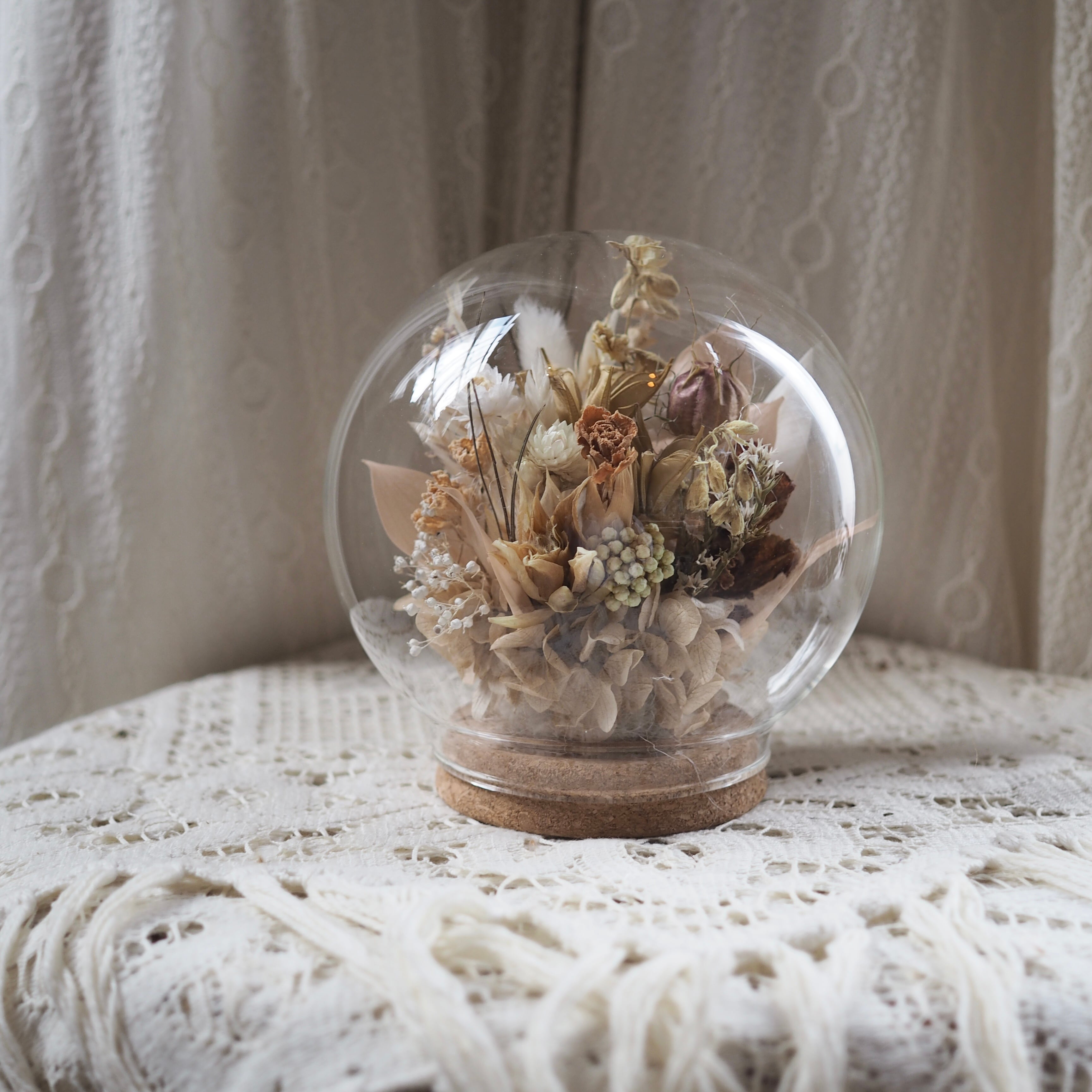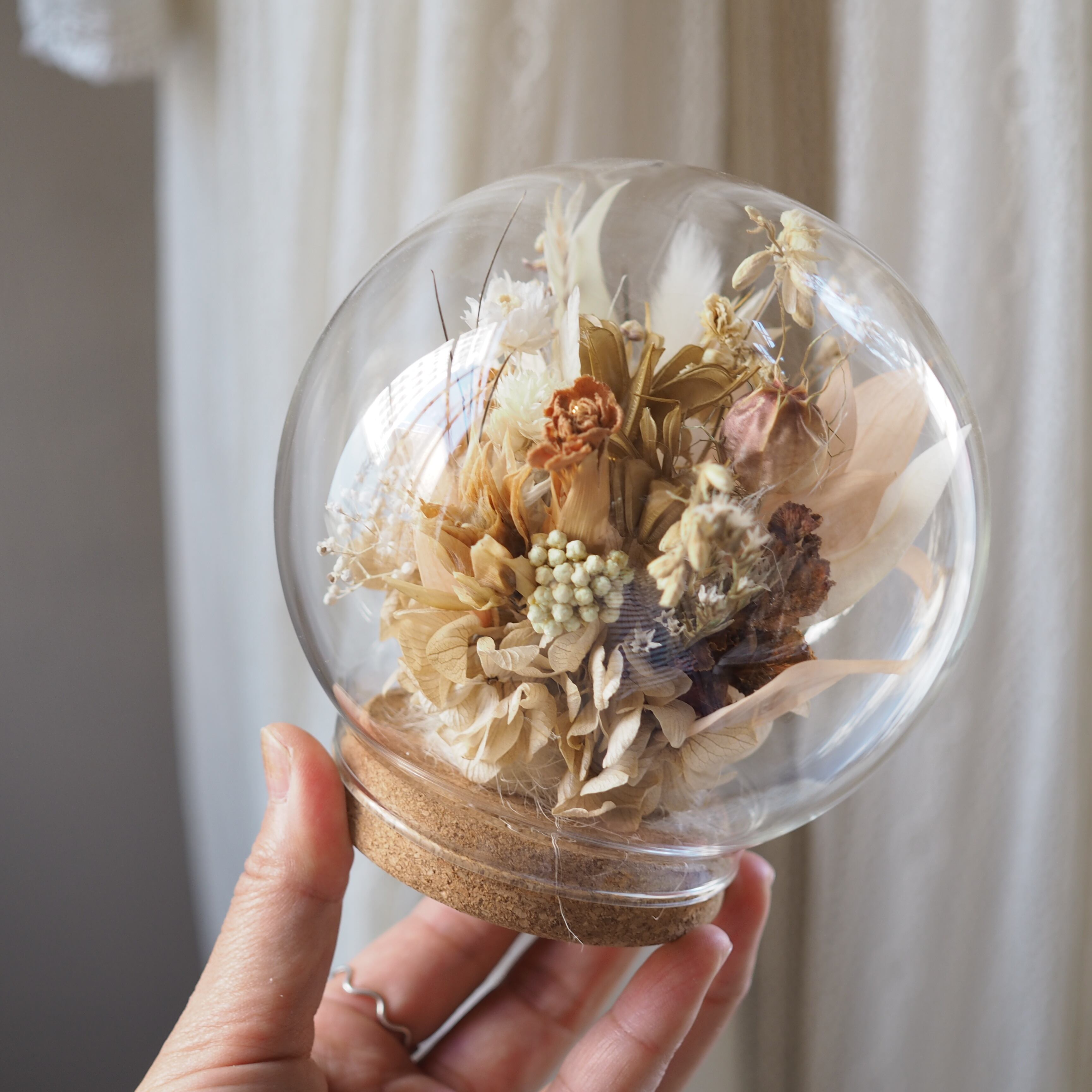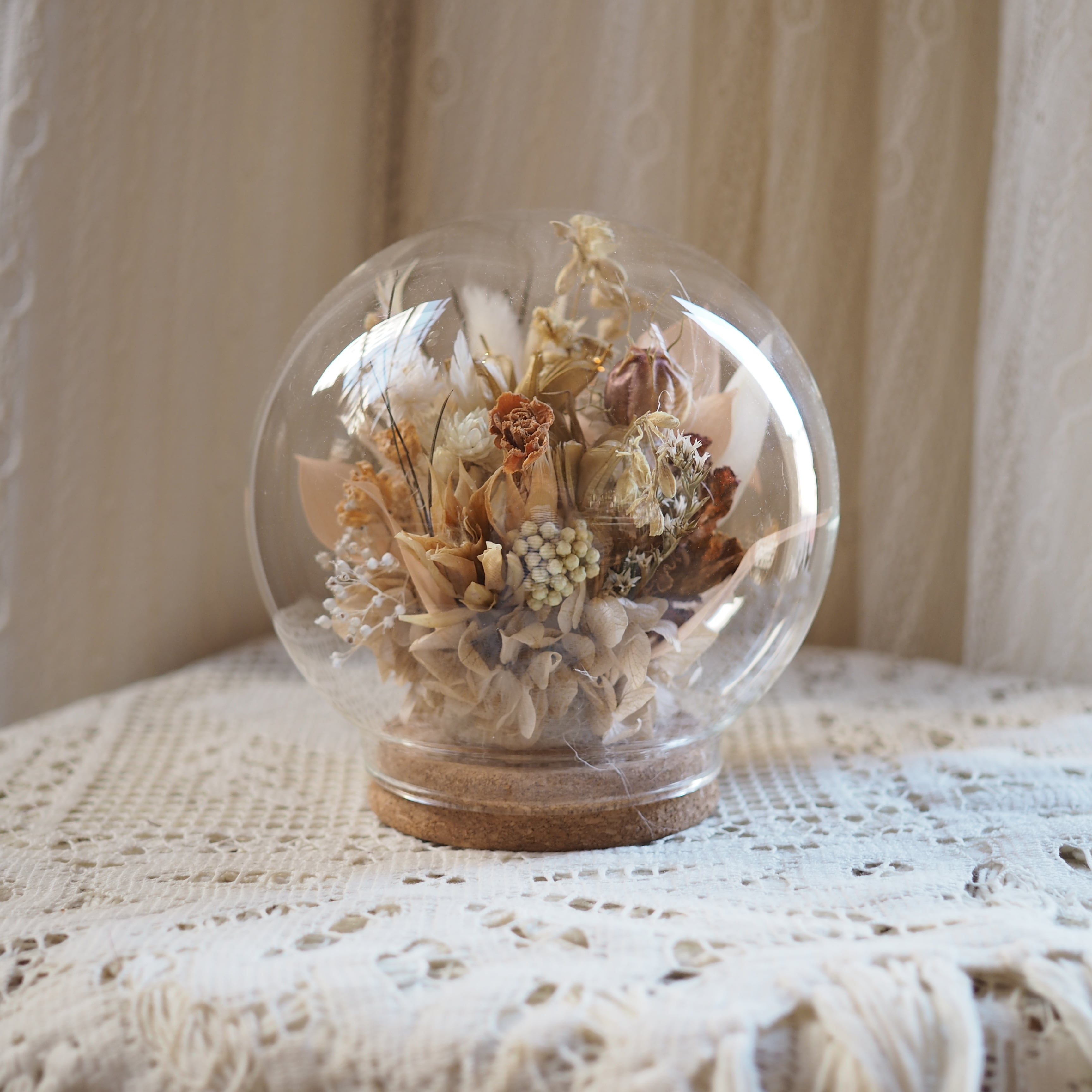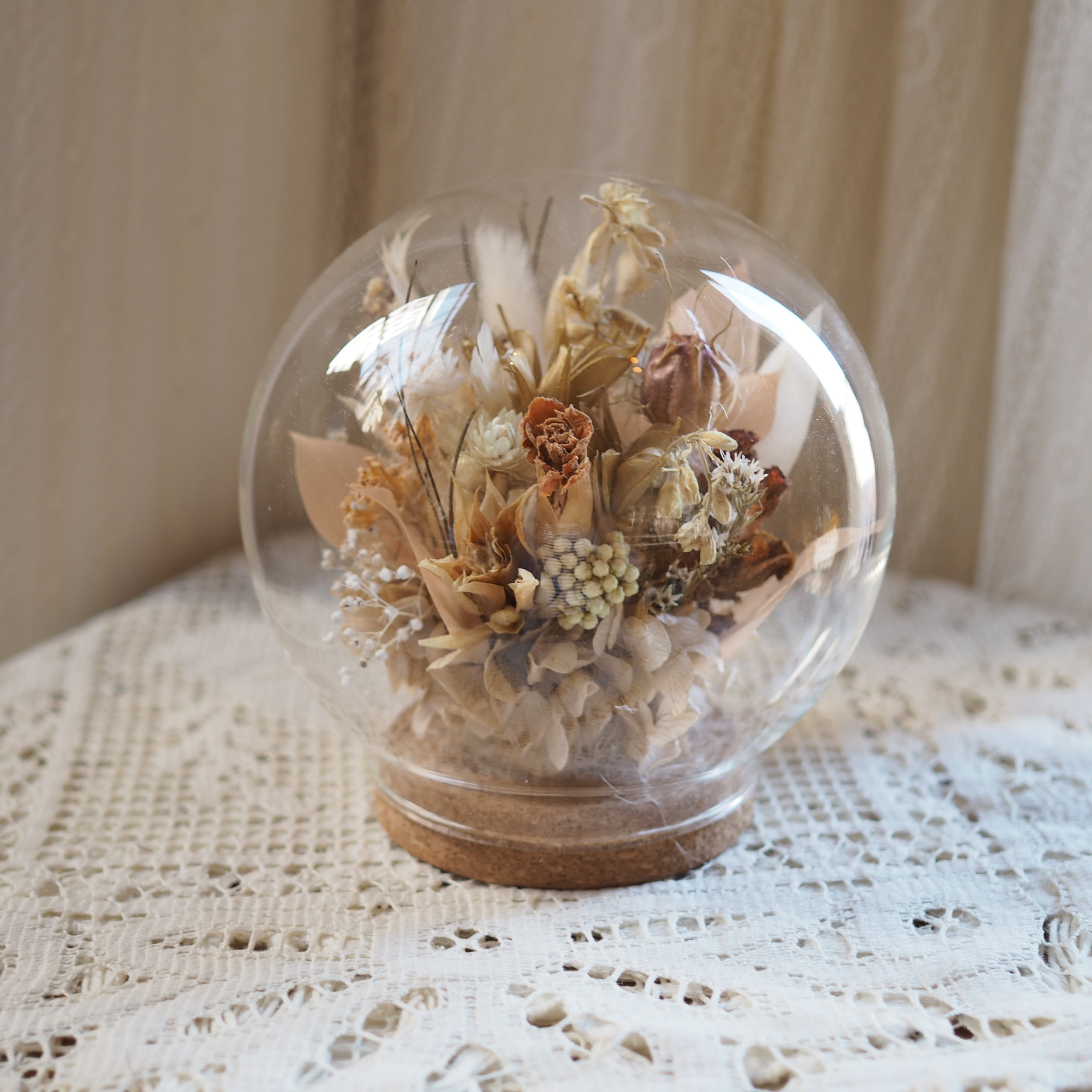 まんまるなガラスの中に、ナチュラルなドライフラワーを閉じ込めたアレンジメントです。
