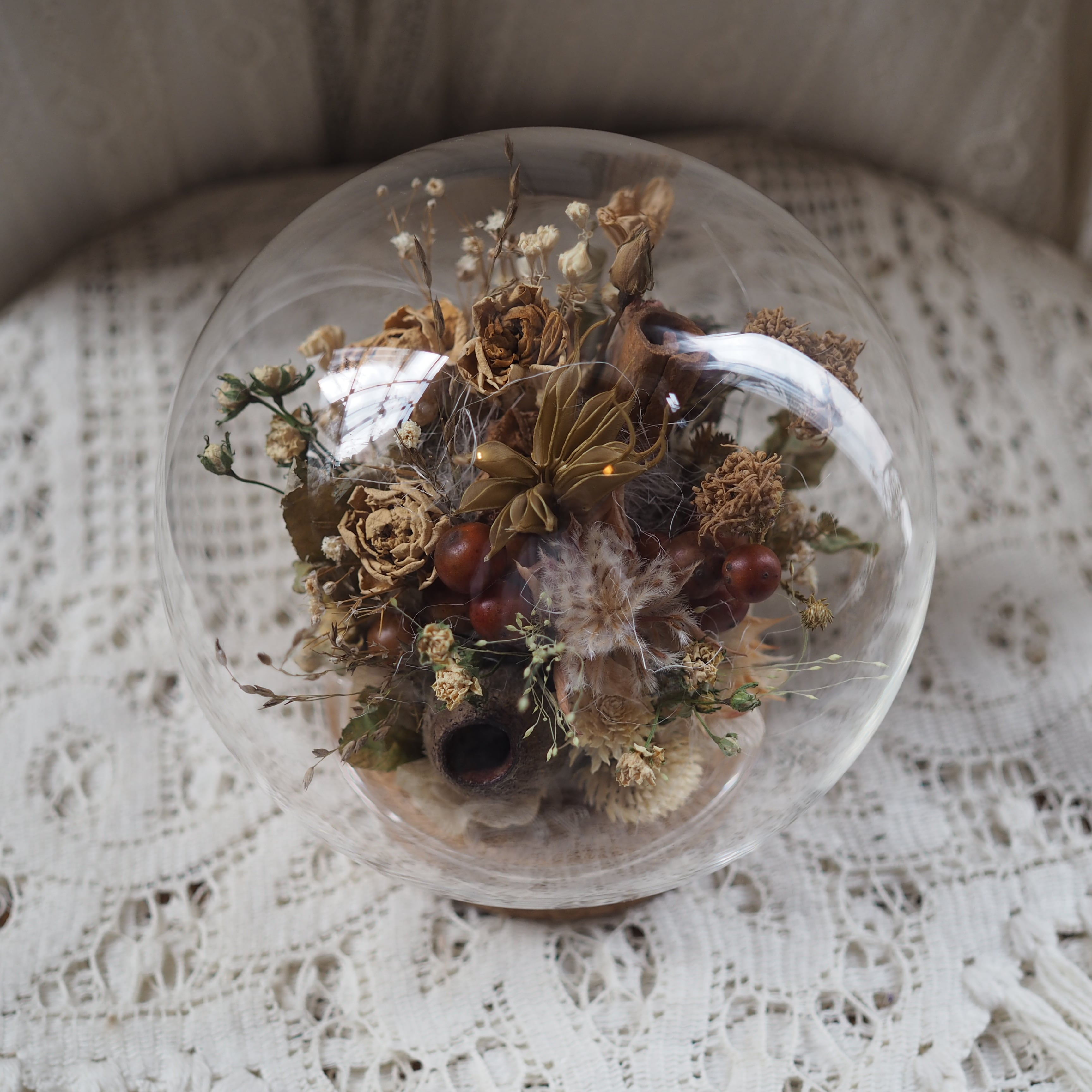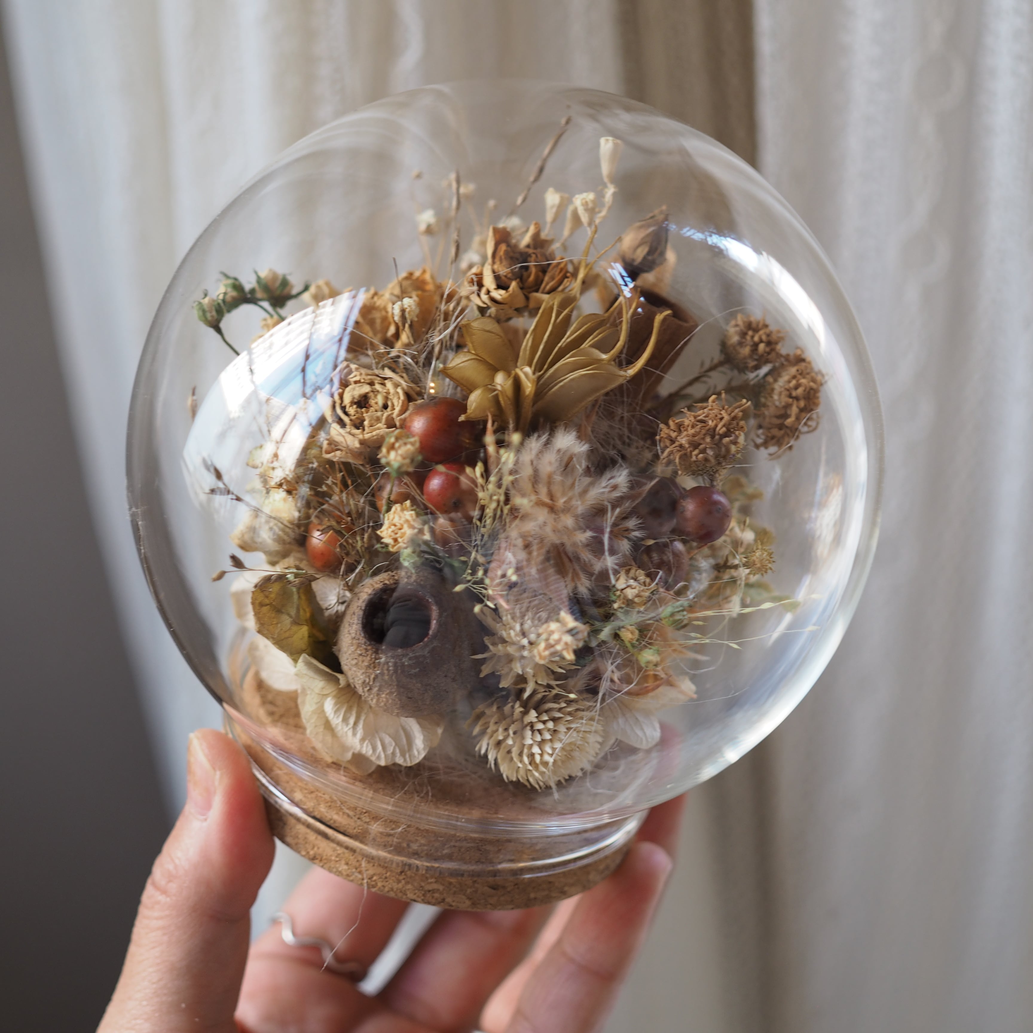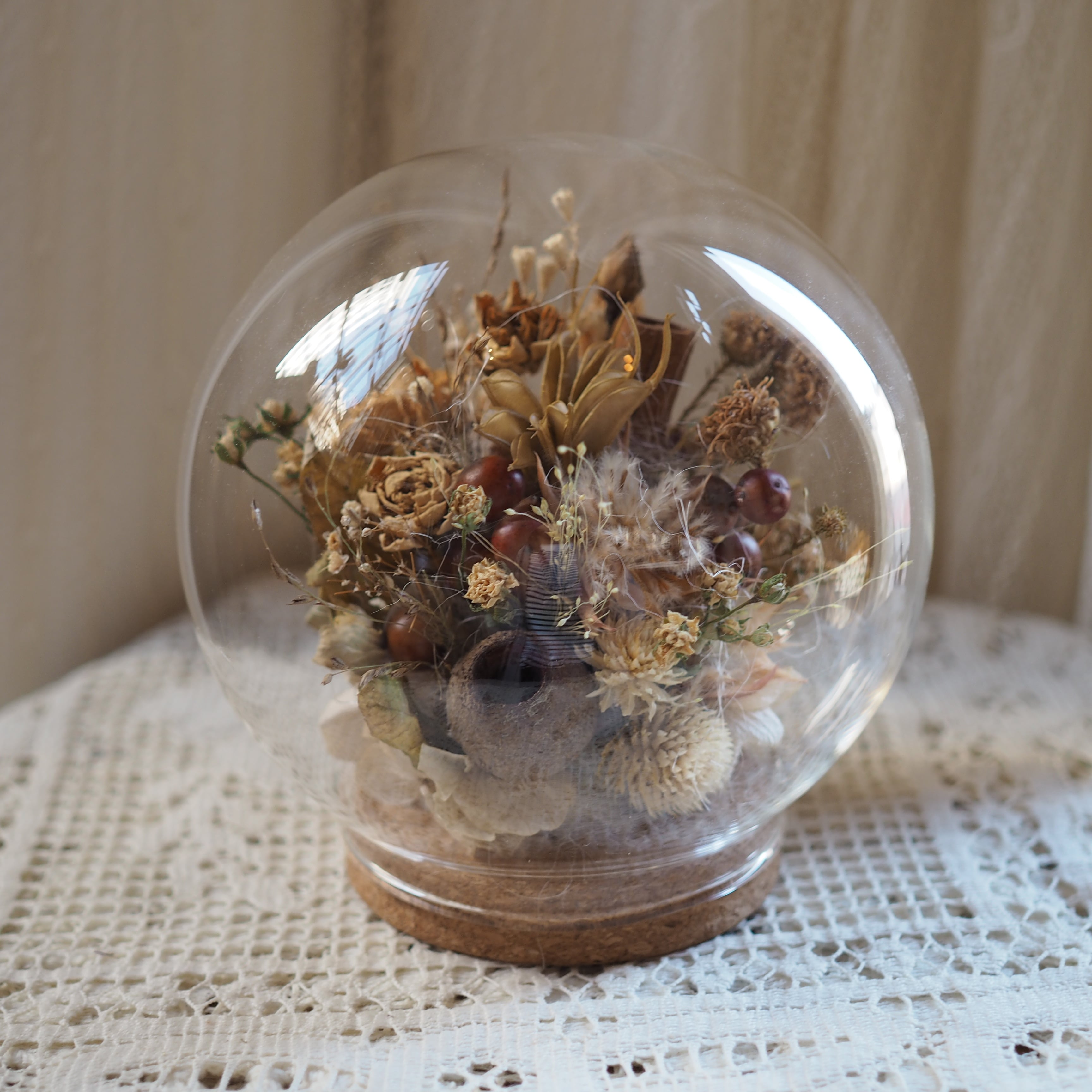 まんまるなガラスの中に、ナチュラルなドライフラワーを閉じ込めたアレンジメントです。
