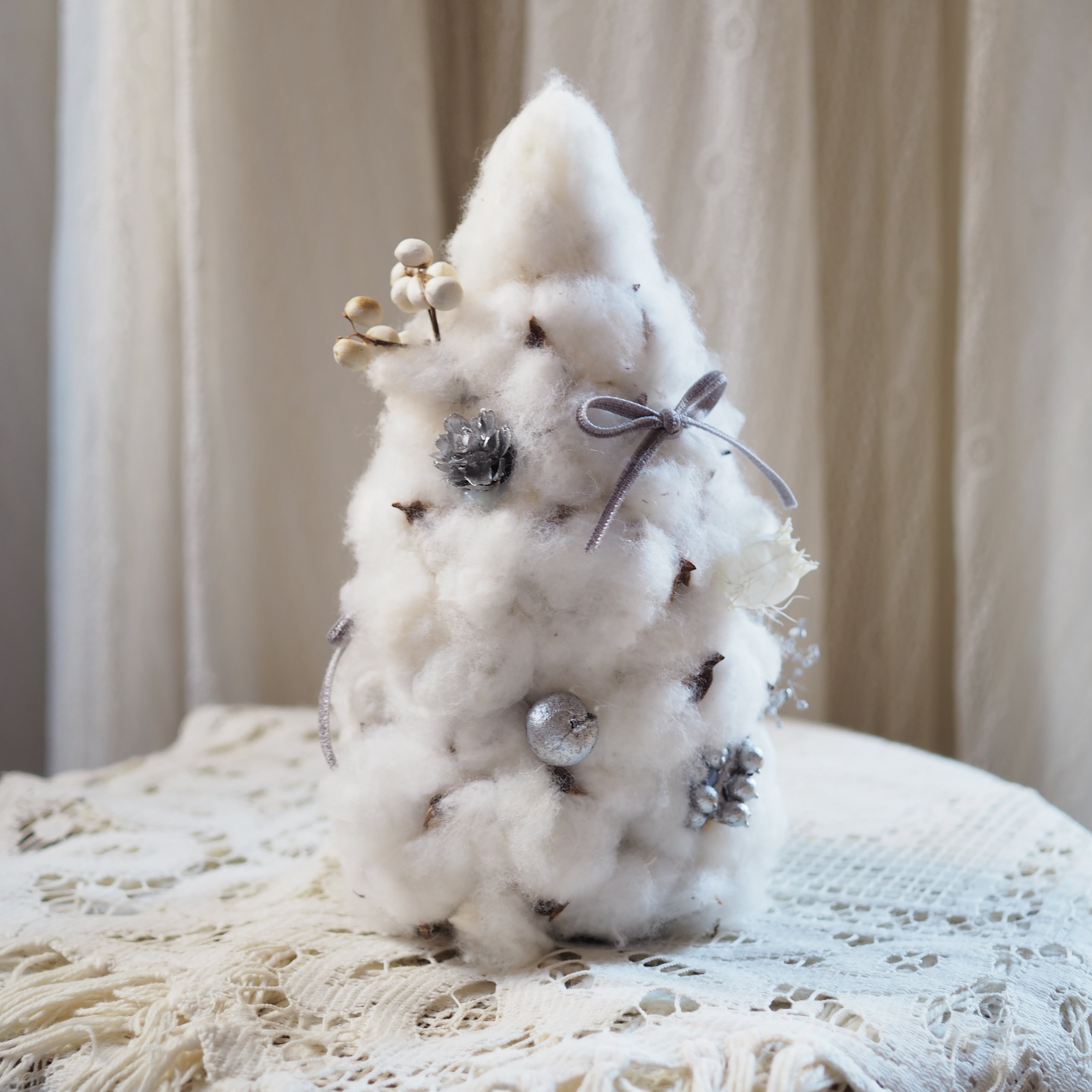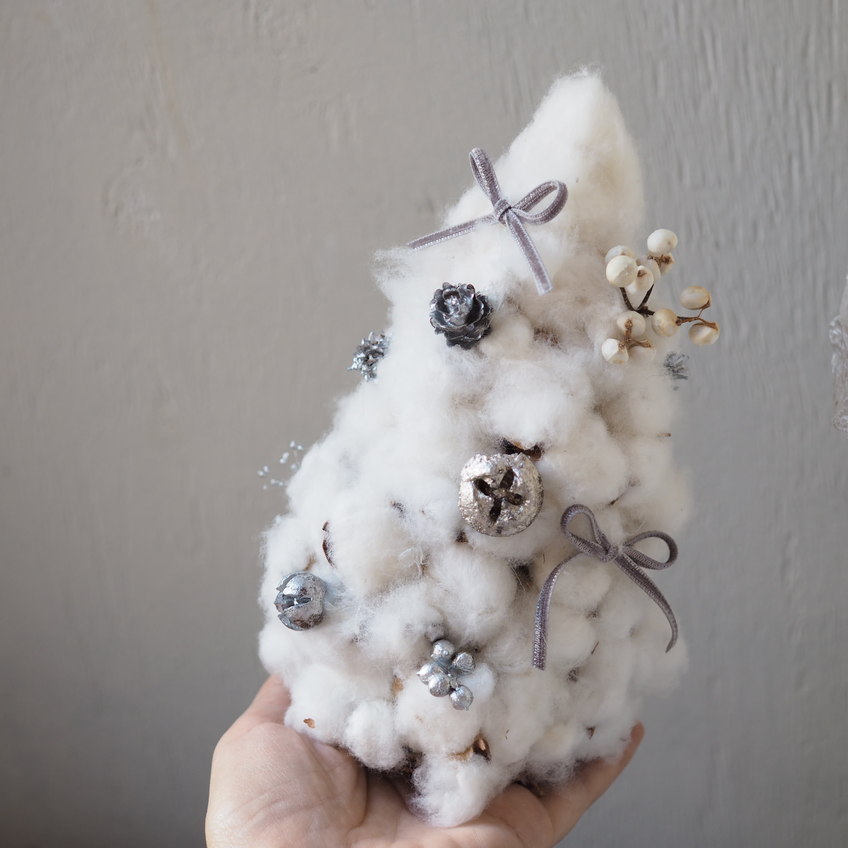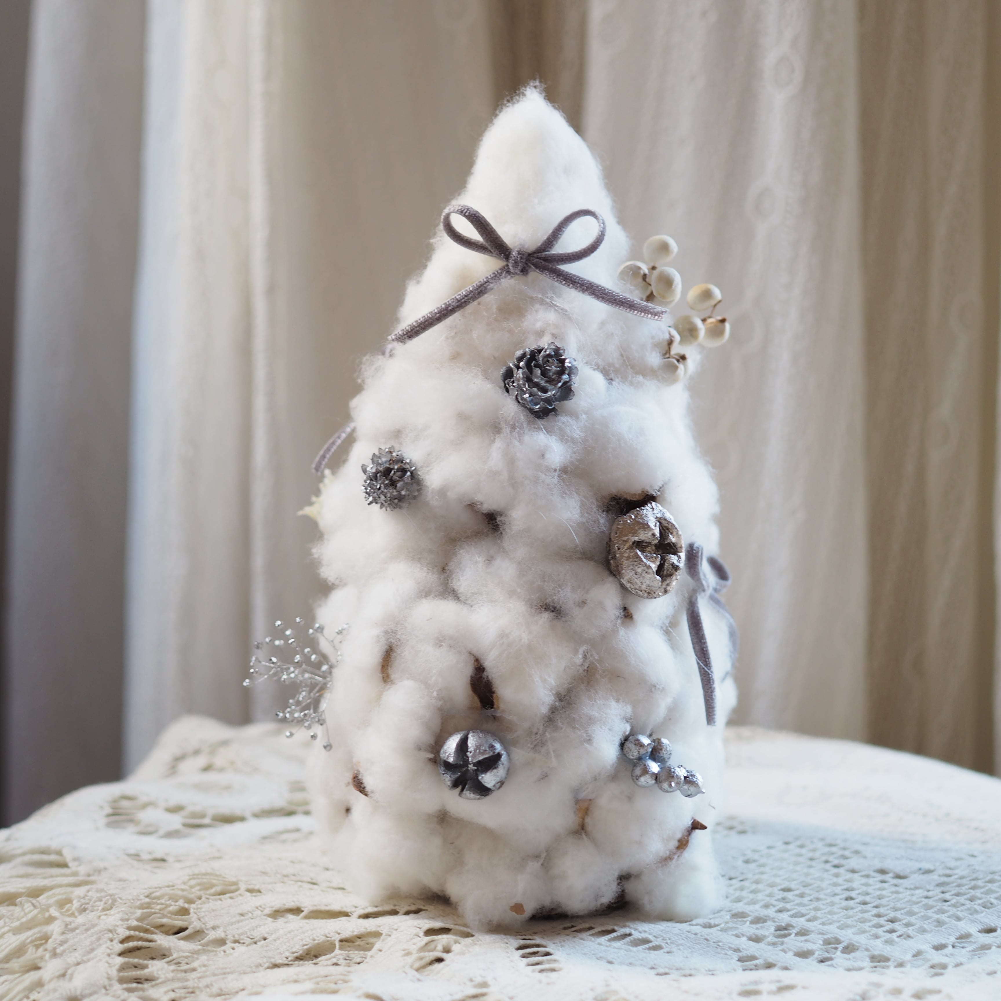 雪のようにふんわりとしたコットンフラワーで仕立てた冬のミニツリー。