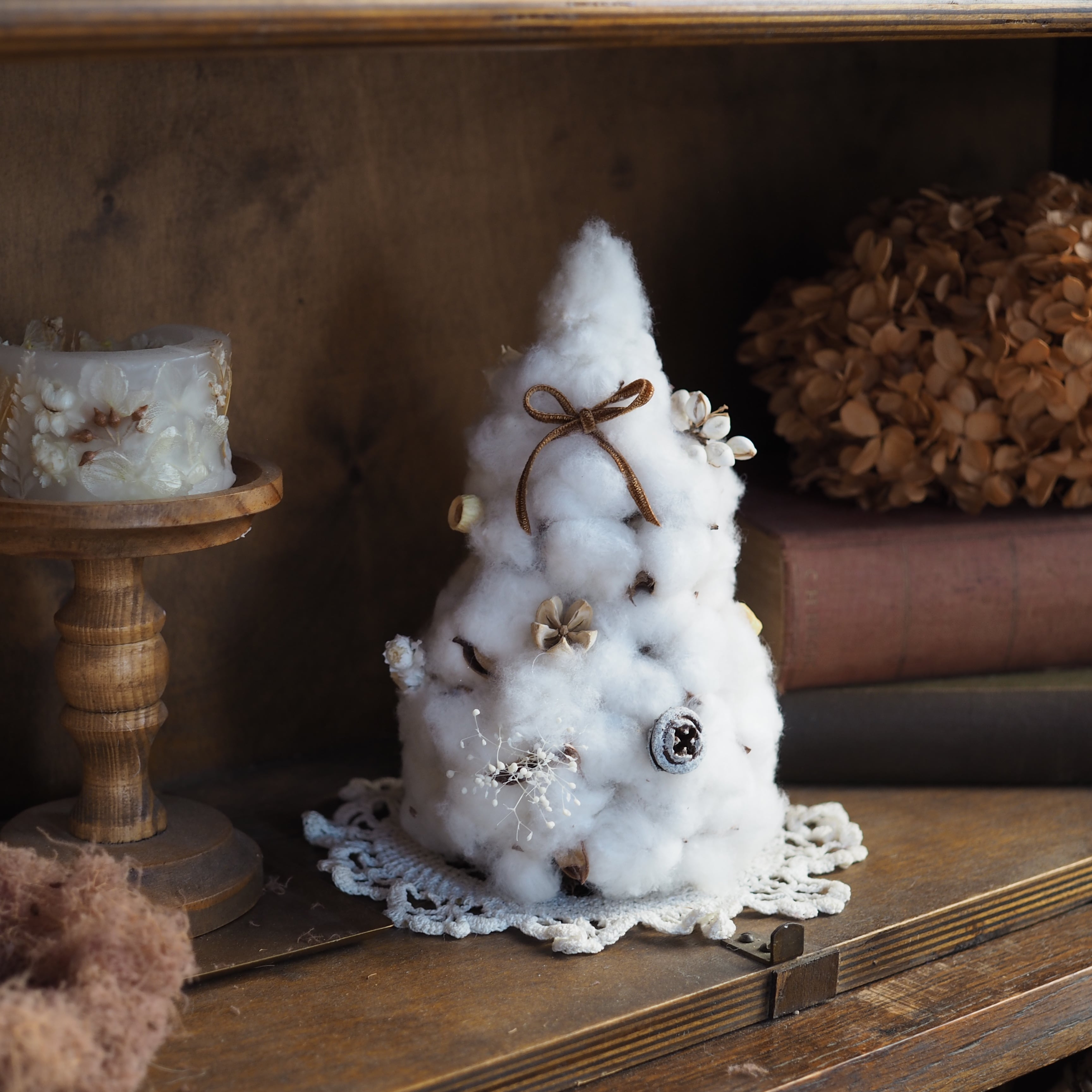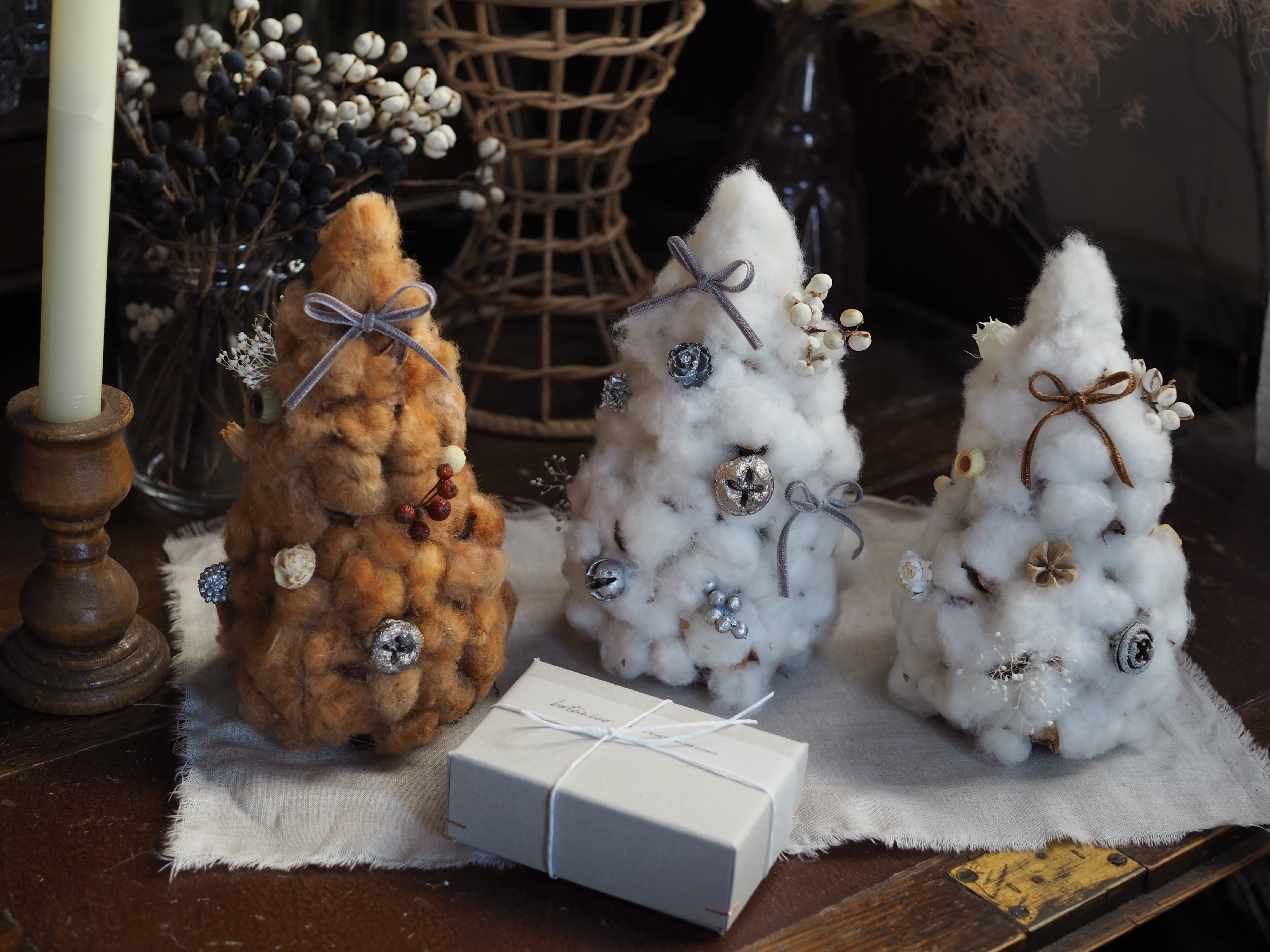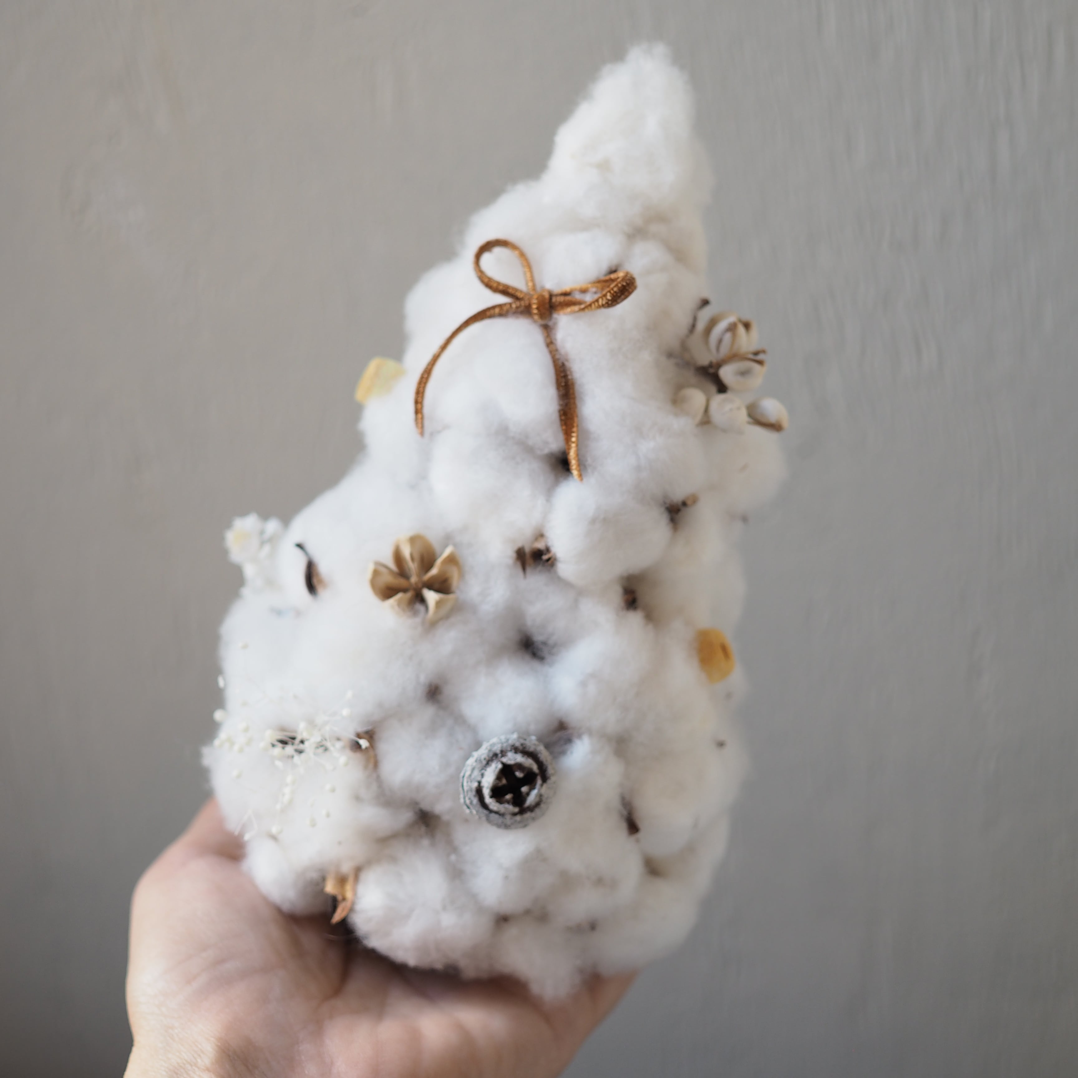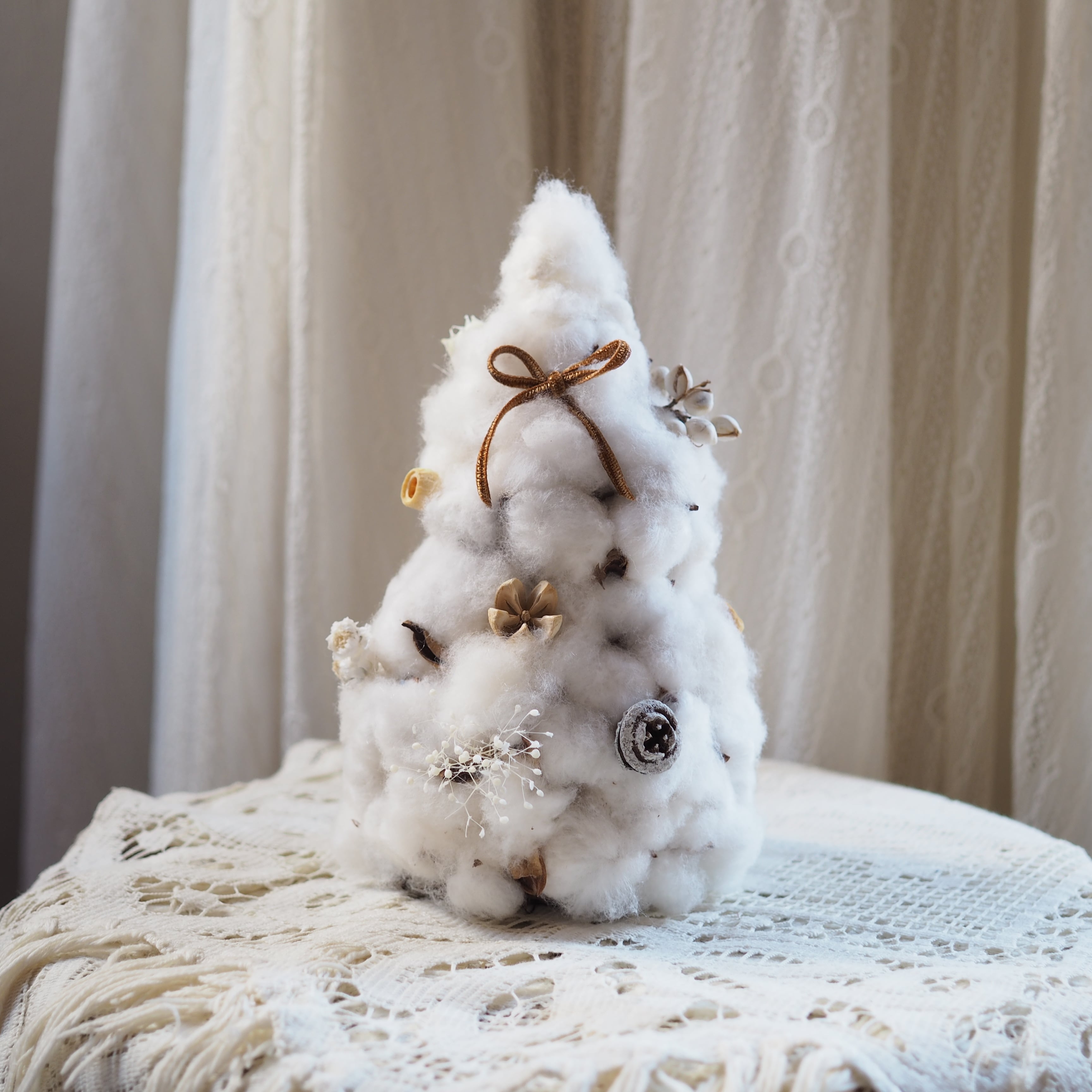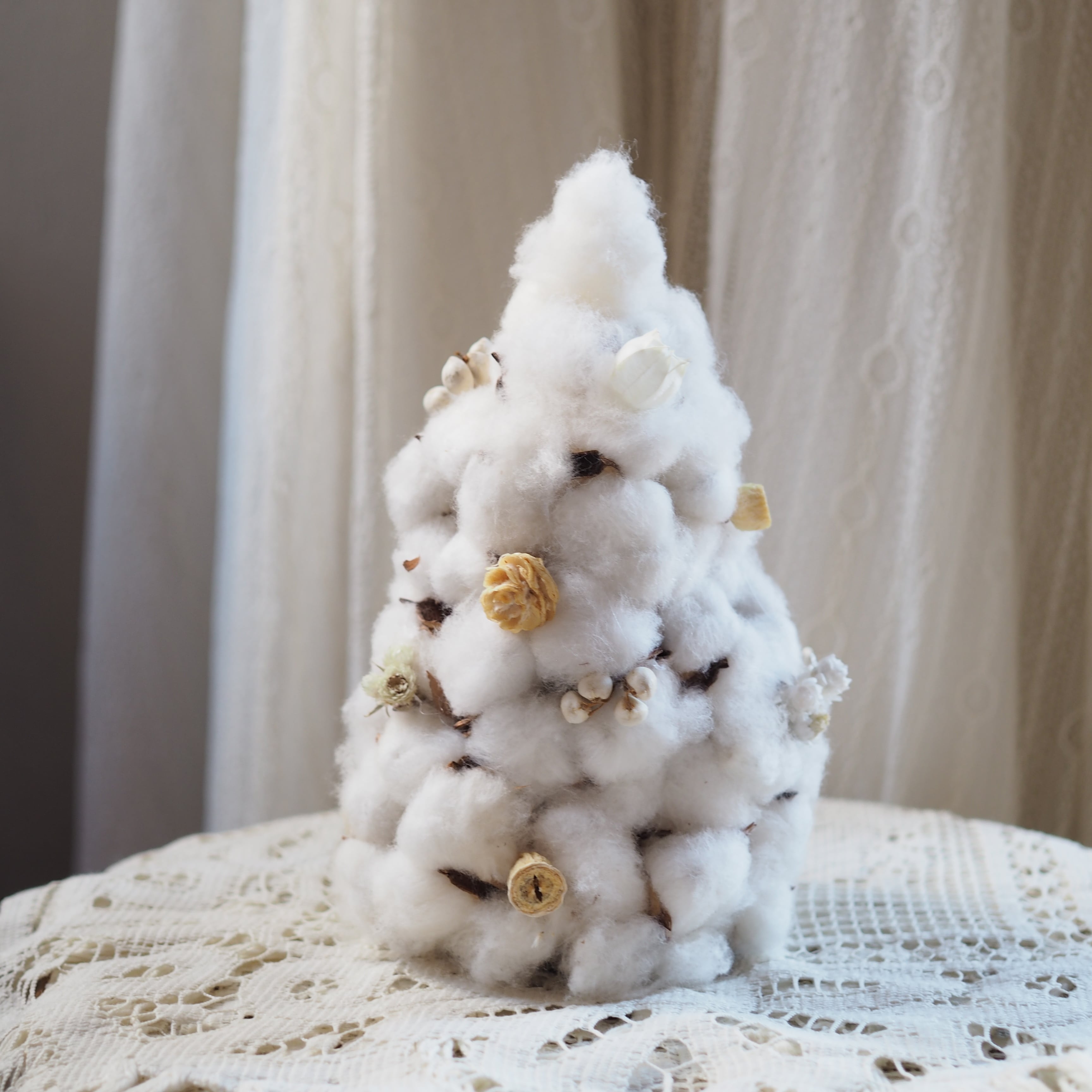 雪のようにふんわりとしたコットンフラワーで仕立てた冬のミニツリー。