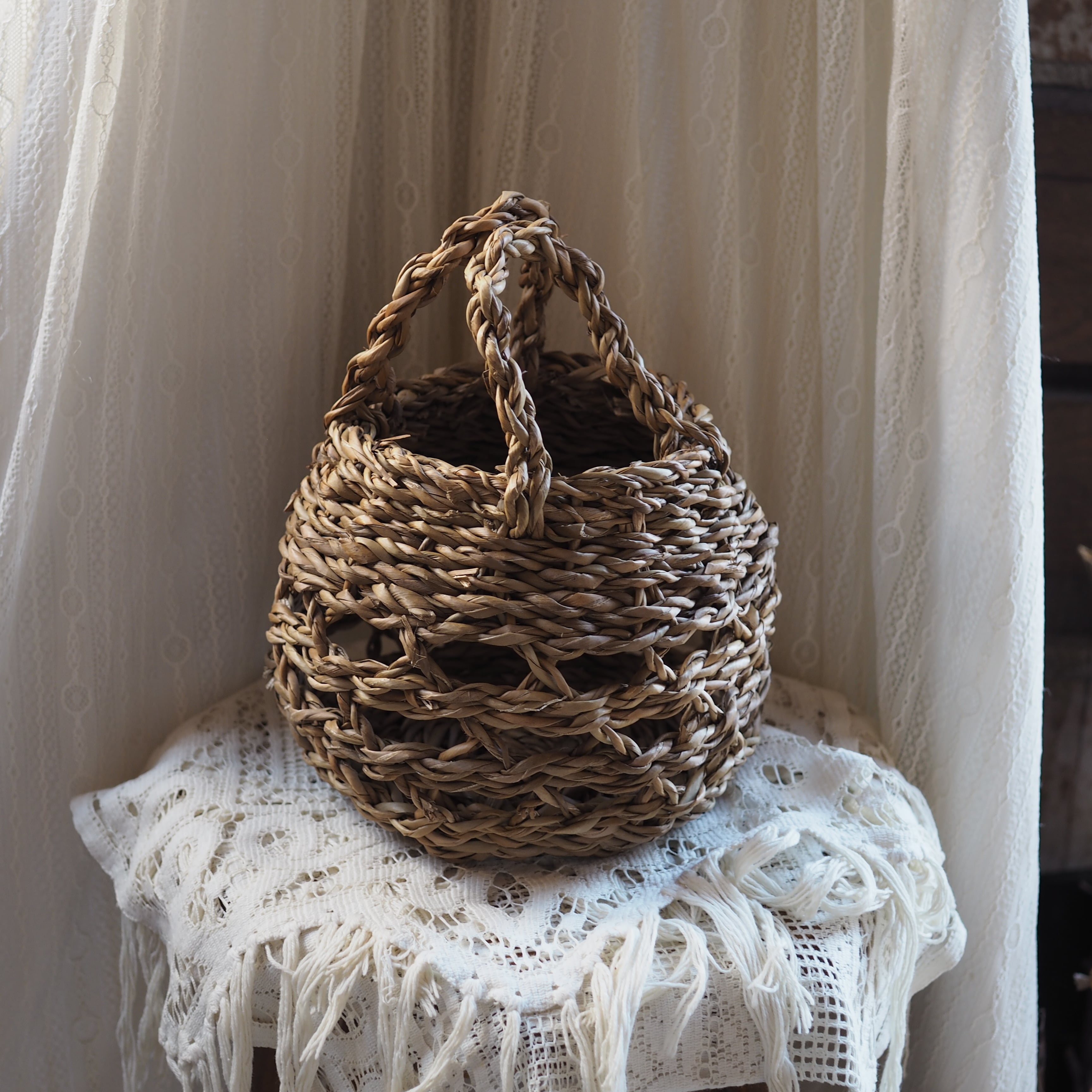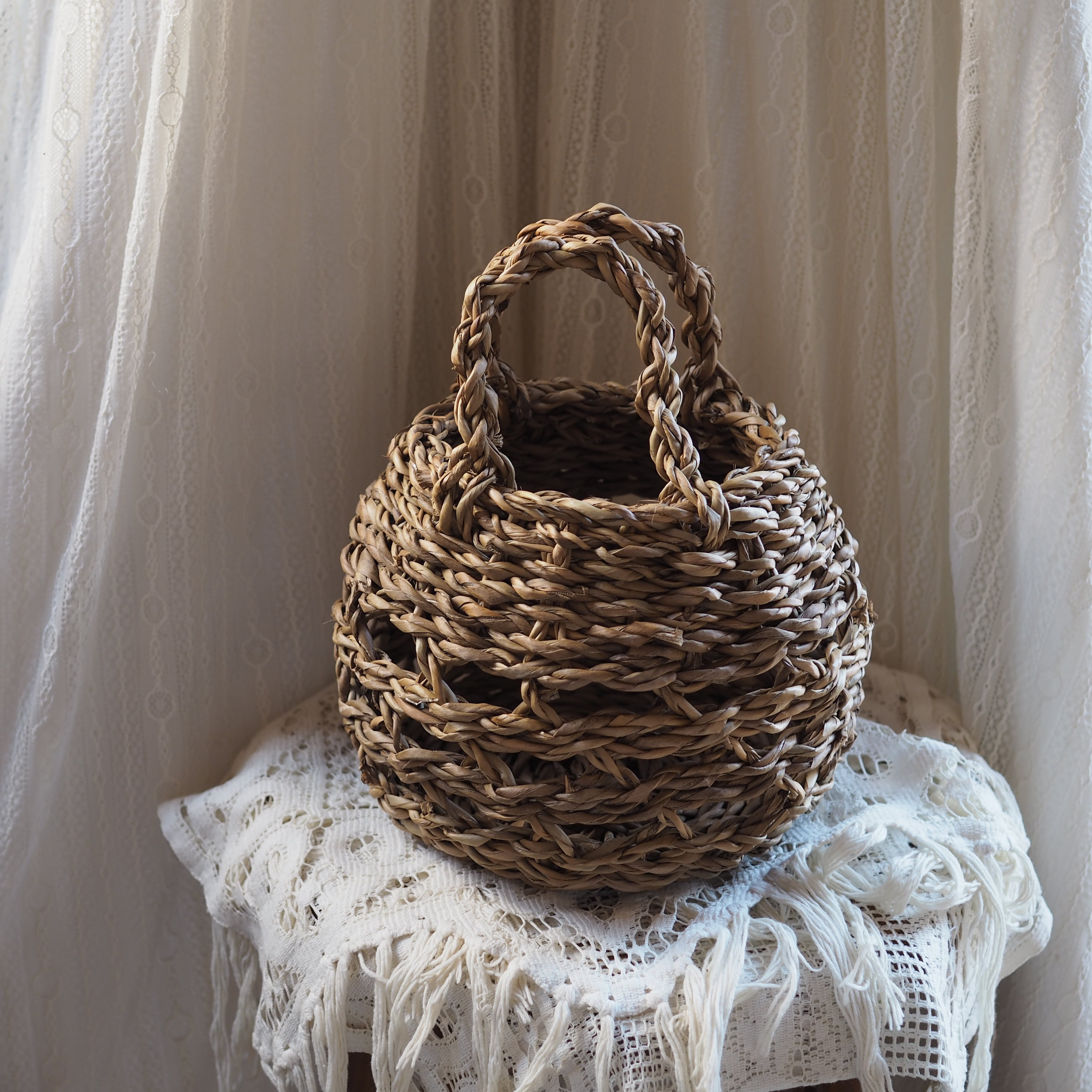 透かし編みが施され、ナチュラルな素材感と手作業の温もりが感じられる仕上がりです。
