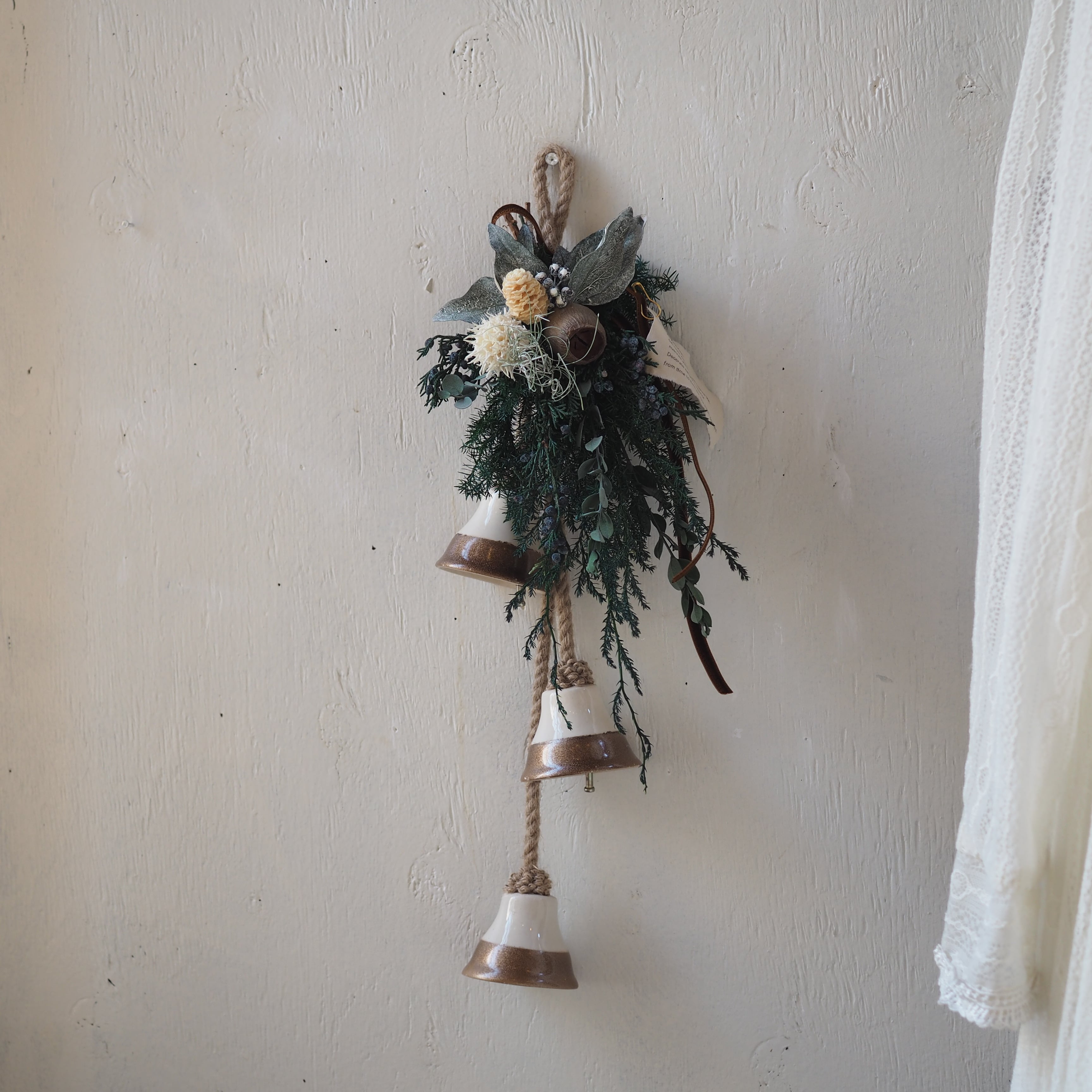 温かみのあるベルと、深いグリーンのコントラストが美しく、クリスマスシーズンのデコレーションにもおすすめです。