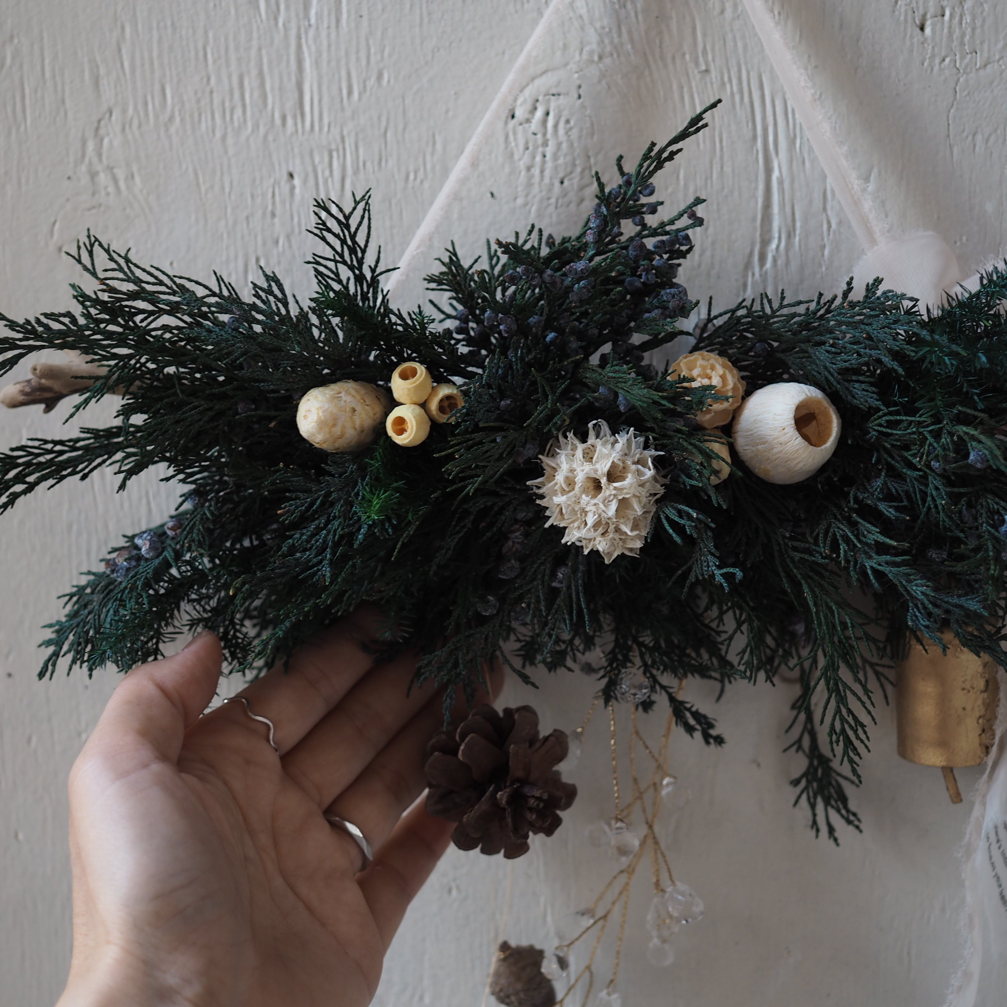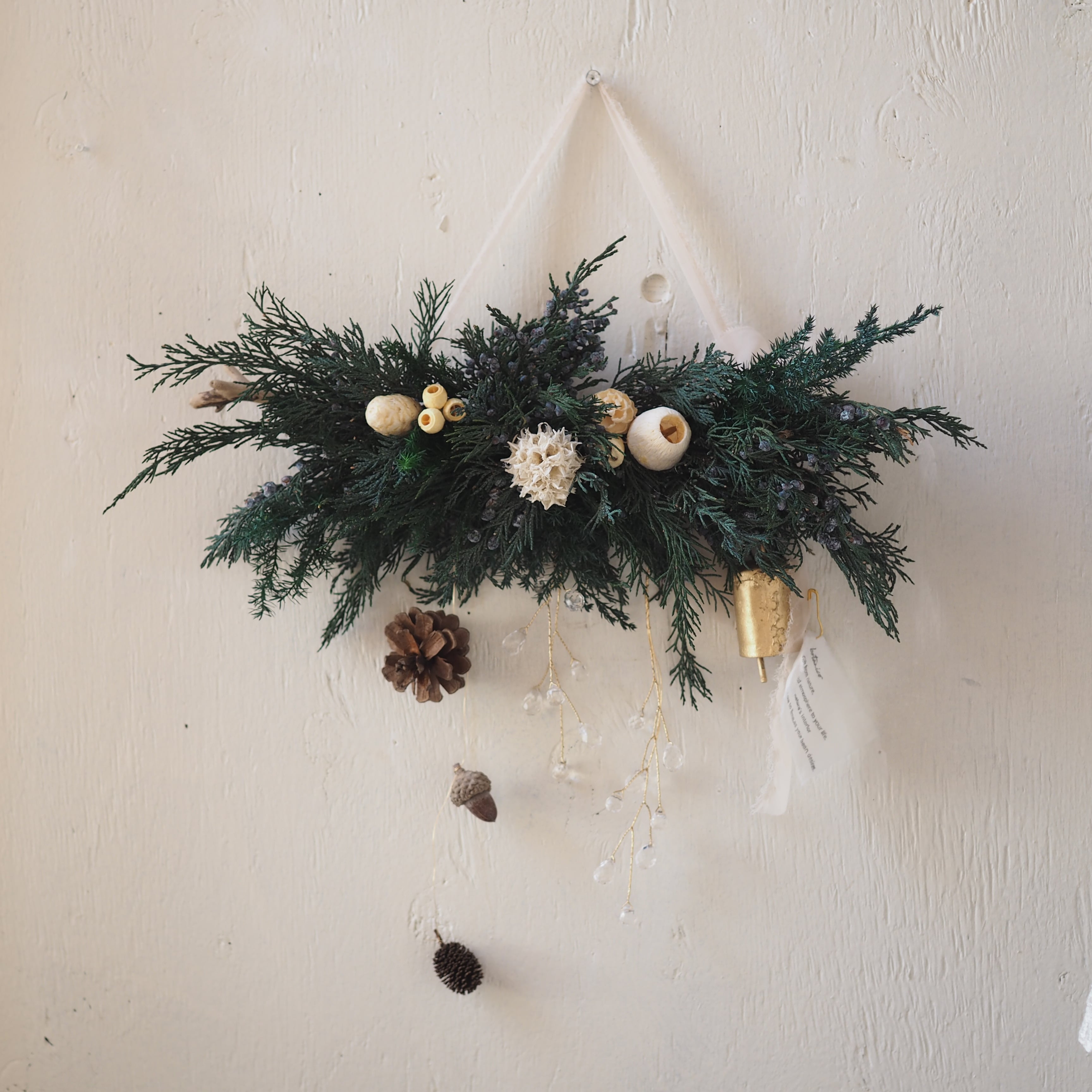 枝にプリザーブドのヒムロスギとマウンテンジュニパーをたっぷりとあしらい、アクセントにホワイト系の木の実を。