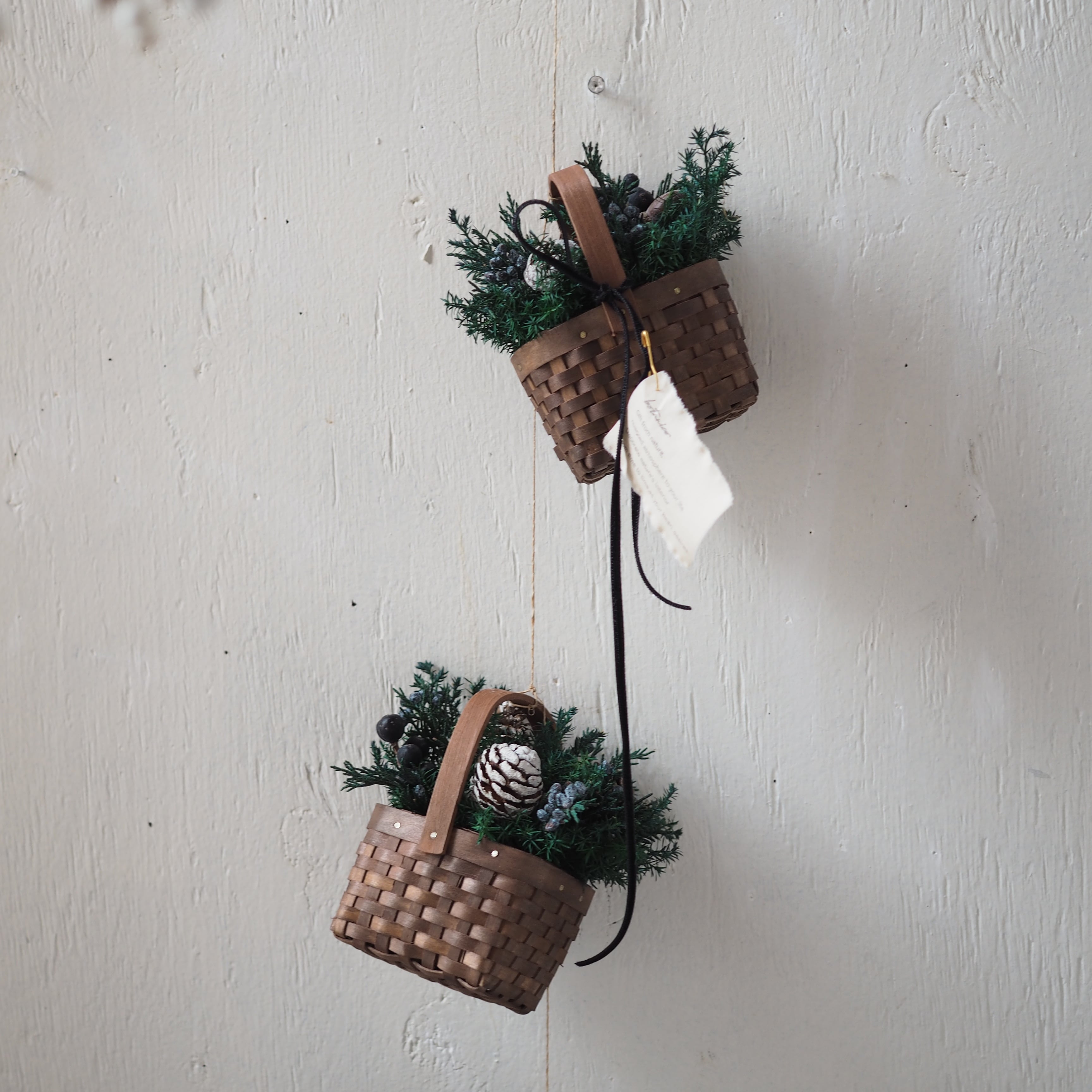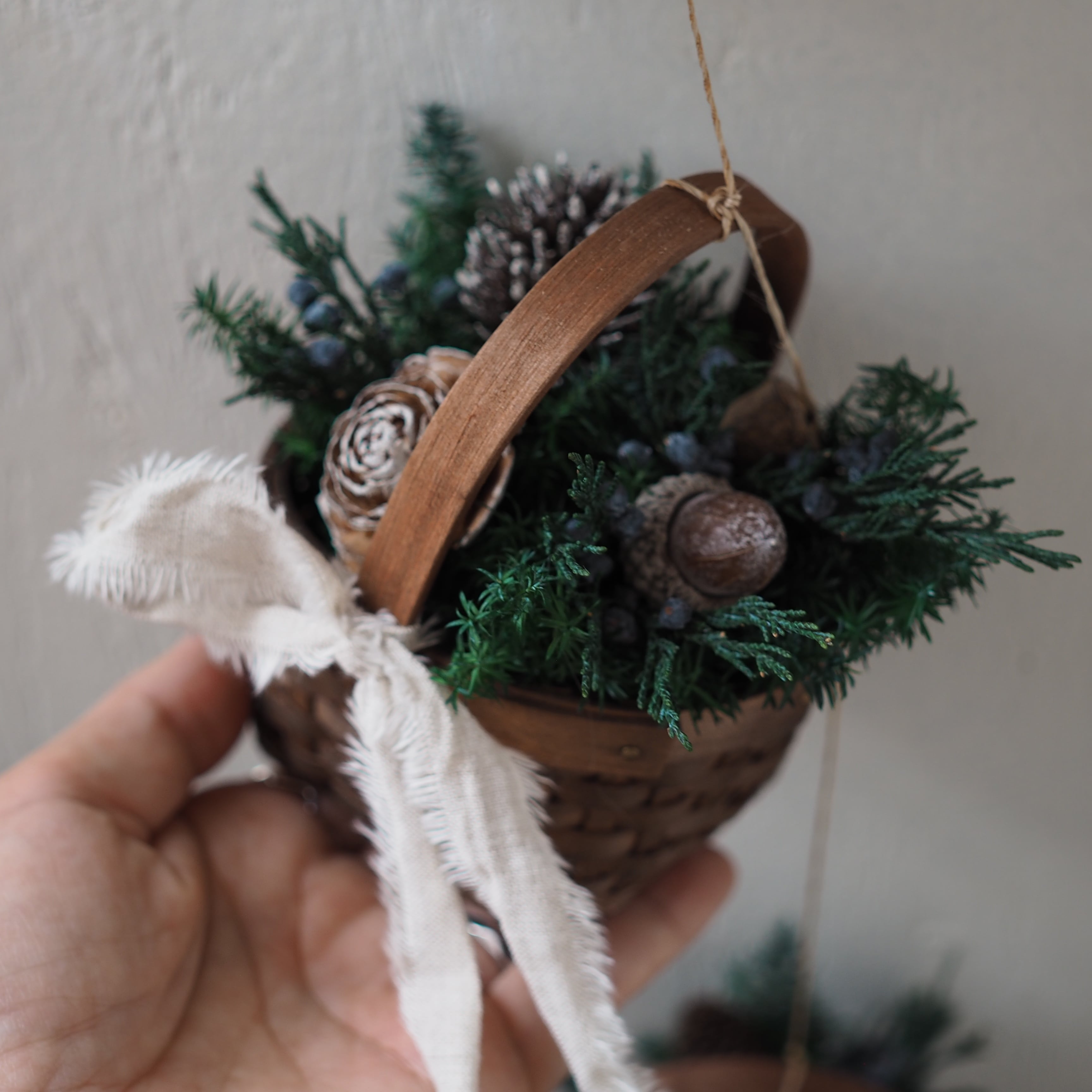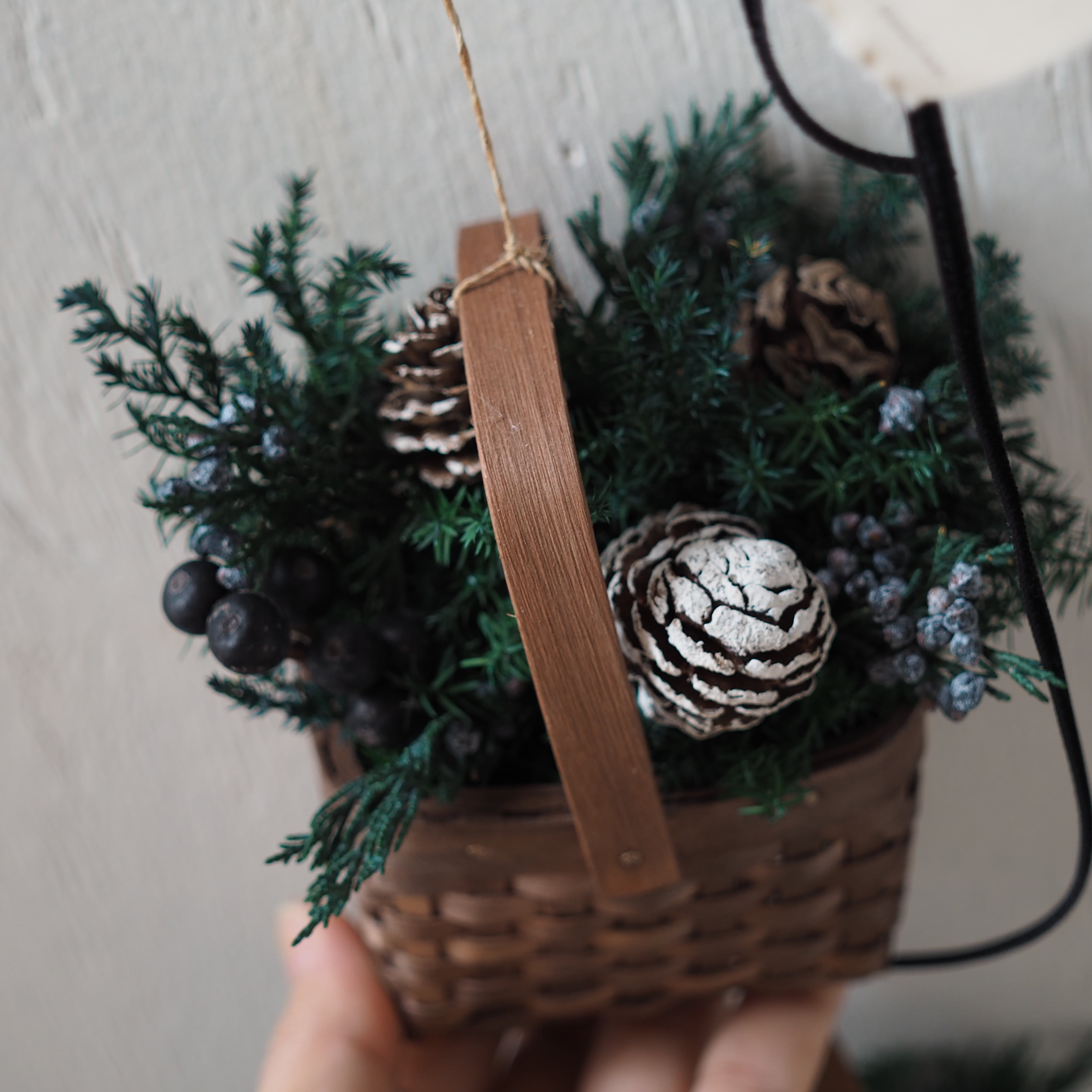 可愛いらしいミニバスケットに、プリザーブドのヒムロスギとジュニパーをたっぷり詰め、それぞれにシックな木の実を散りばめました。