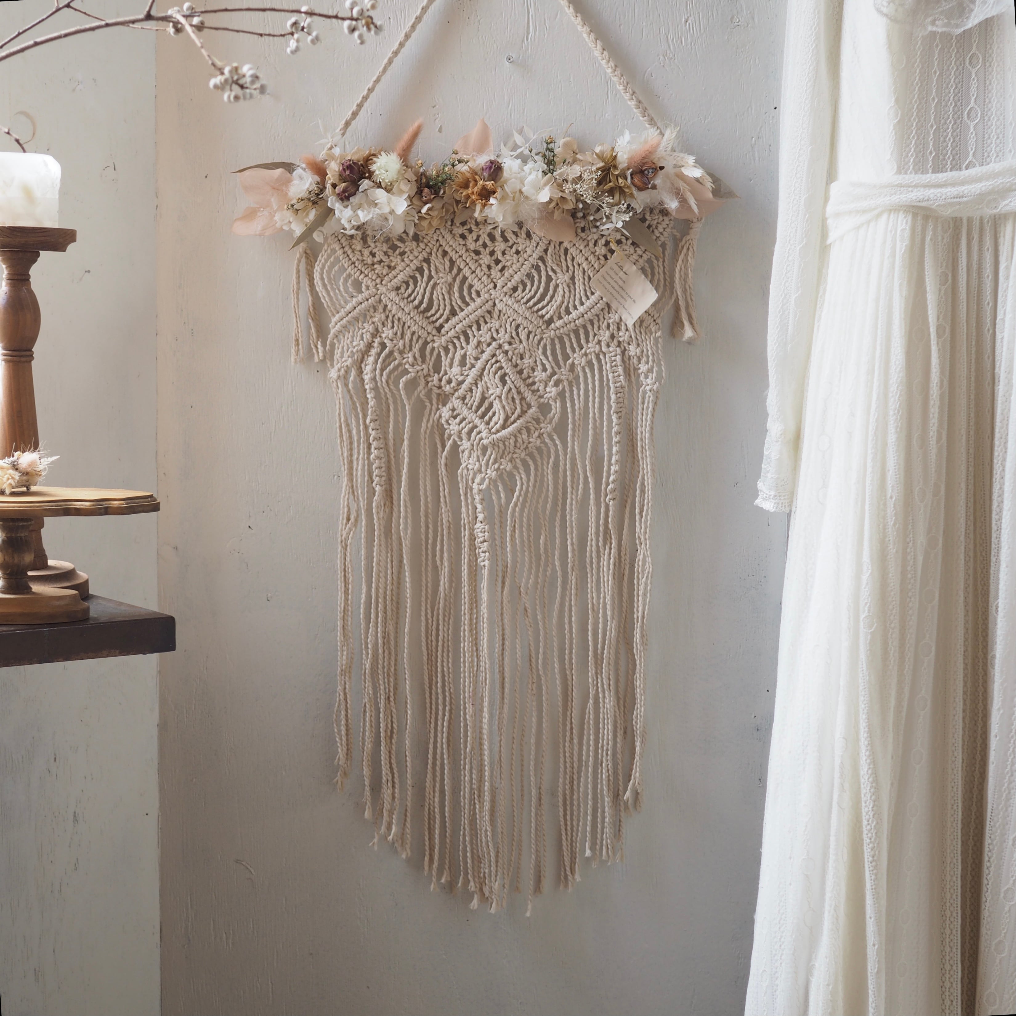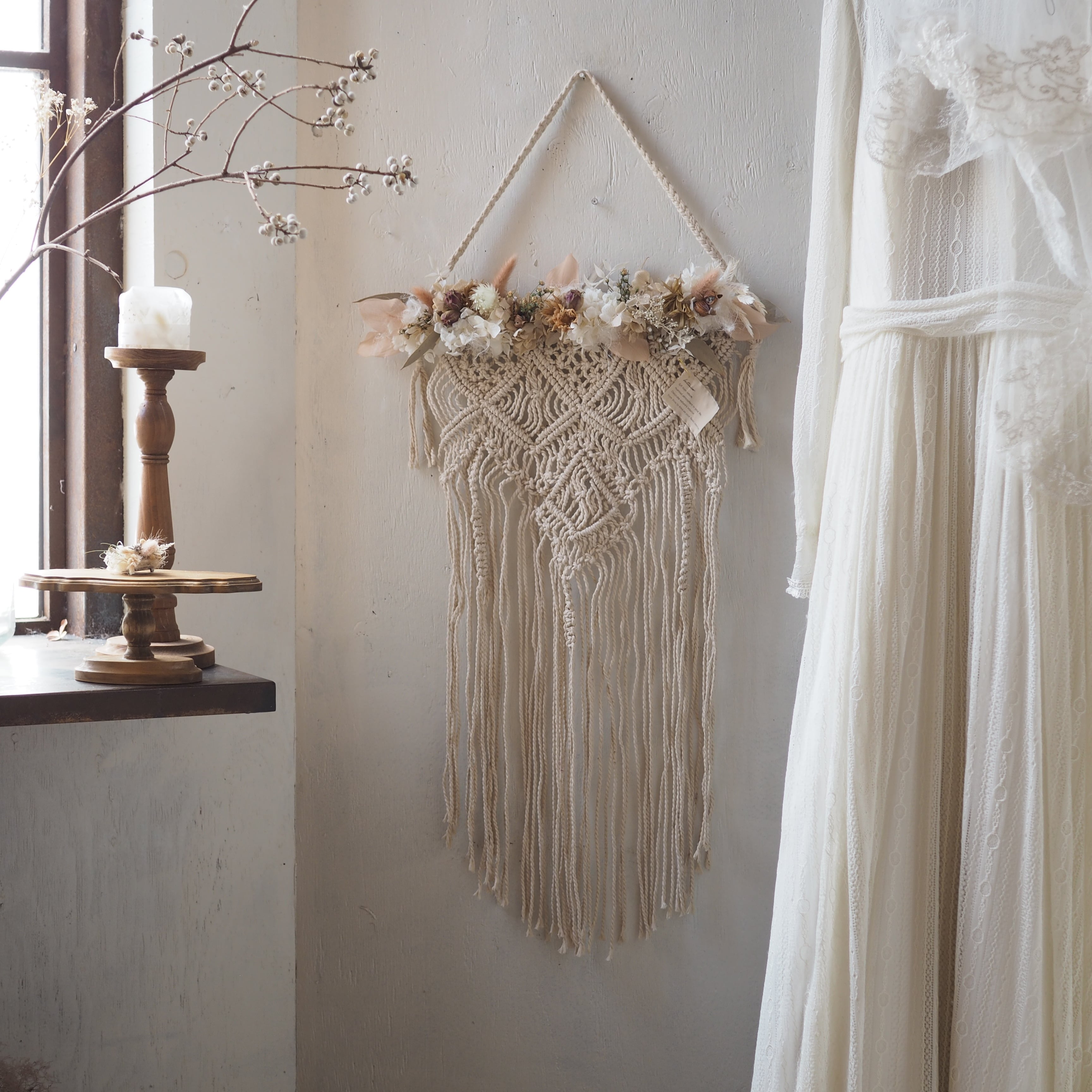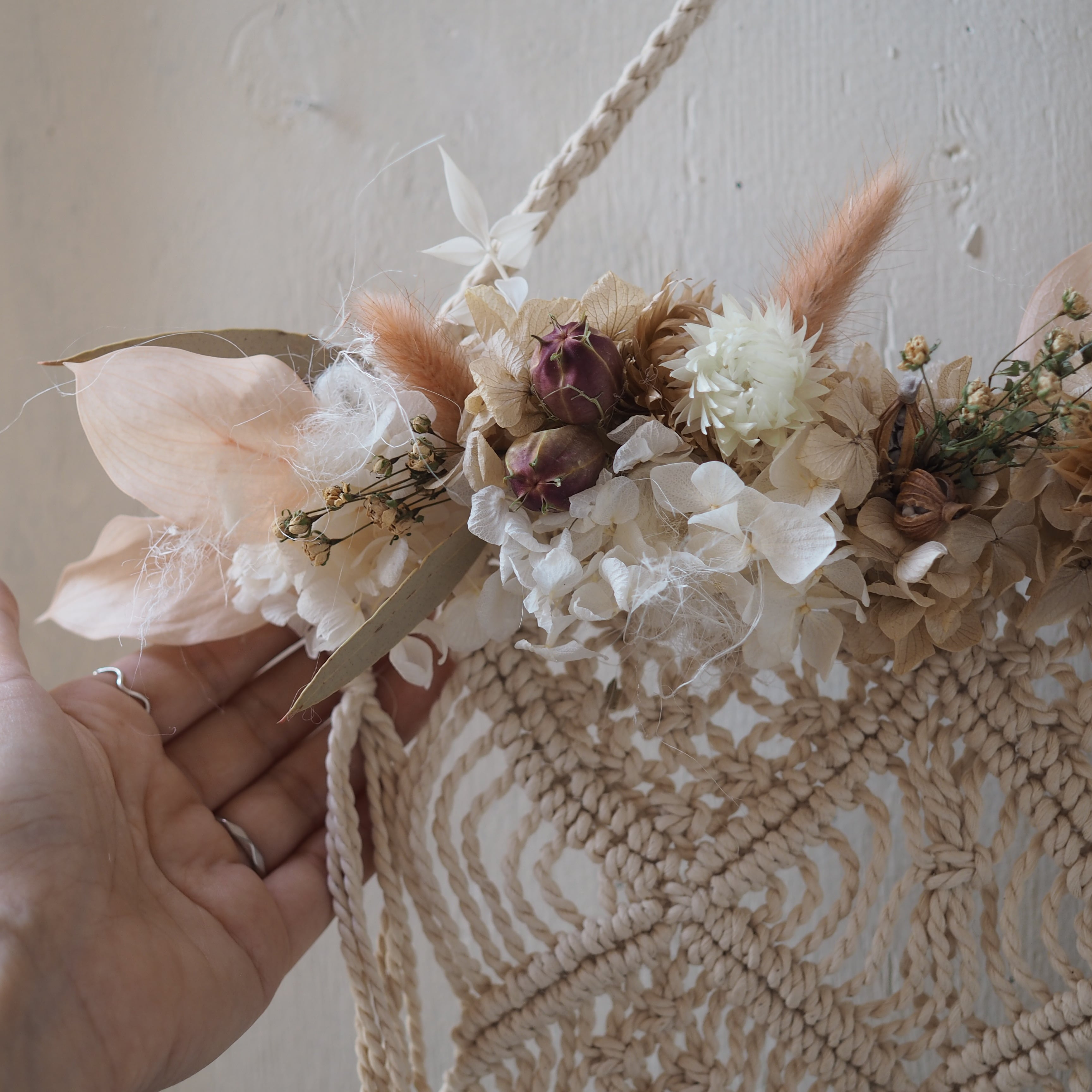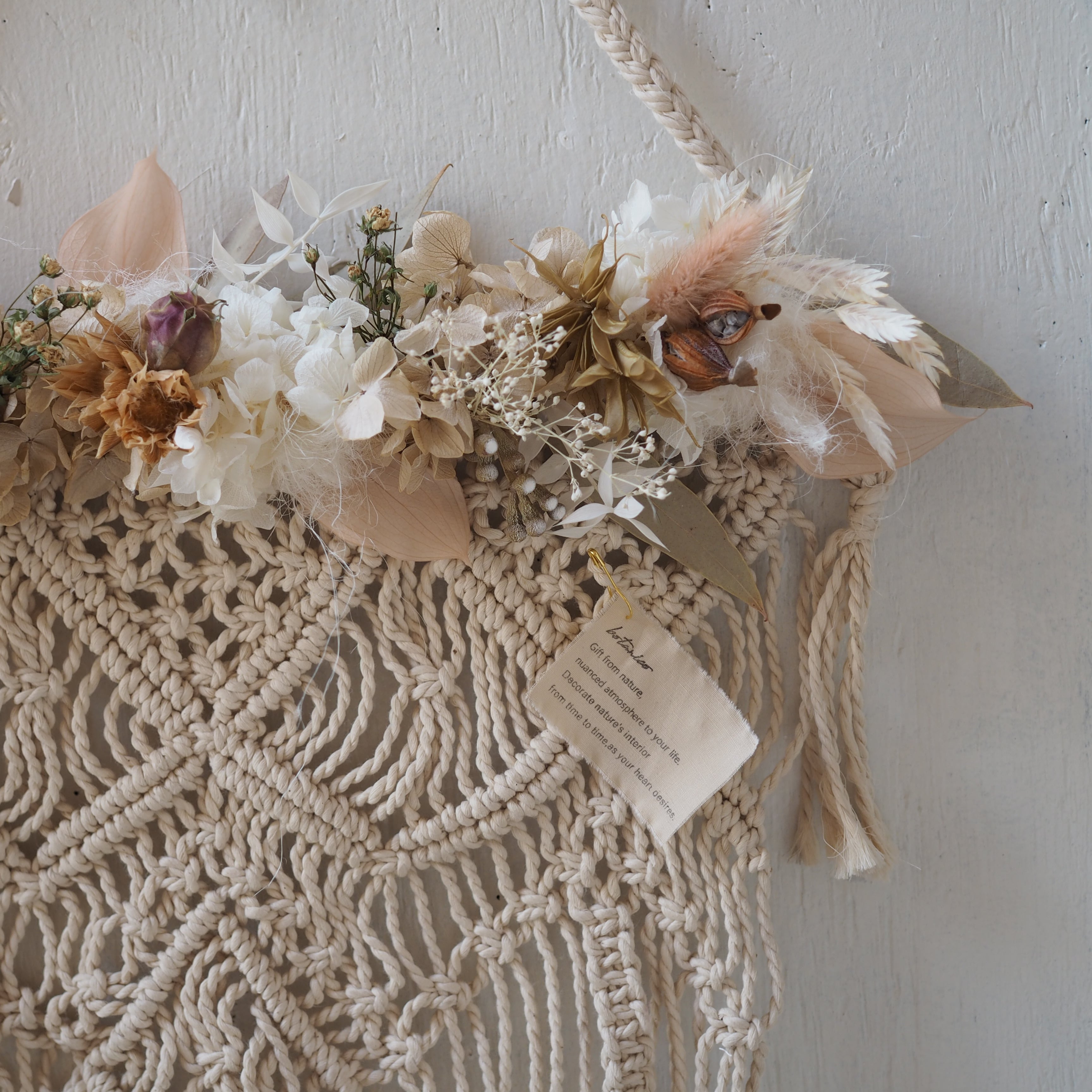 マクラメ編みのタペストリーに、アジサイや可愛らしい小花、ユーカリなどをあしらいました。