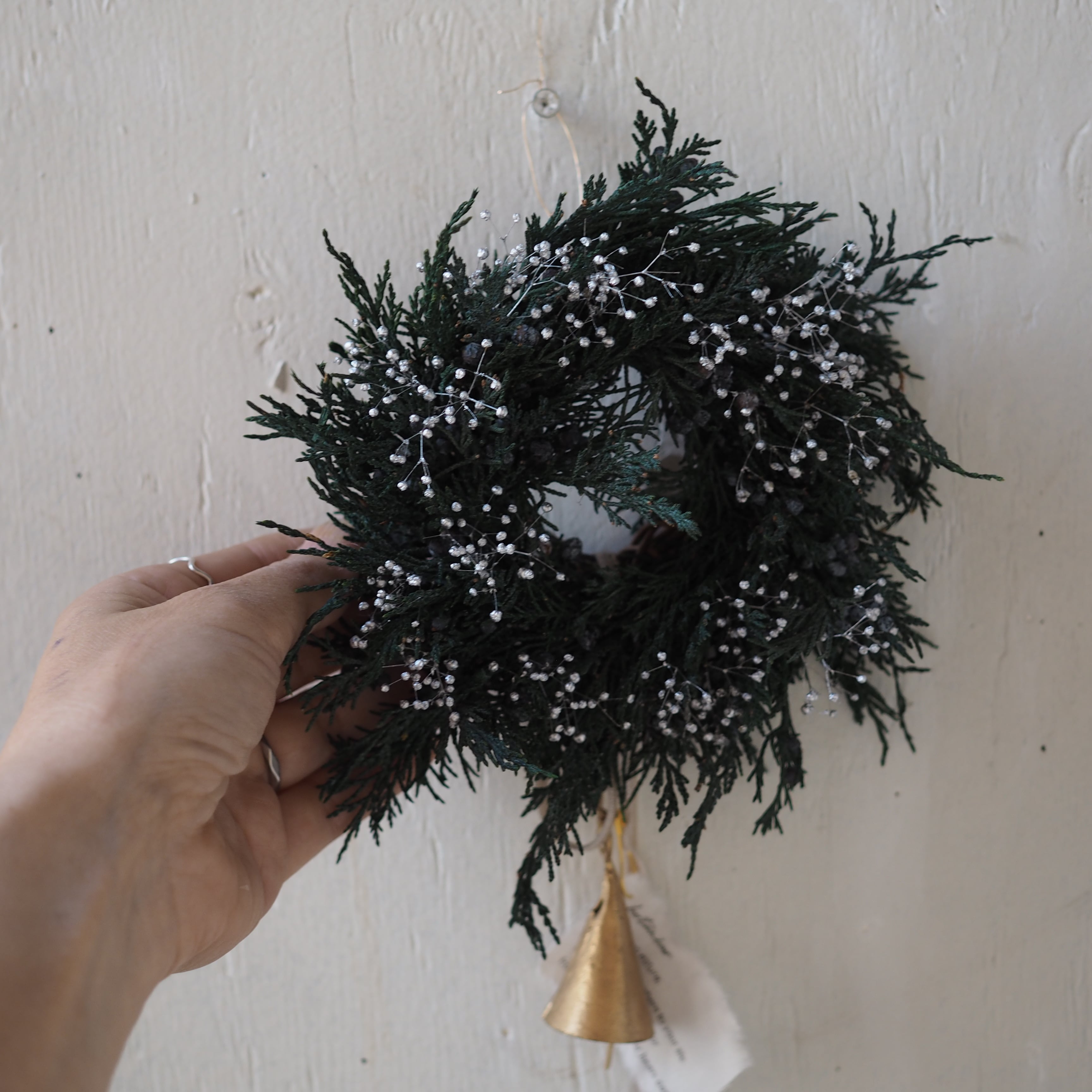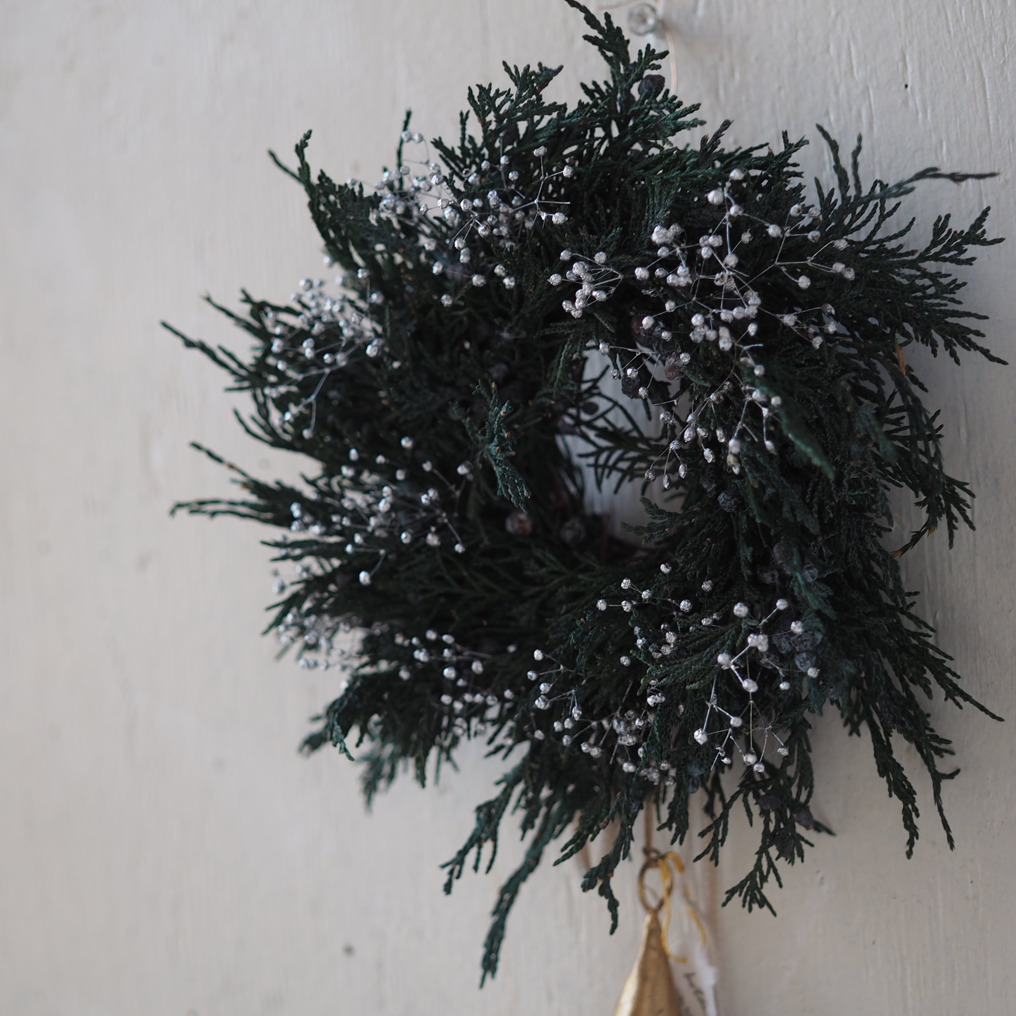プリザーブドグリーンのマウンテンジュニパーやヒムロスギをベースに、かすみ草をあしらったナチュラルなクリスマスリース。