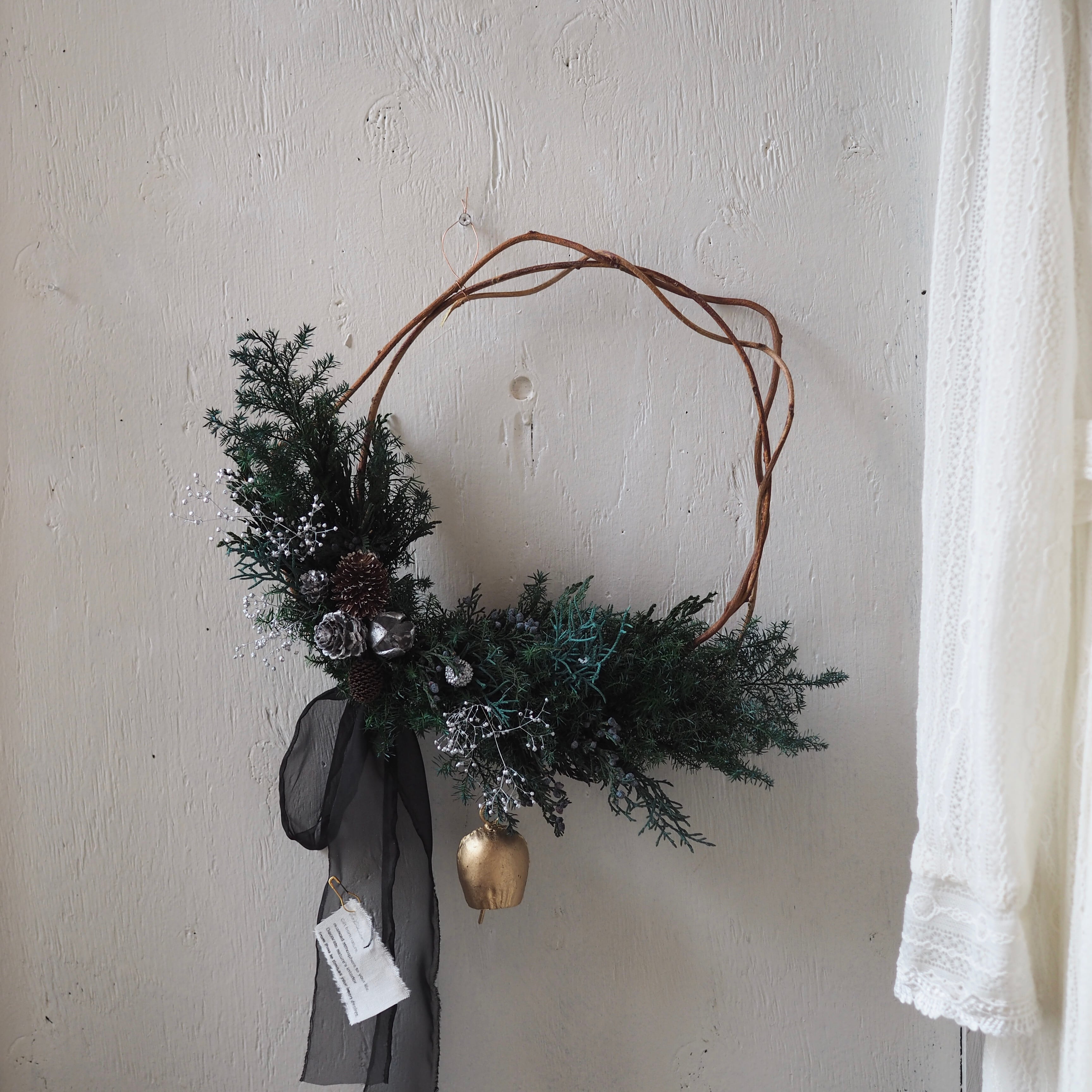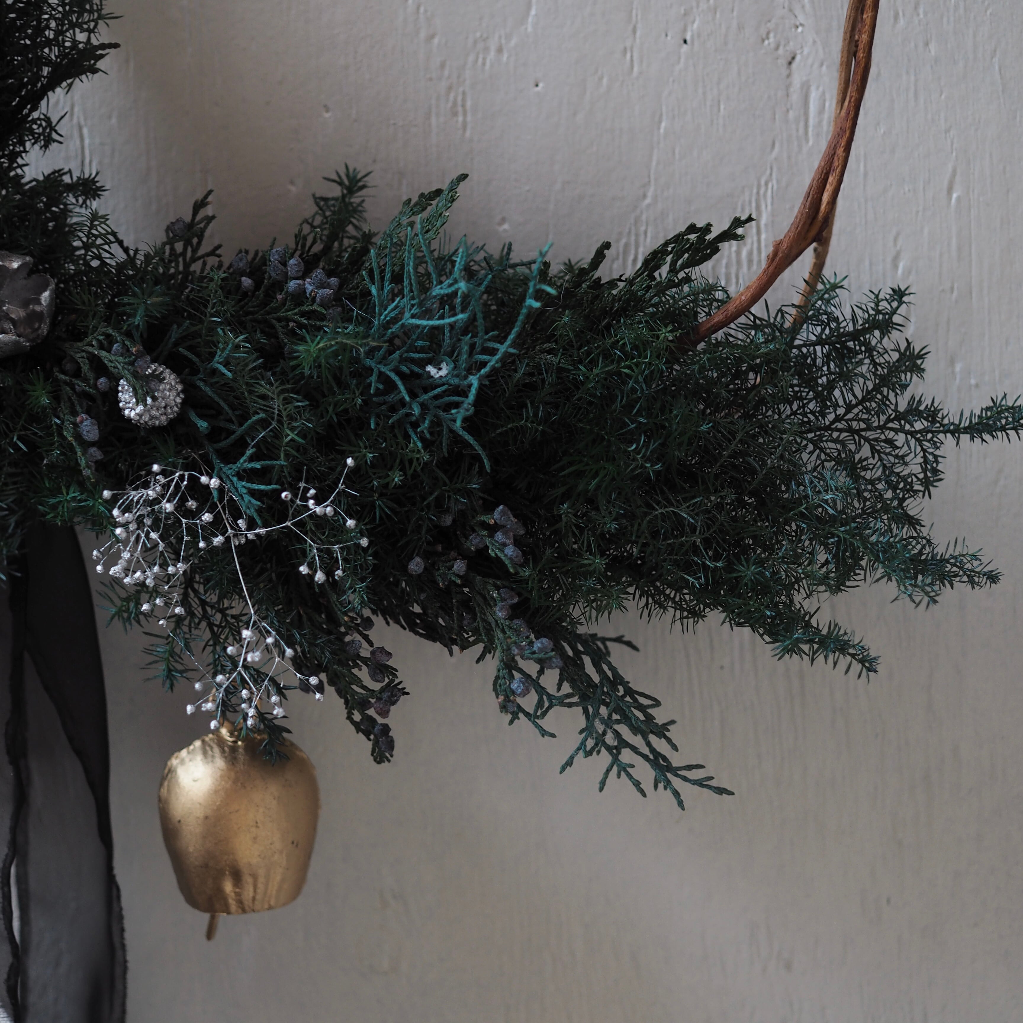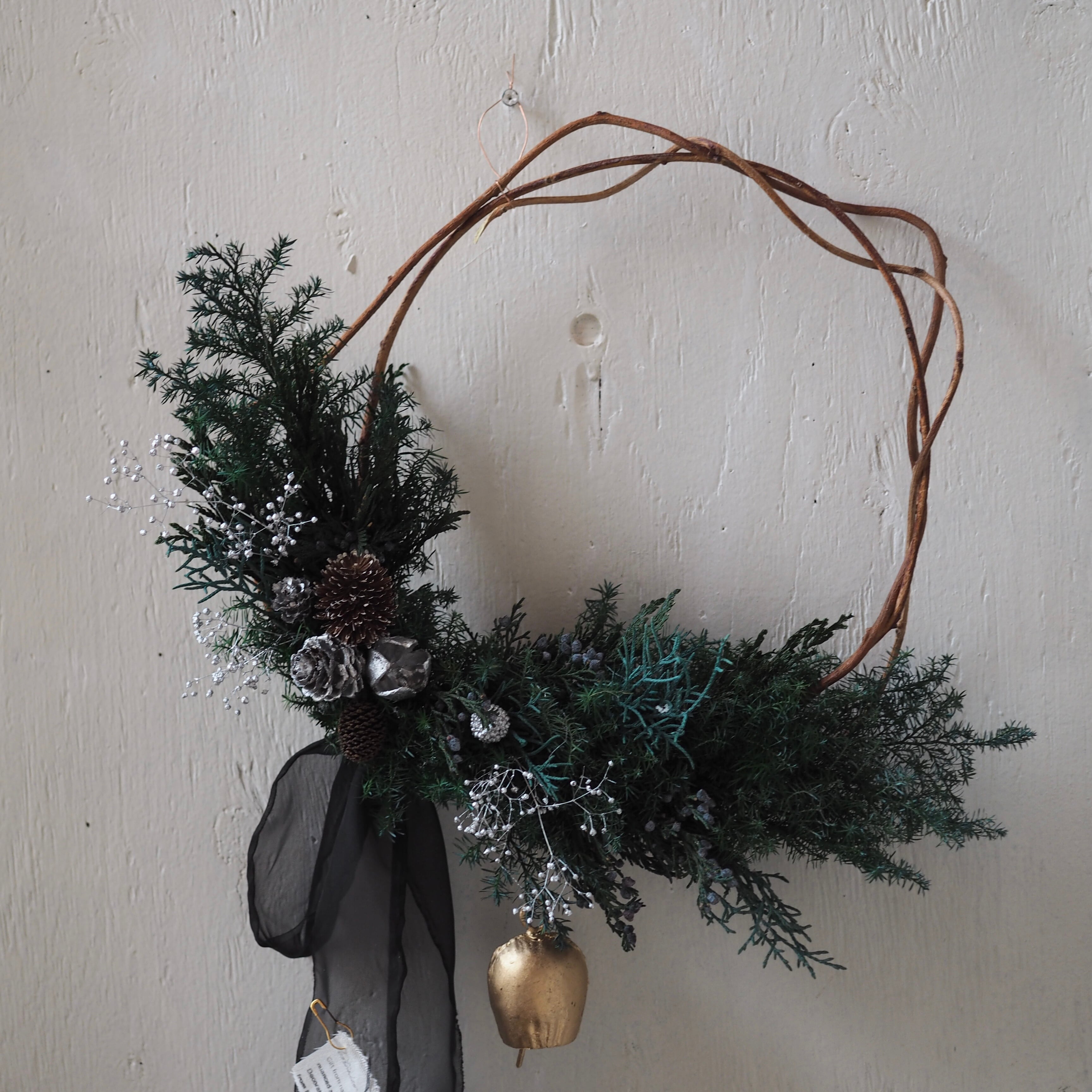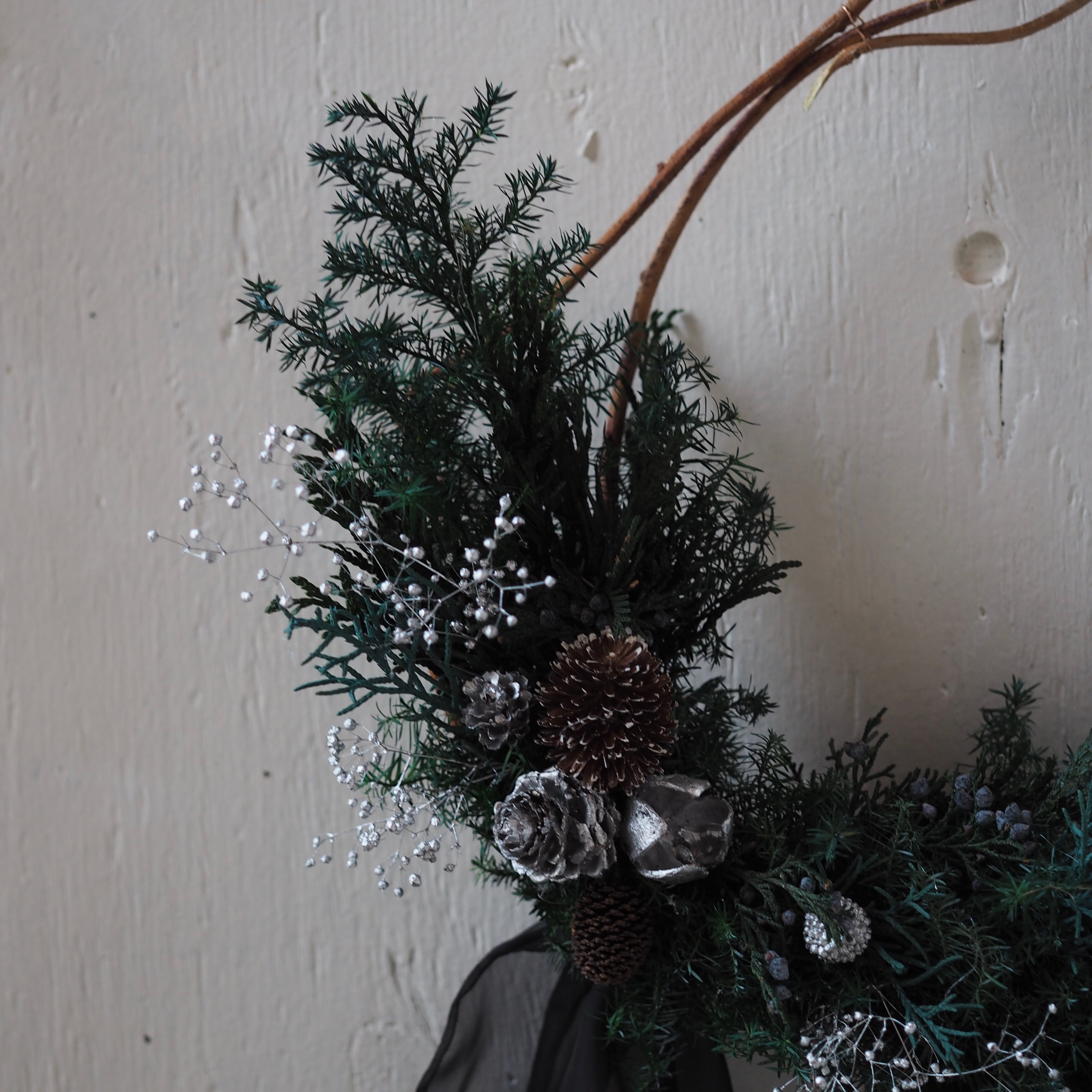 プリザーブドグリーンのマウンテンジュニパーやヒムロスギをベースに、木の実をあしらったナチュラルなクリスマスリース。