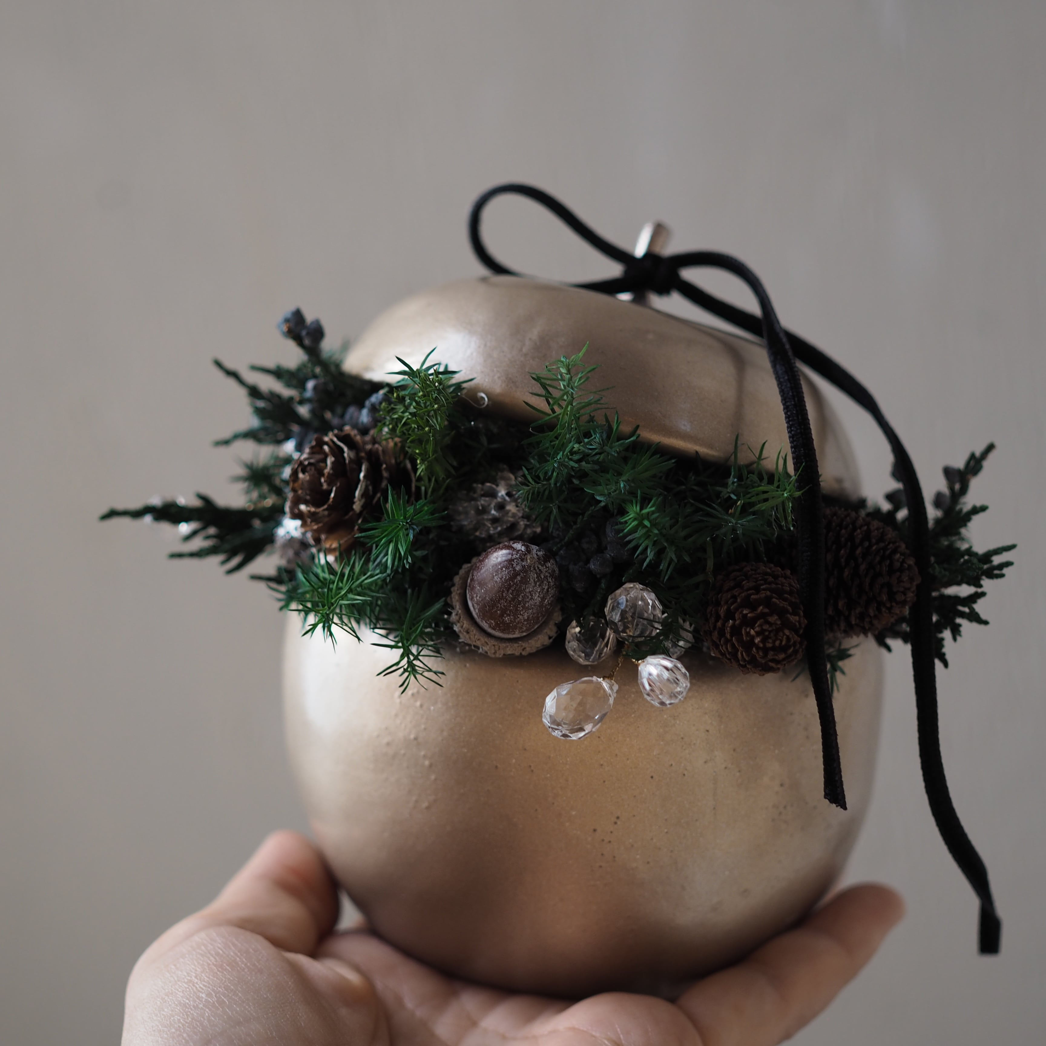 ぽってりとしたゴールドのりんごに、深みのある色合いの素材を合わせ、シックでオトナな印象のアレンジに。