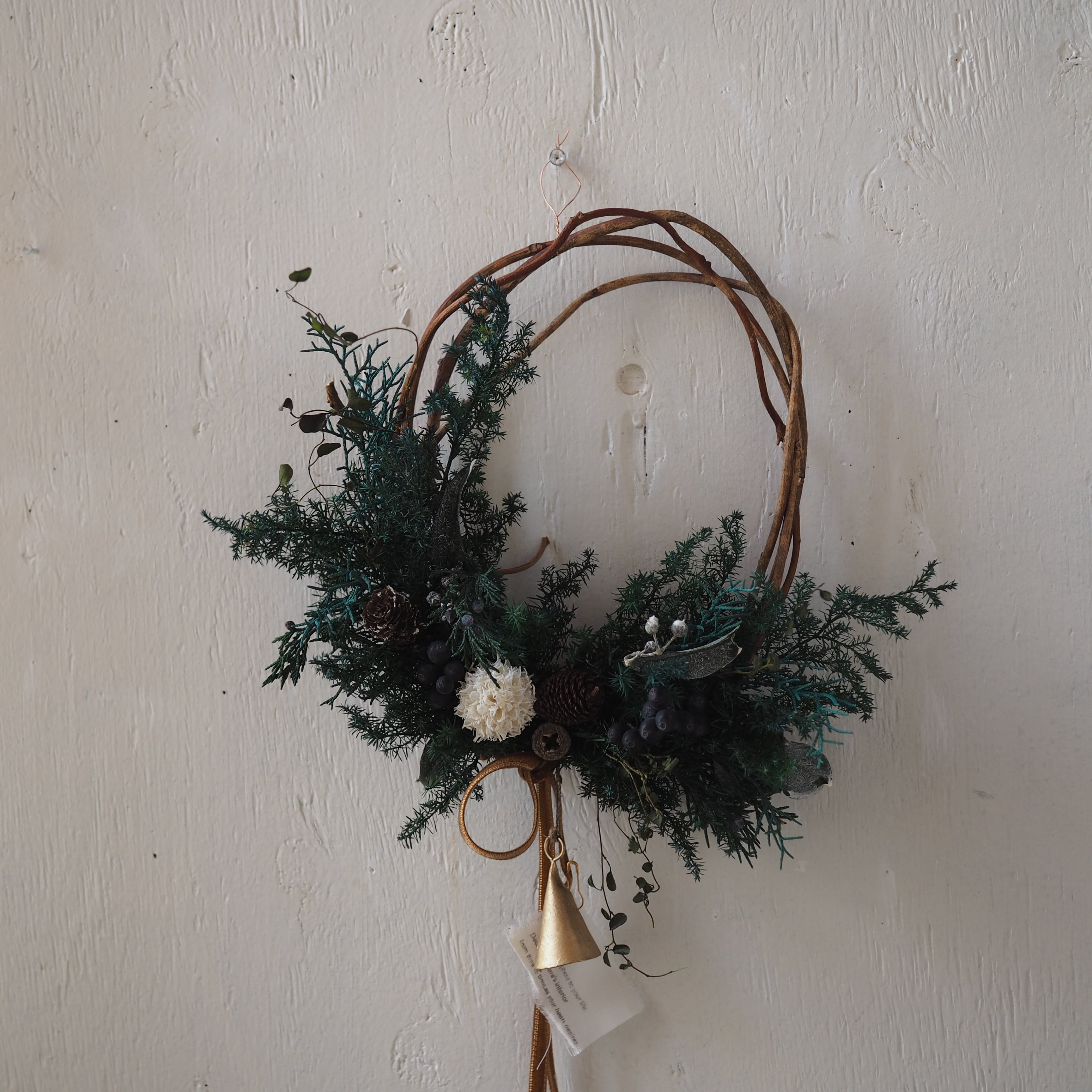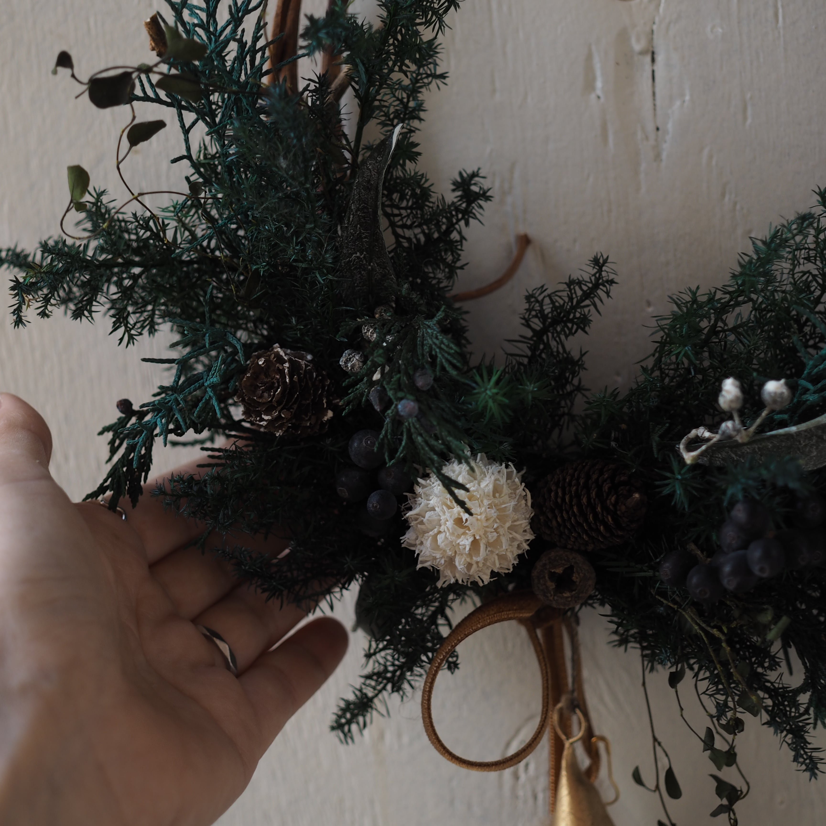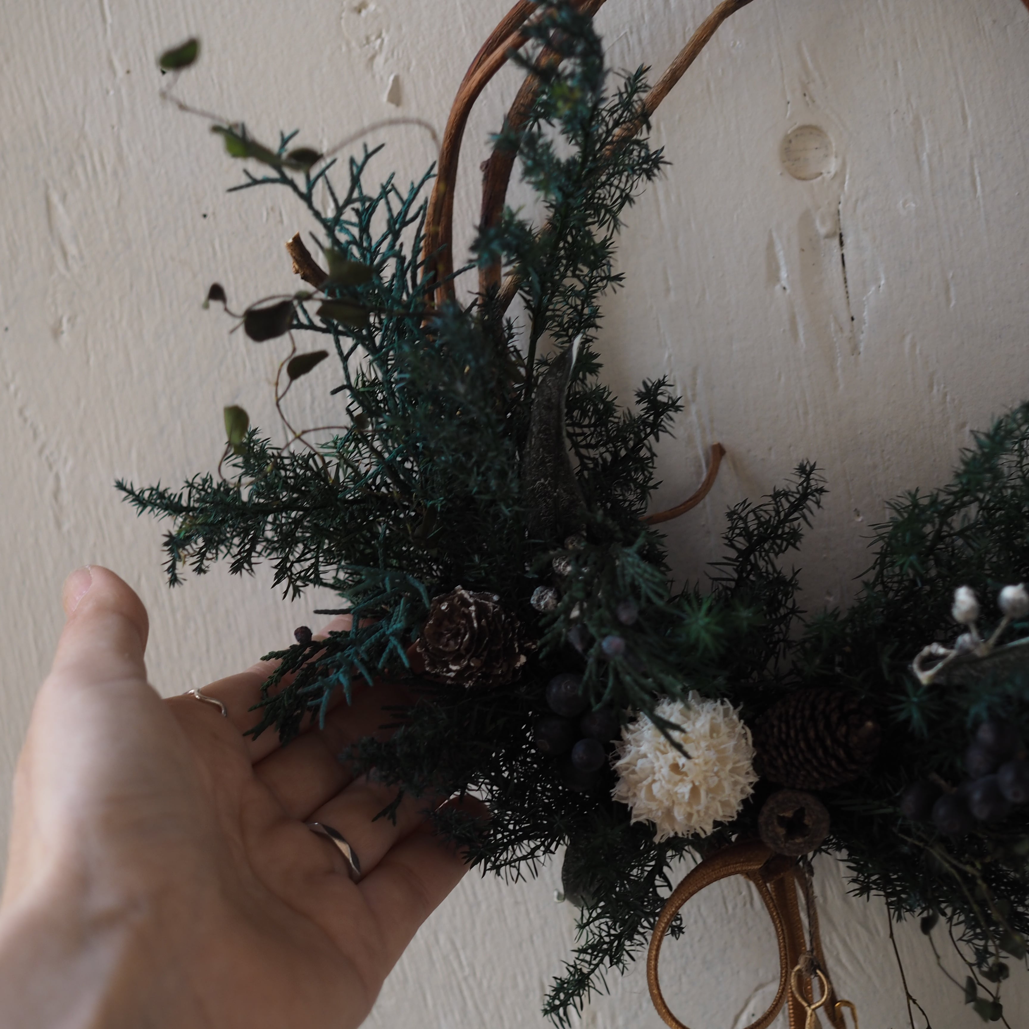 プリザーブドグリーンのマウンテンジュニパーやヒムロスギをベースに、木の実をあしらったナチュラルなクリスマスリース。