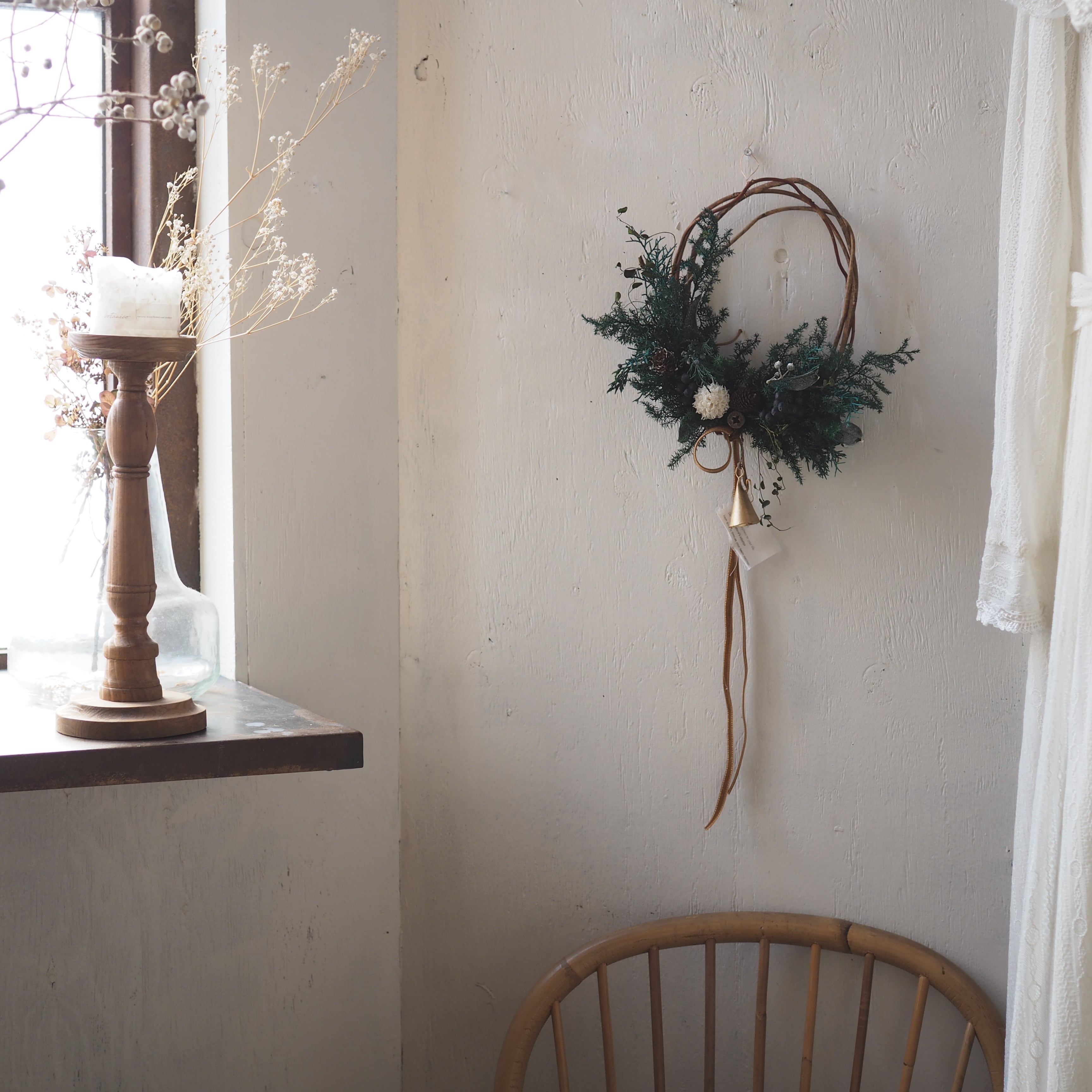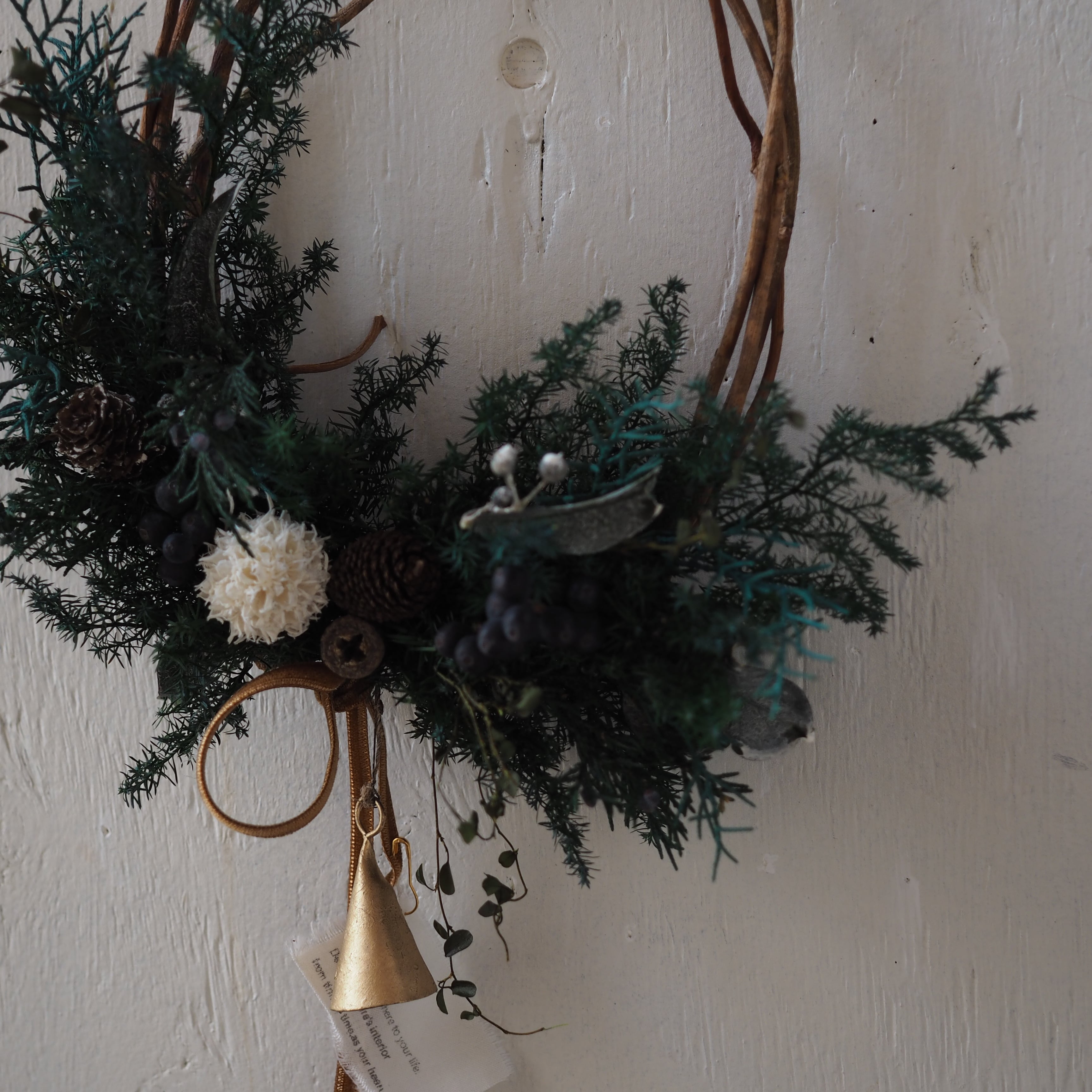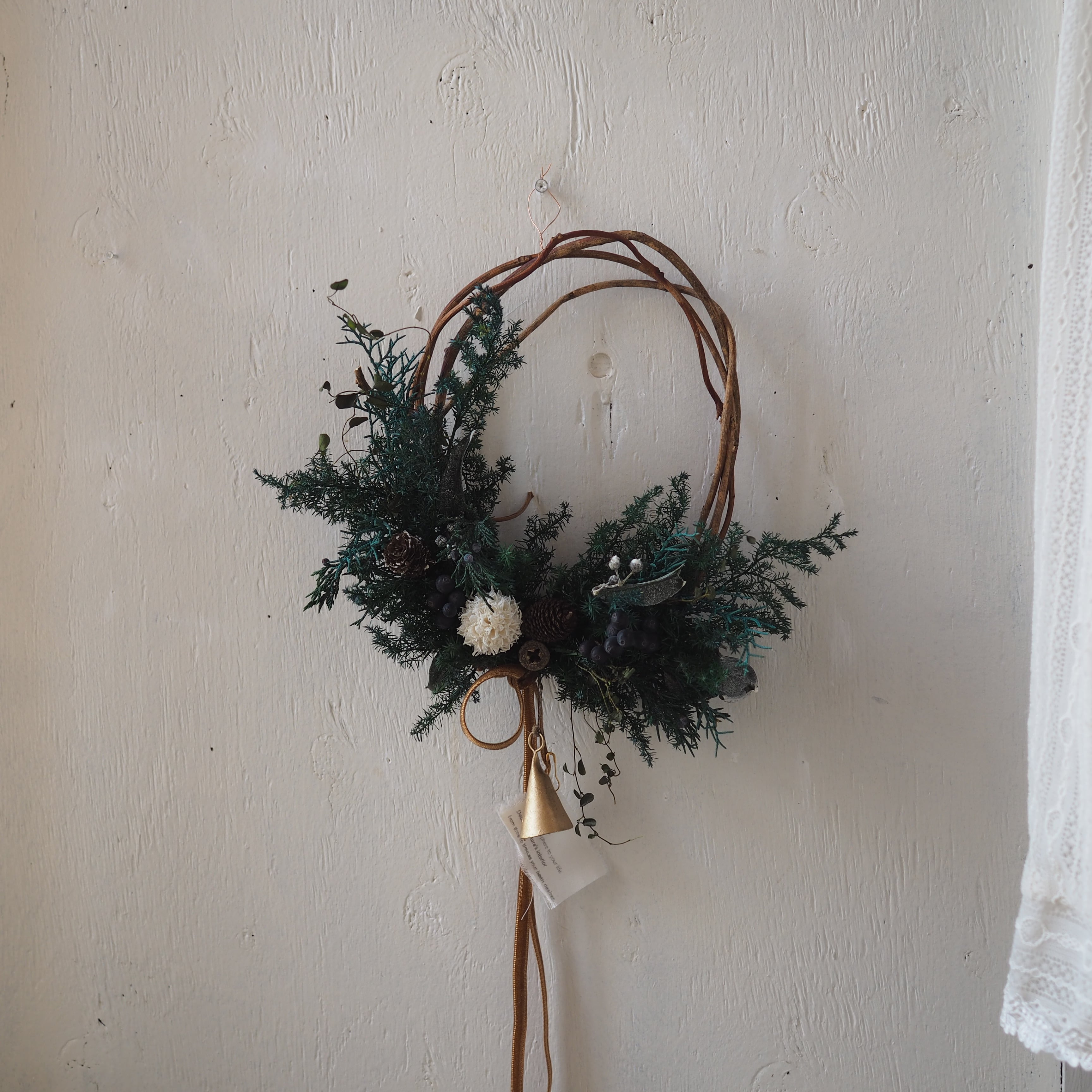プリザーブドグリーンのマウンテンジュニパーやヒムロスギをベースに、木の実をあしらったナチュラルなクリスマスリース。