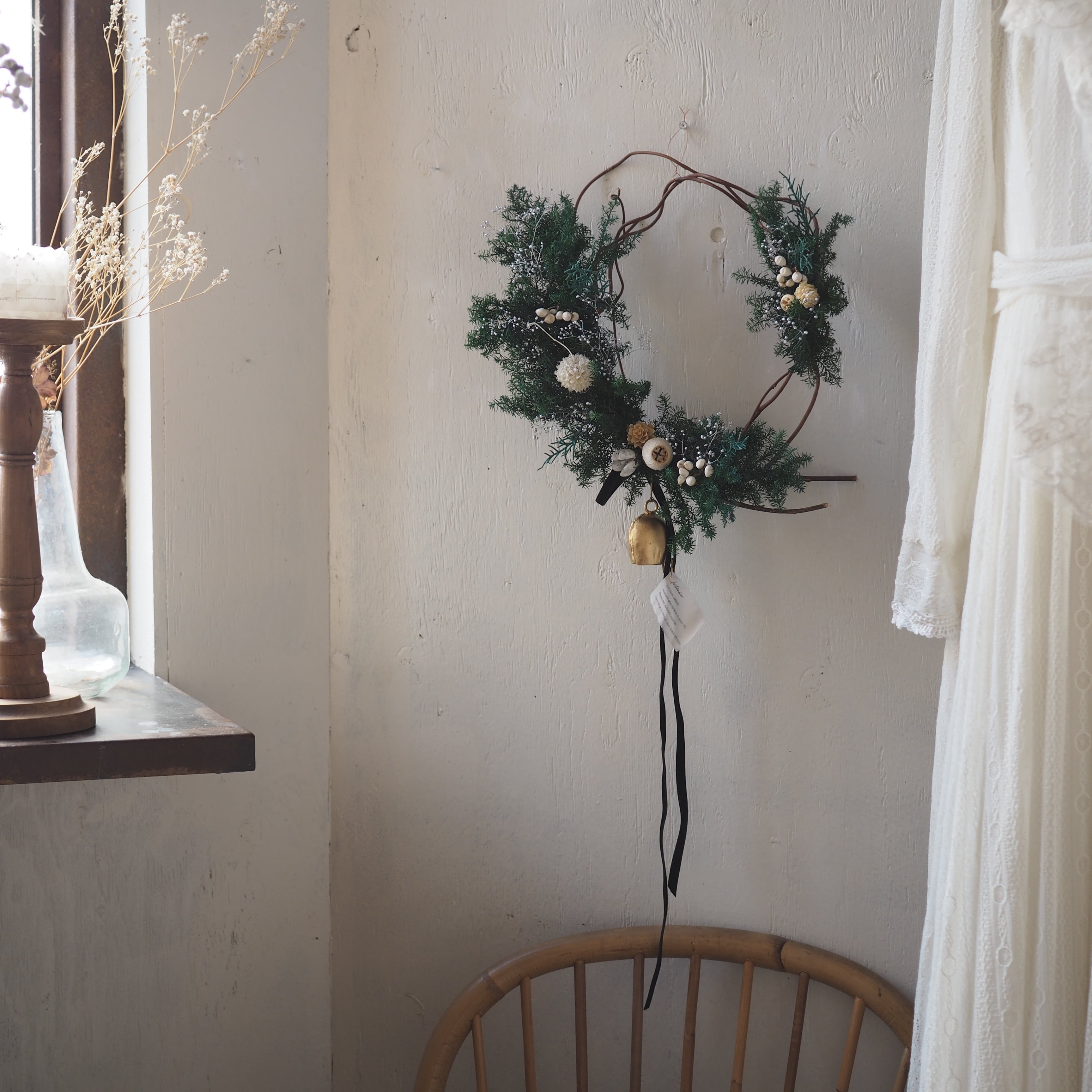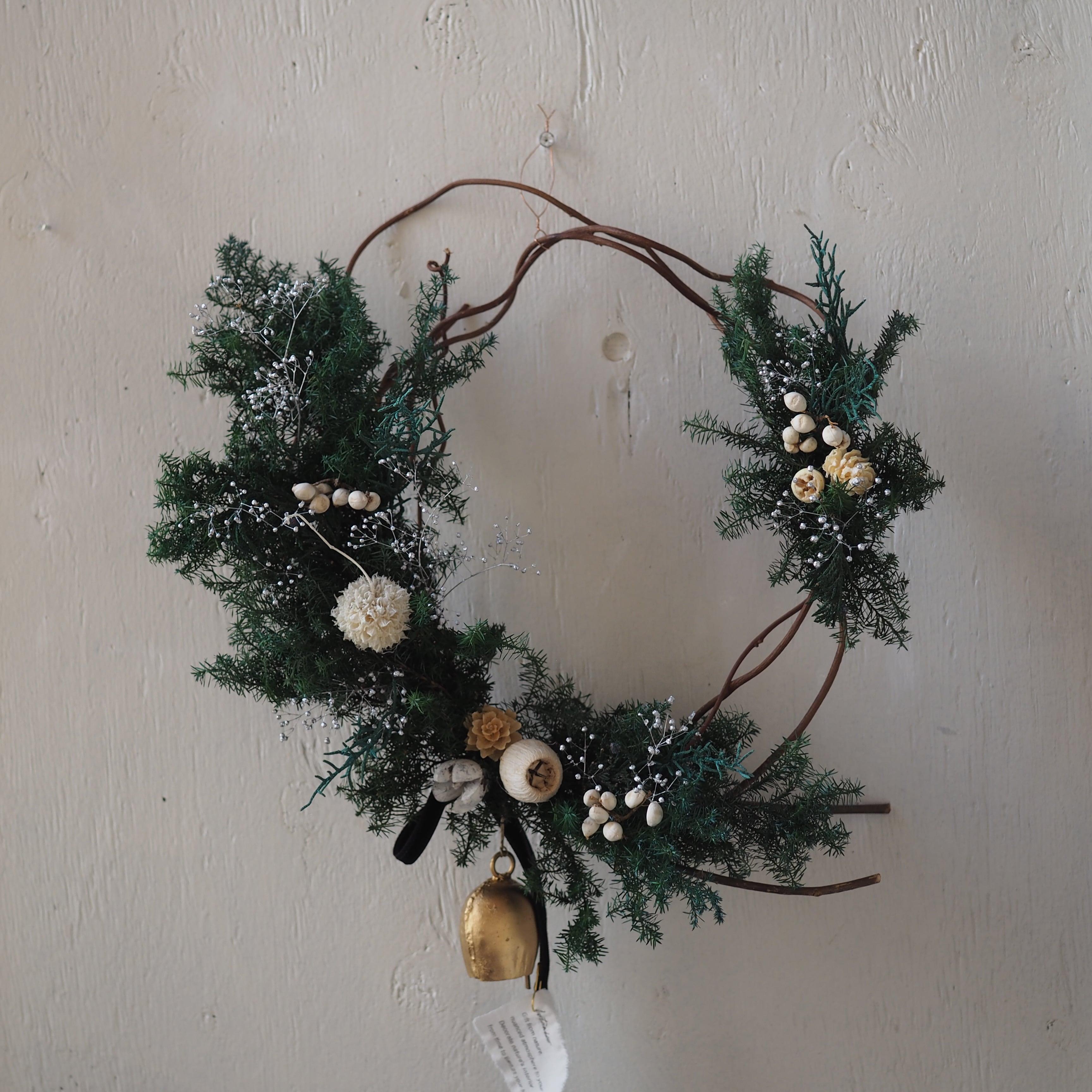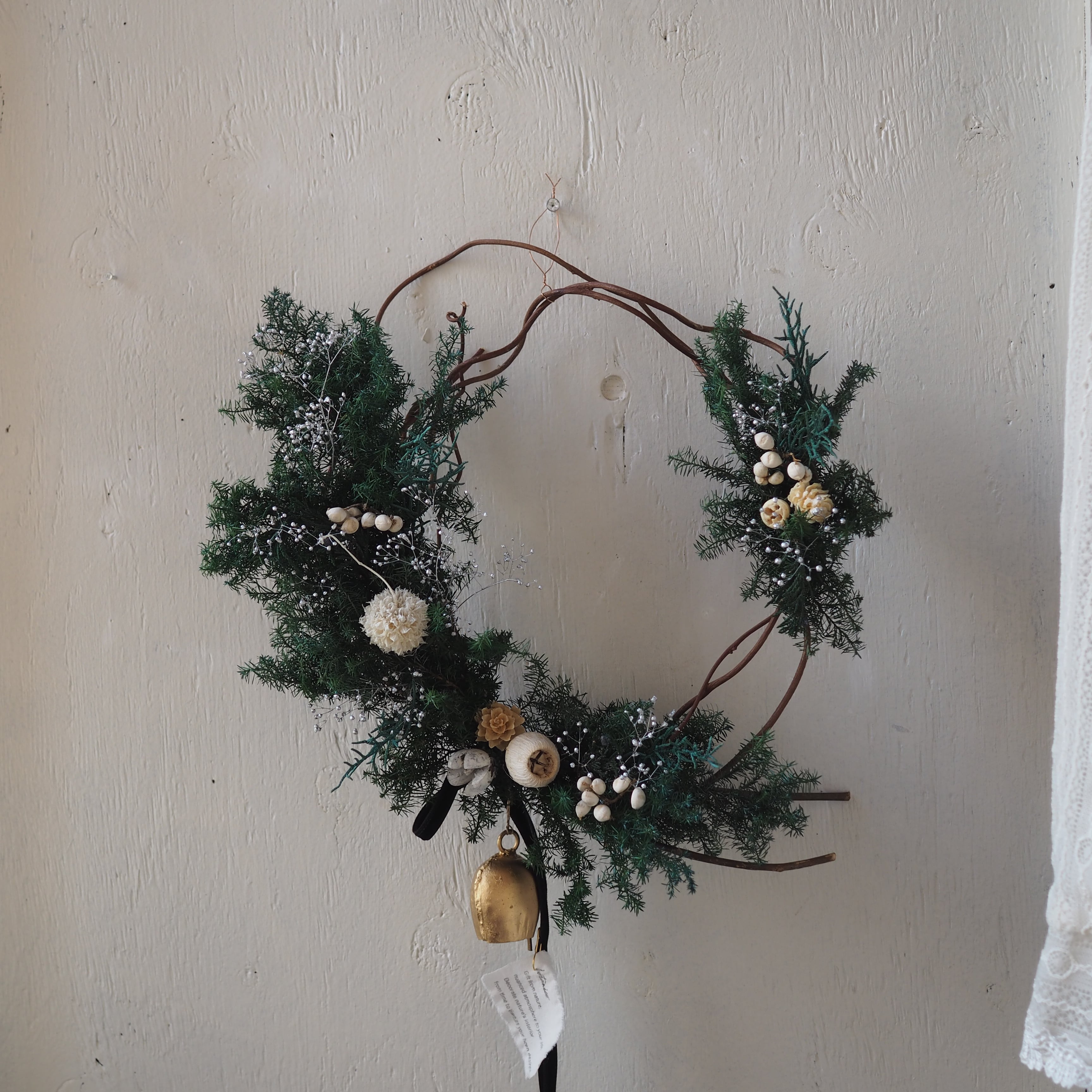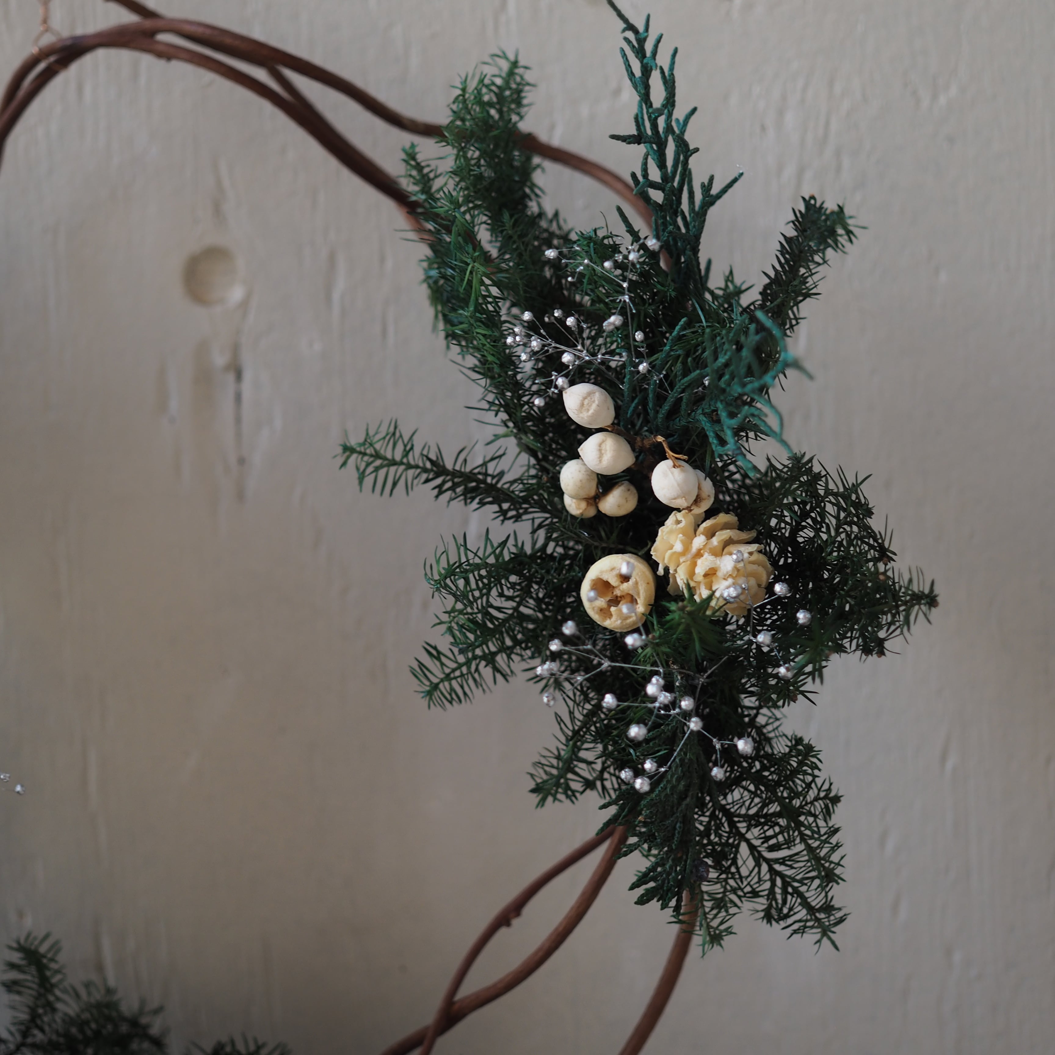 プリザーブドグリーンのマウンテンジュニパーやヒムロスギをベースに、木の実をあしらったナチュラルなクリスマスリース。