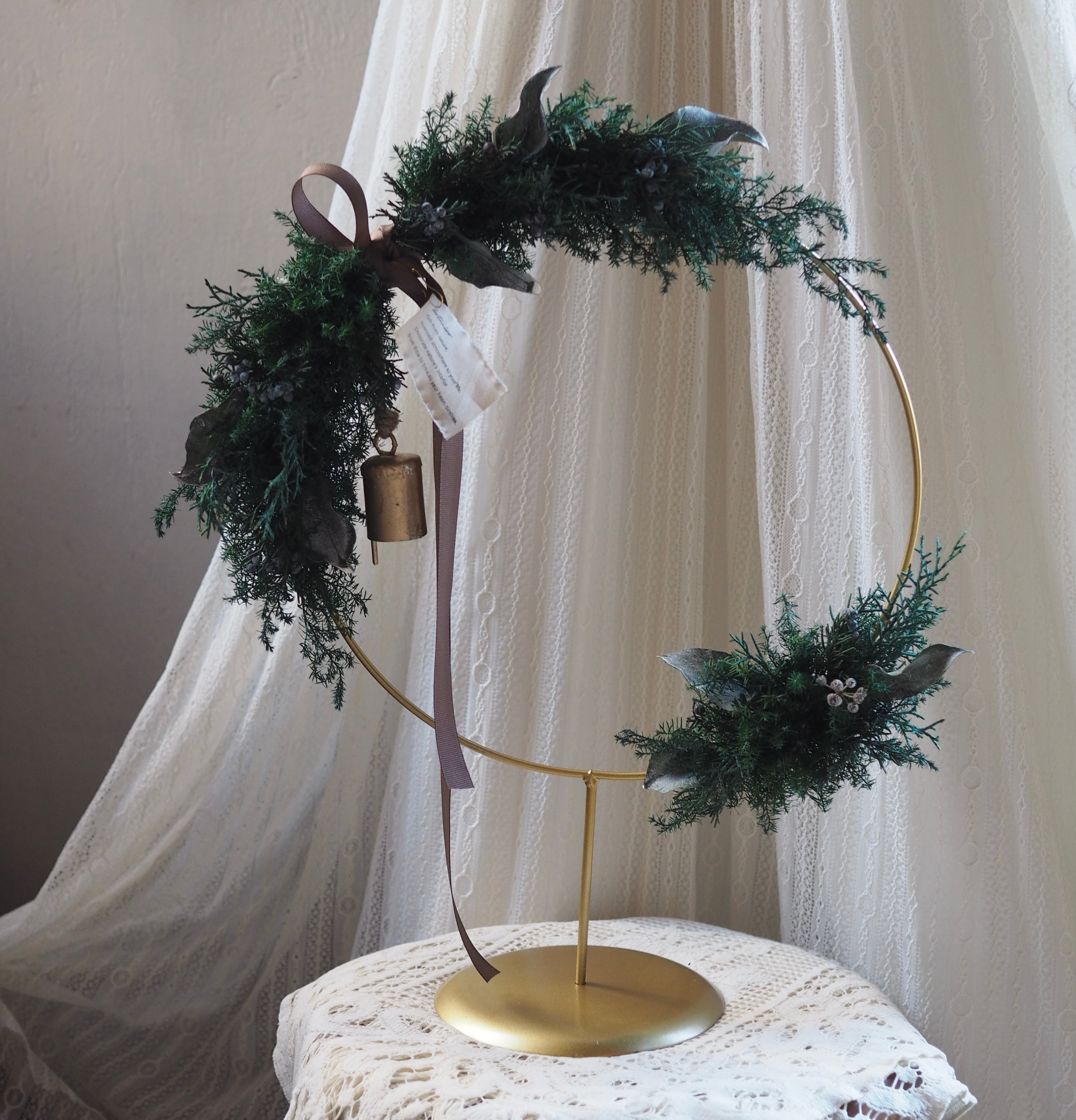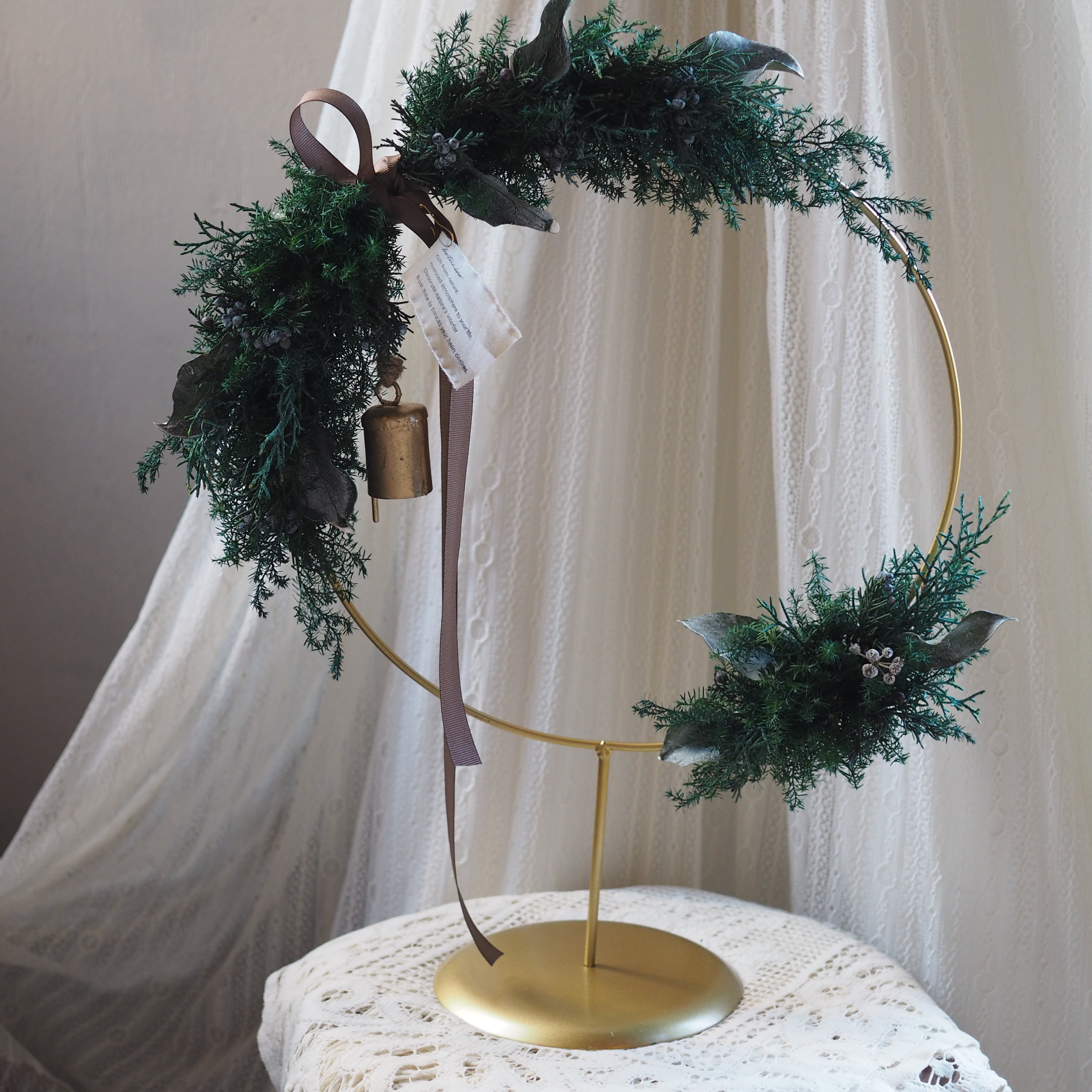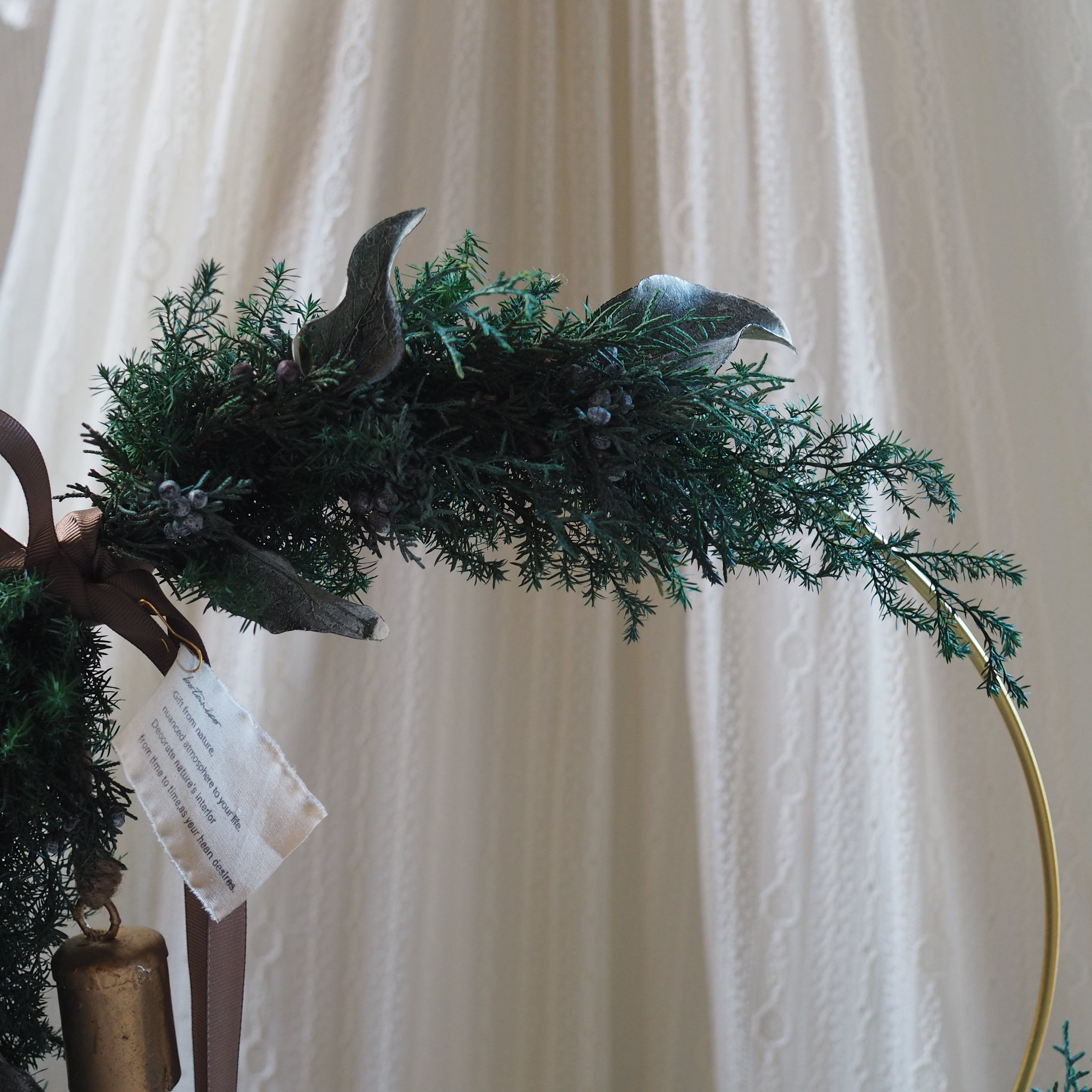 スタンドとリースベースが一体化したリーススタンドに、ヒムロスギやマウンテンジュニパー、ブルーアイスなどのプリザーブドグリーンをあしらいました。