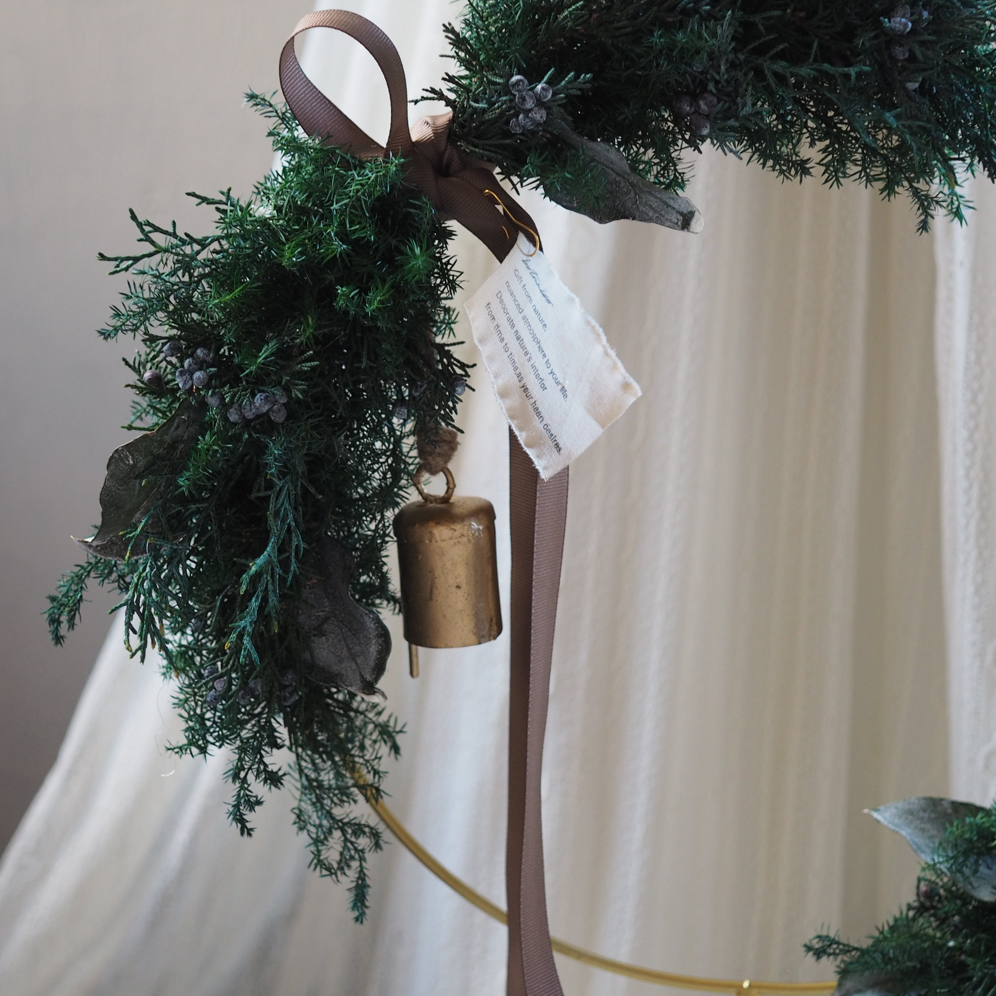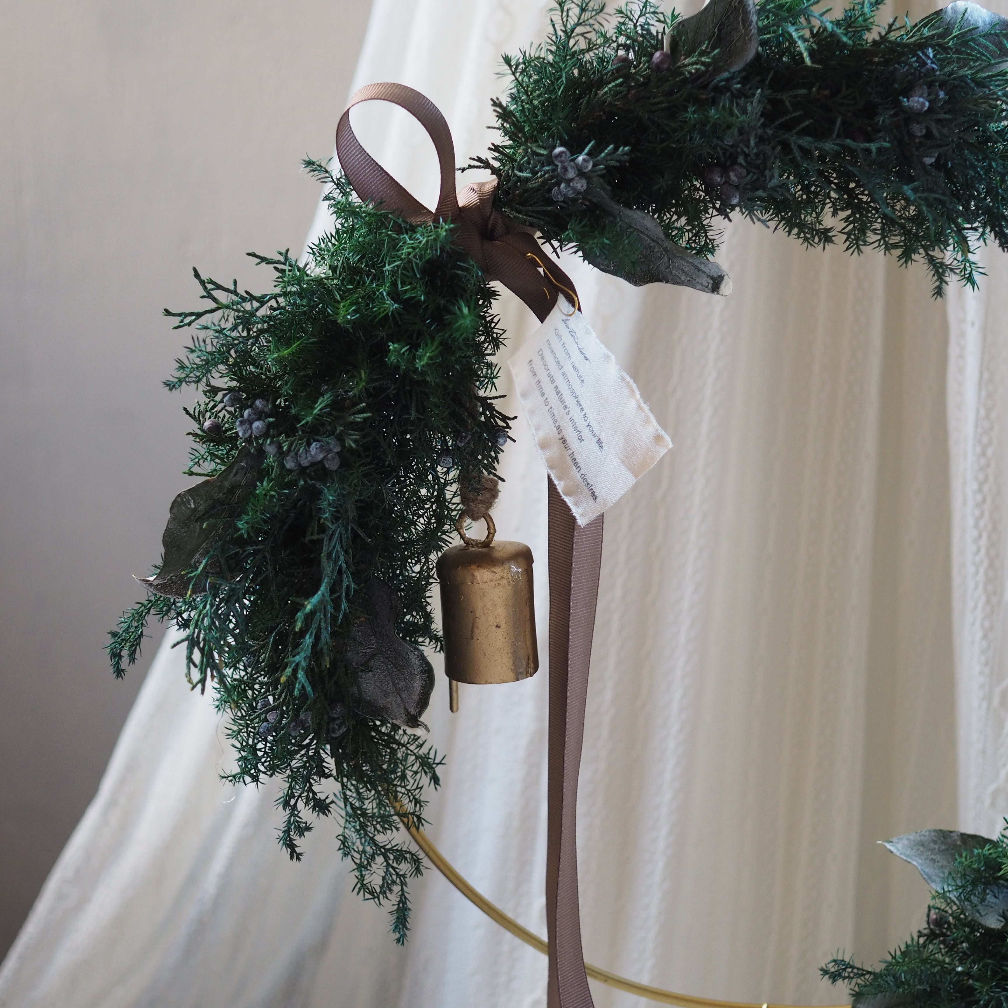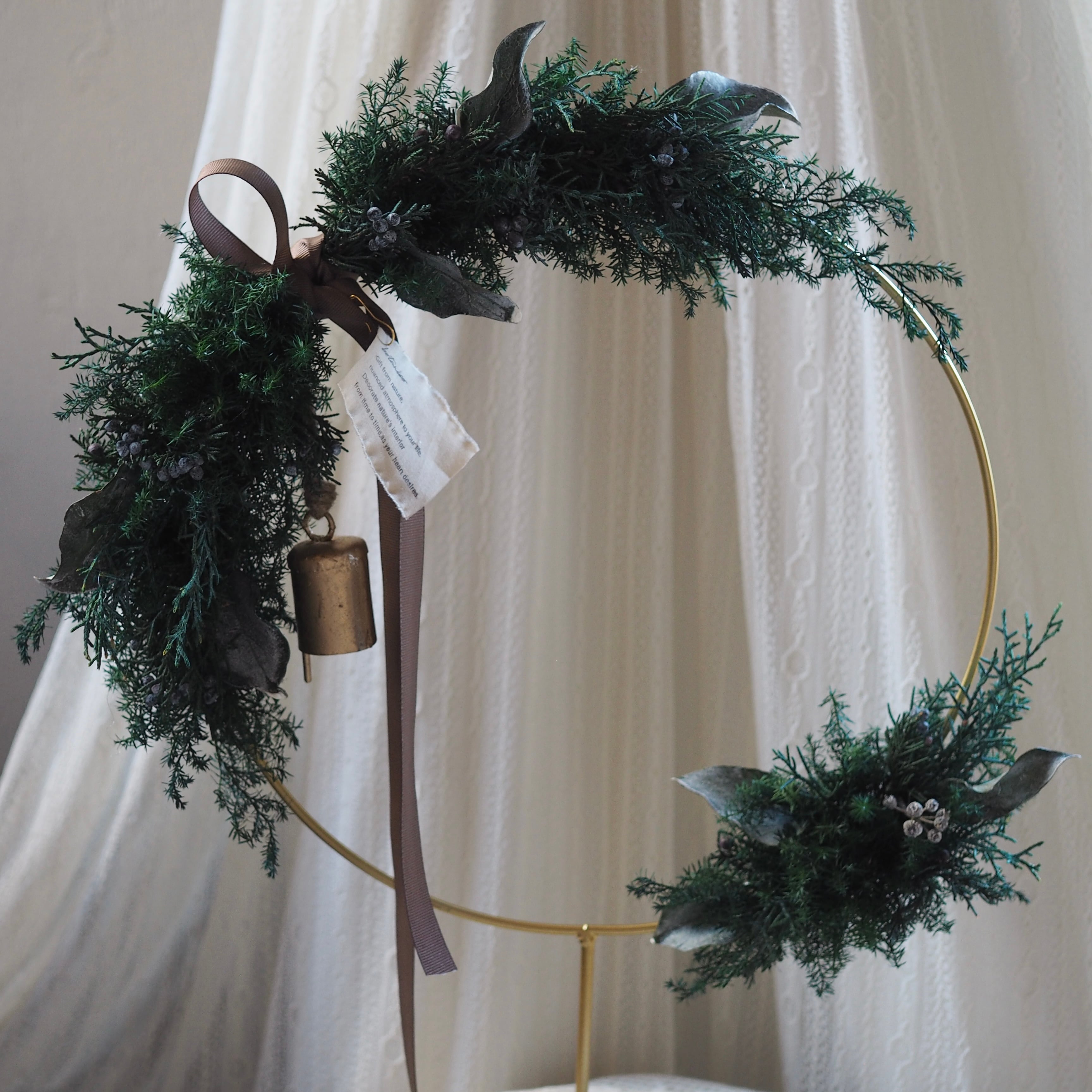 スタンドとリースベースが一体化したリーススタンドに、ヒムロスギやマウンテンジュニパー、ブルーアイスなどのプリザーブドグリーンをあしらいました。