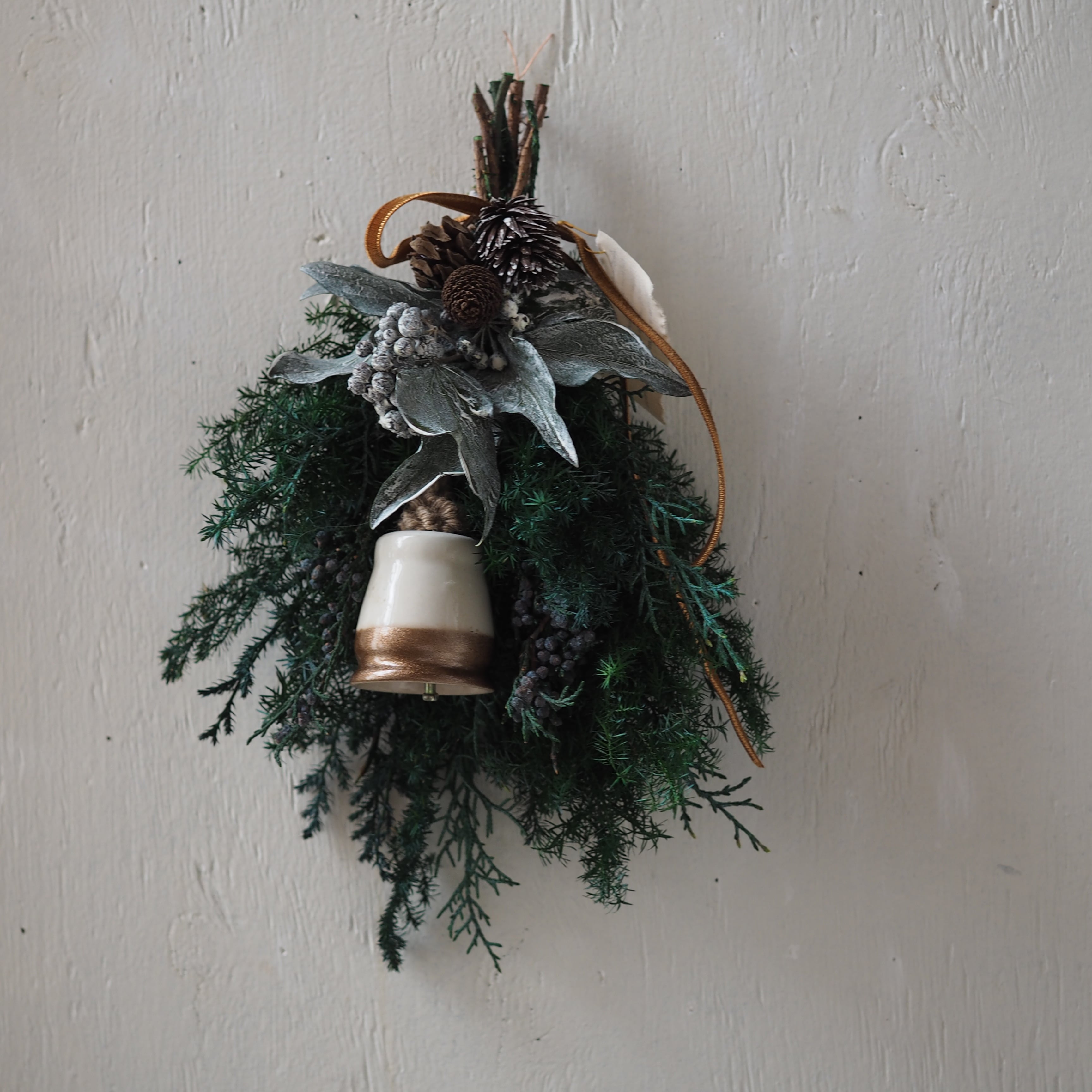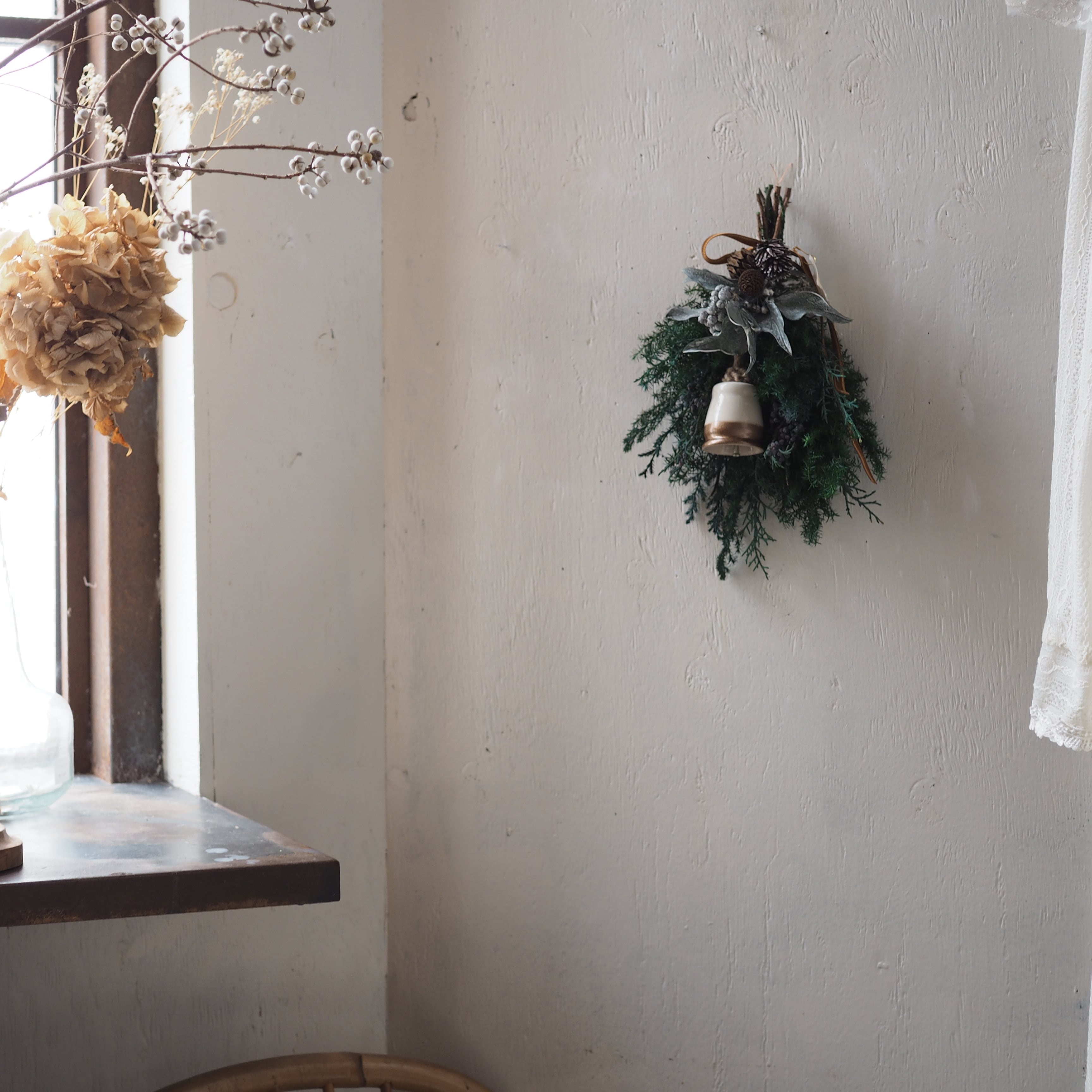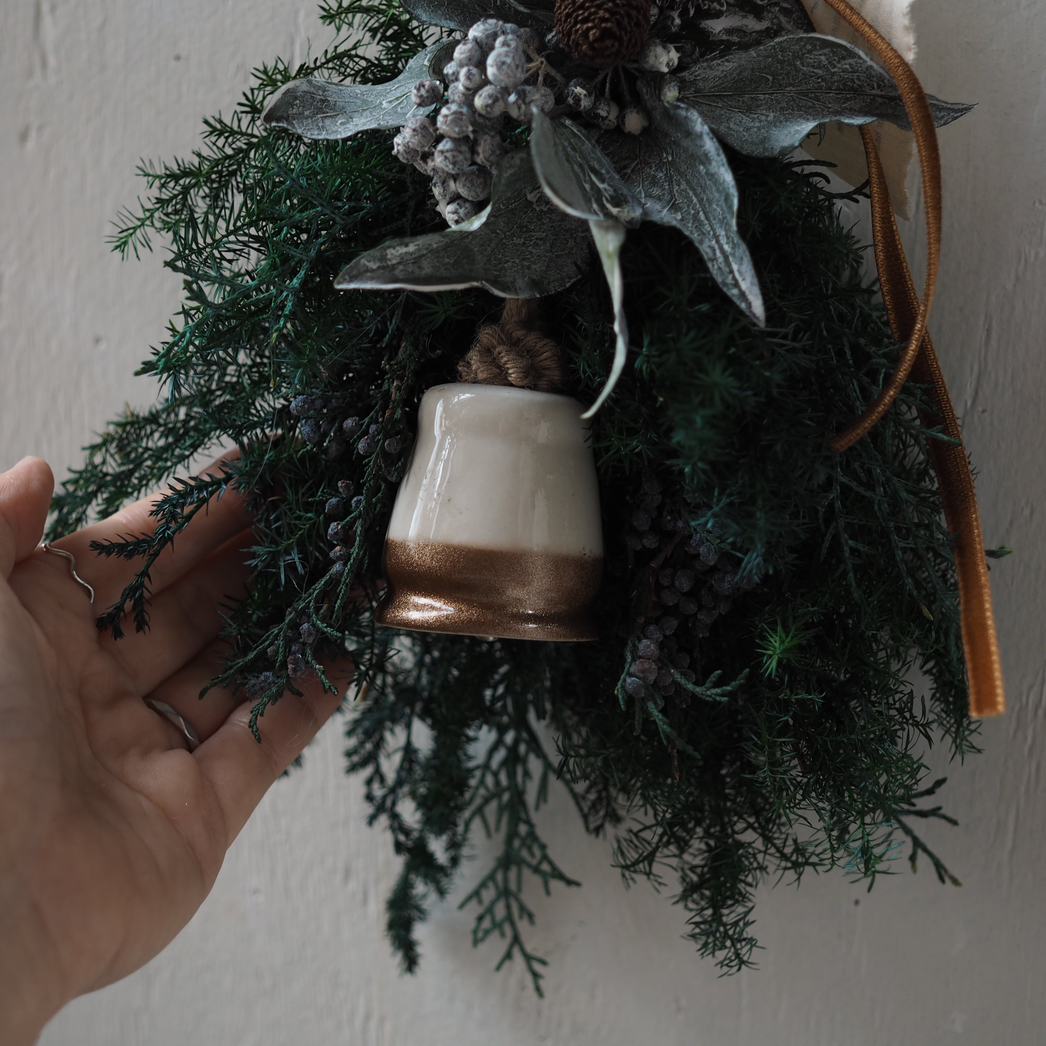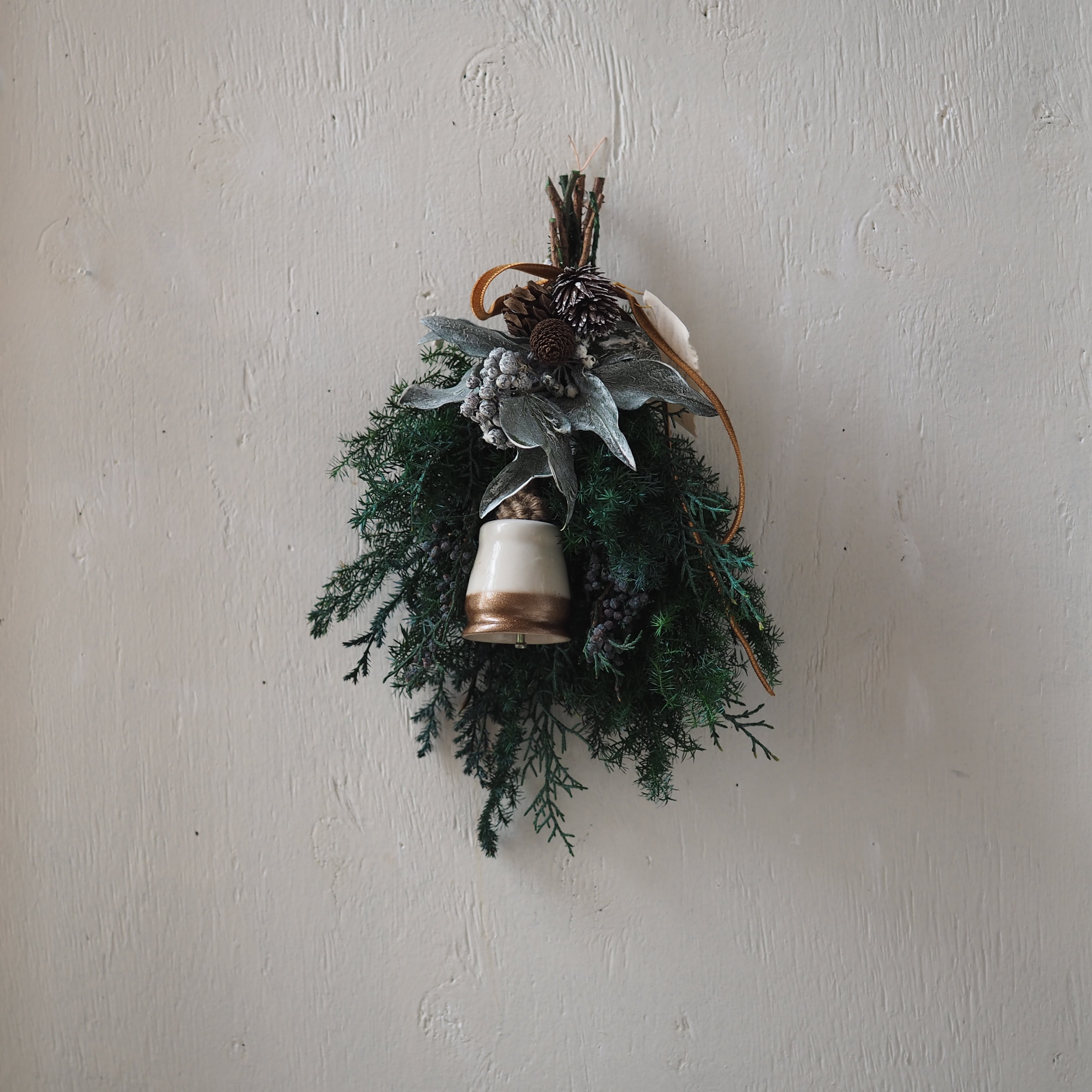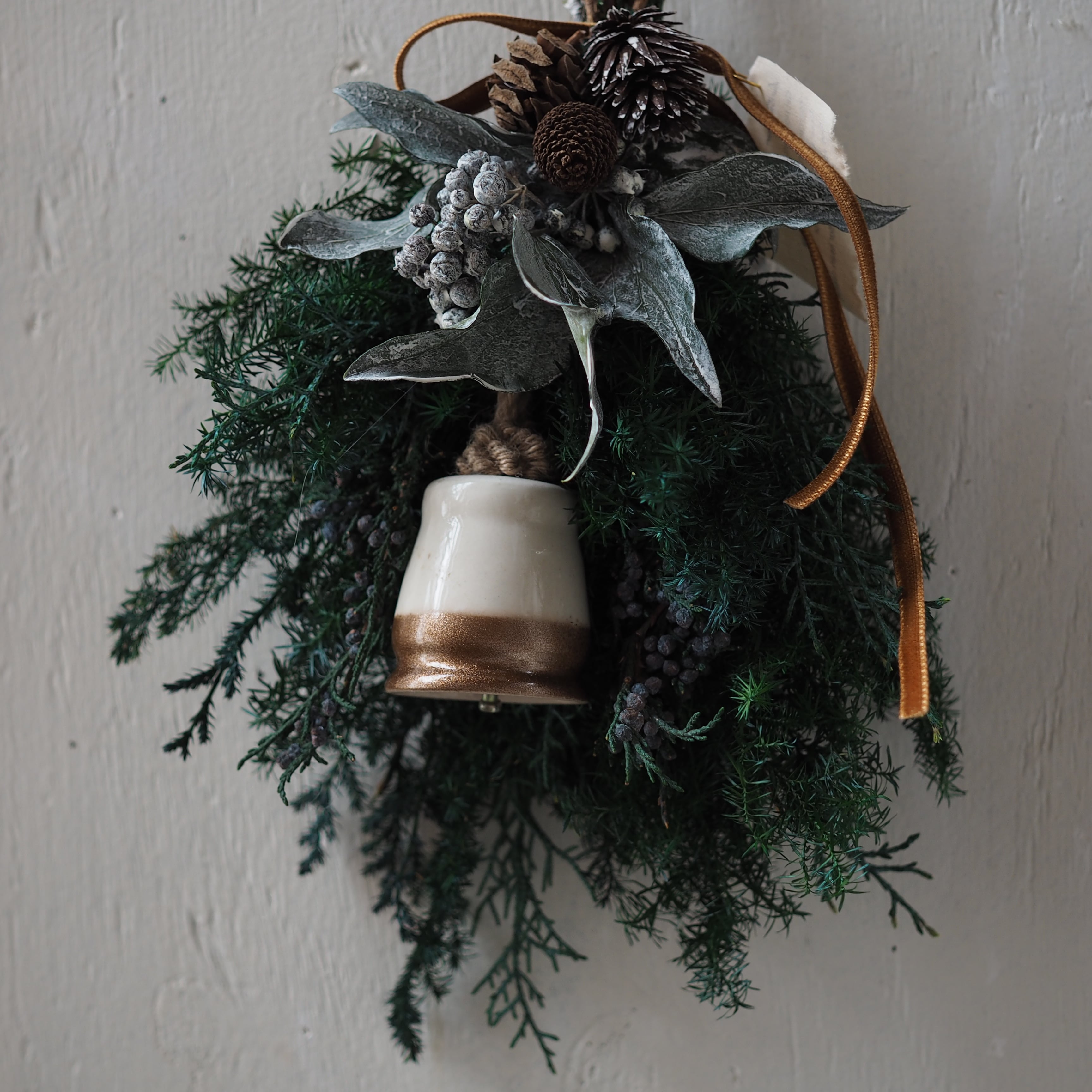 温かみのあるベルと、深いグリーンのコントラストが美しく、クリスマスシーズンのデコレーションにもおすすめです。