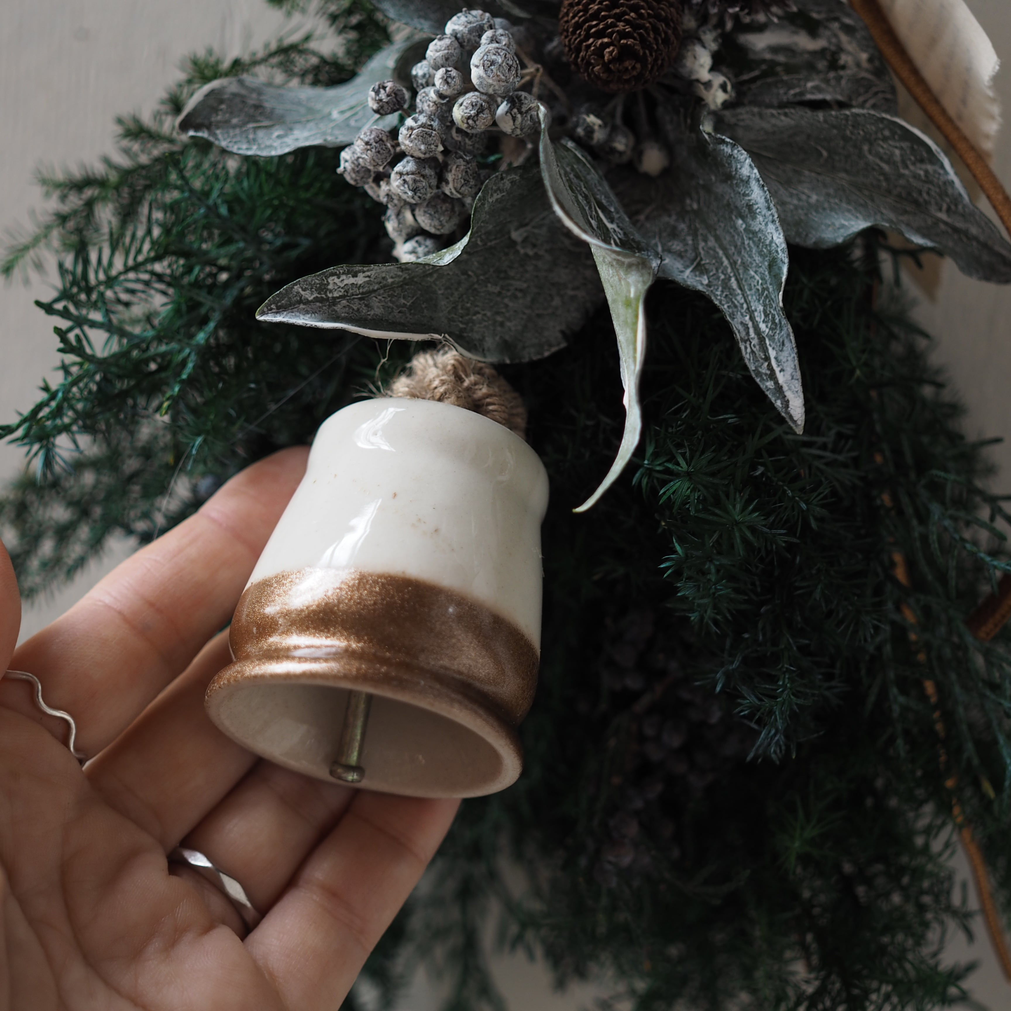 陶器のベルをつけた、シックなクリスマススワッグ。