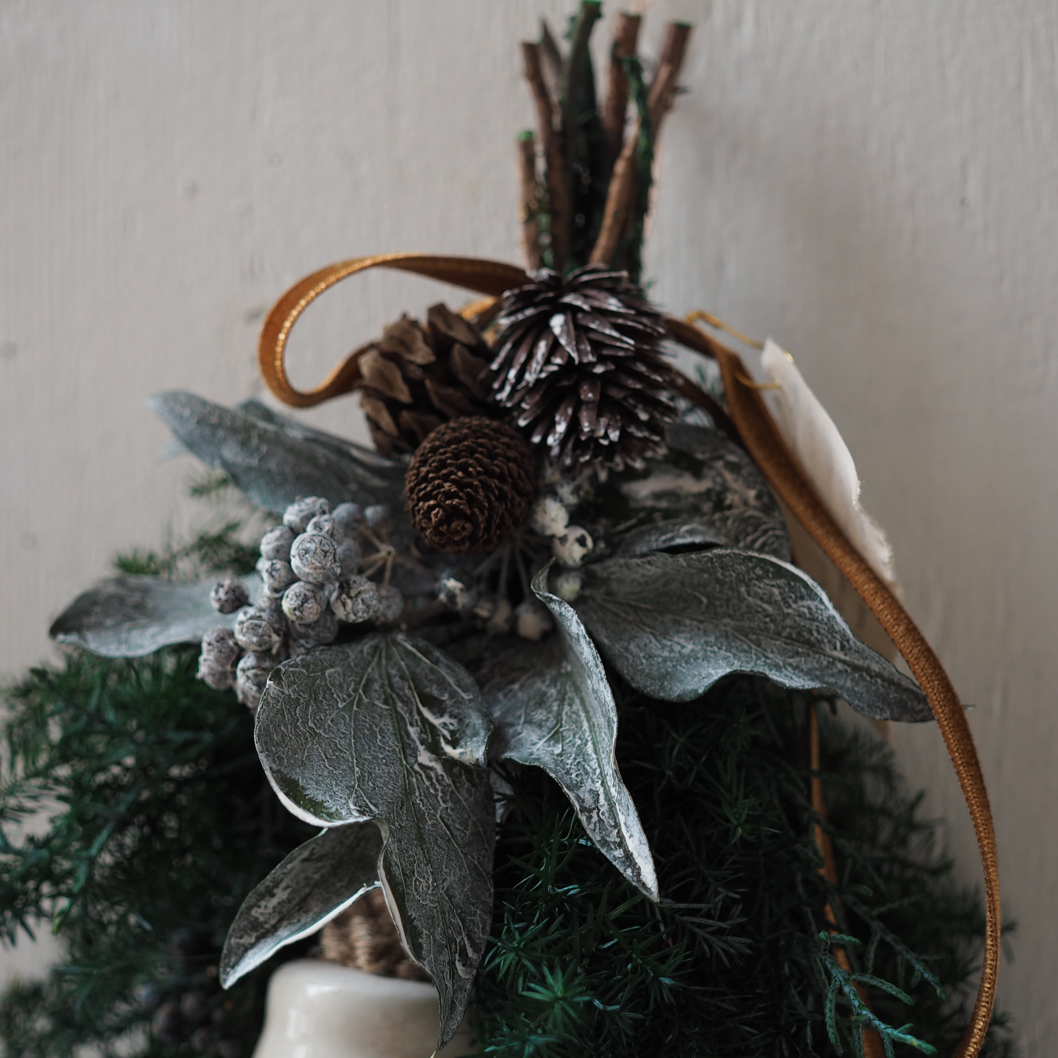 プリザーブドのマウンテンジュニパーやヒムロスギを束ねて、冬らしい森の香りを感じるようなデザインにしました。