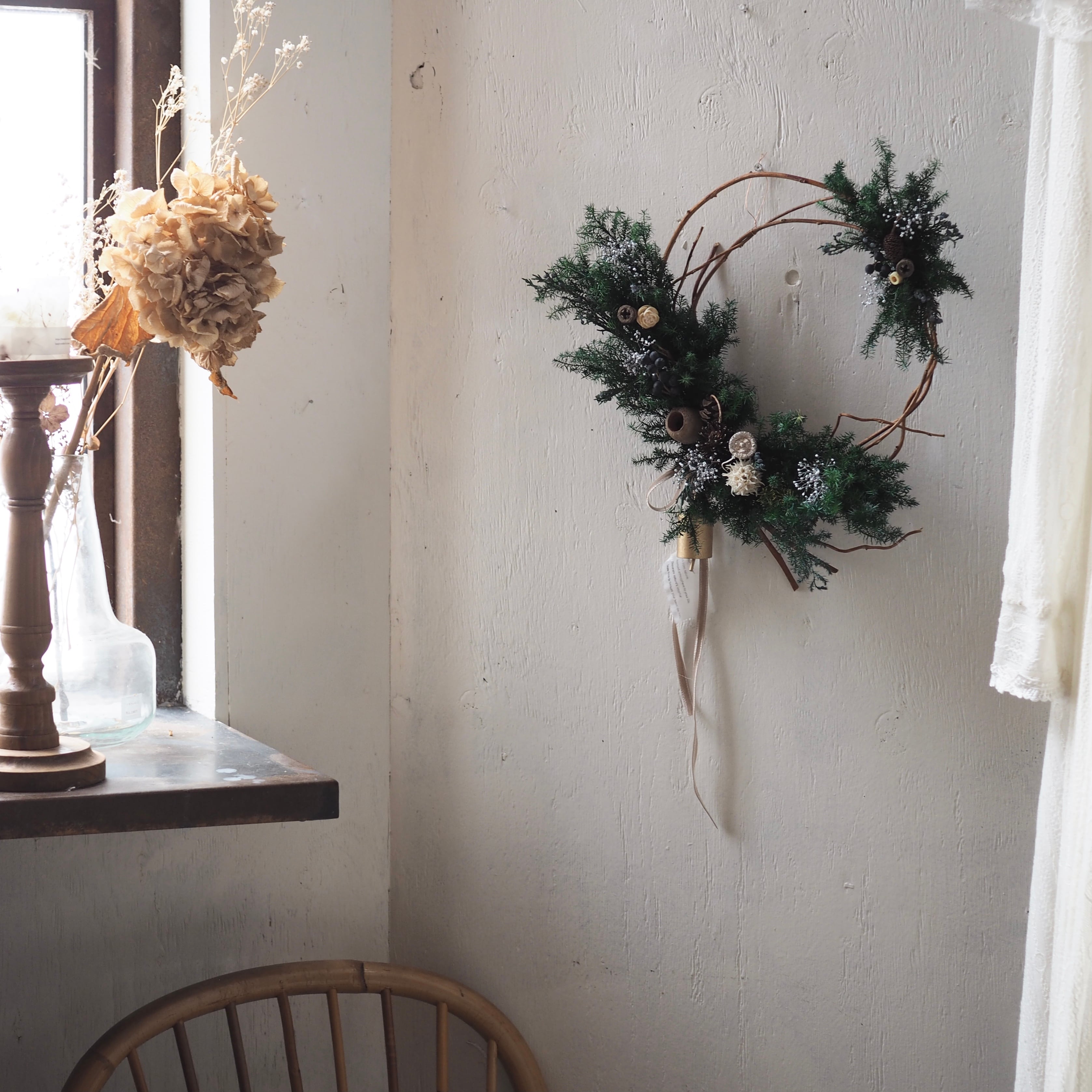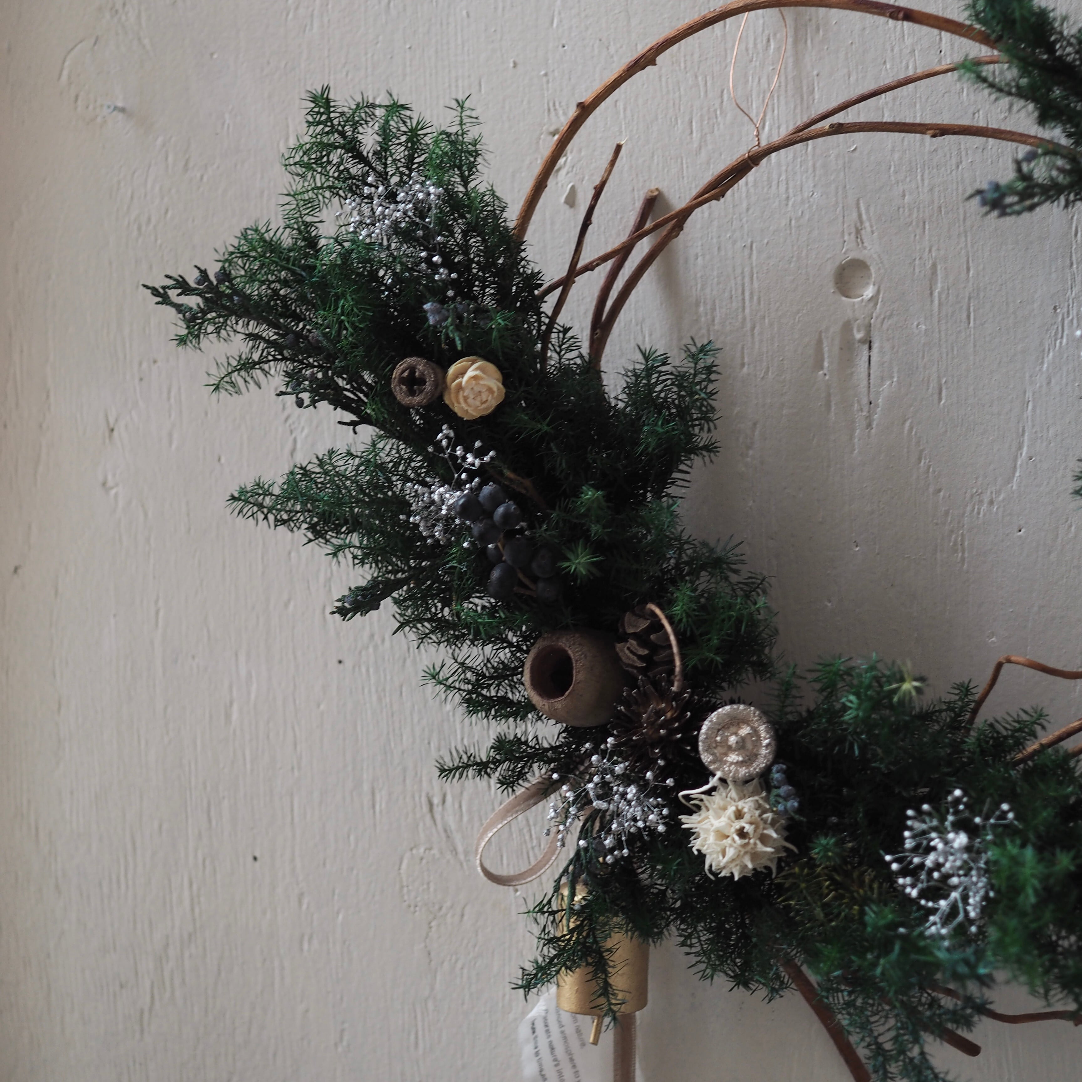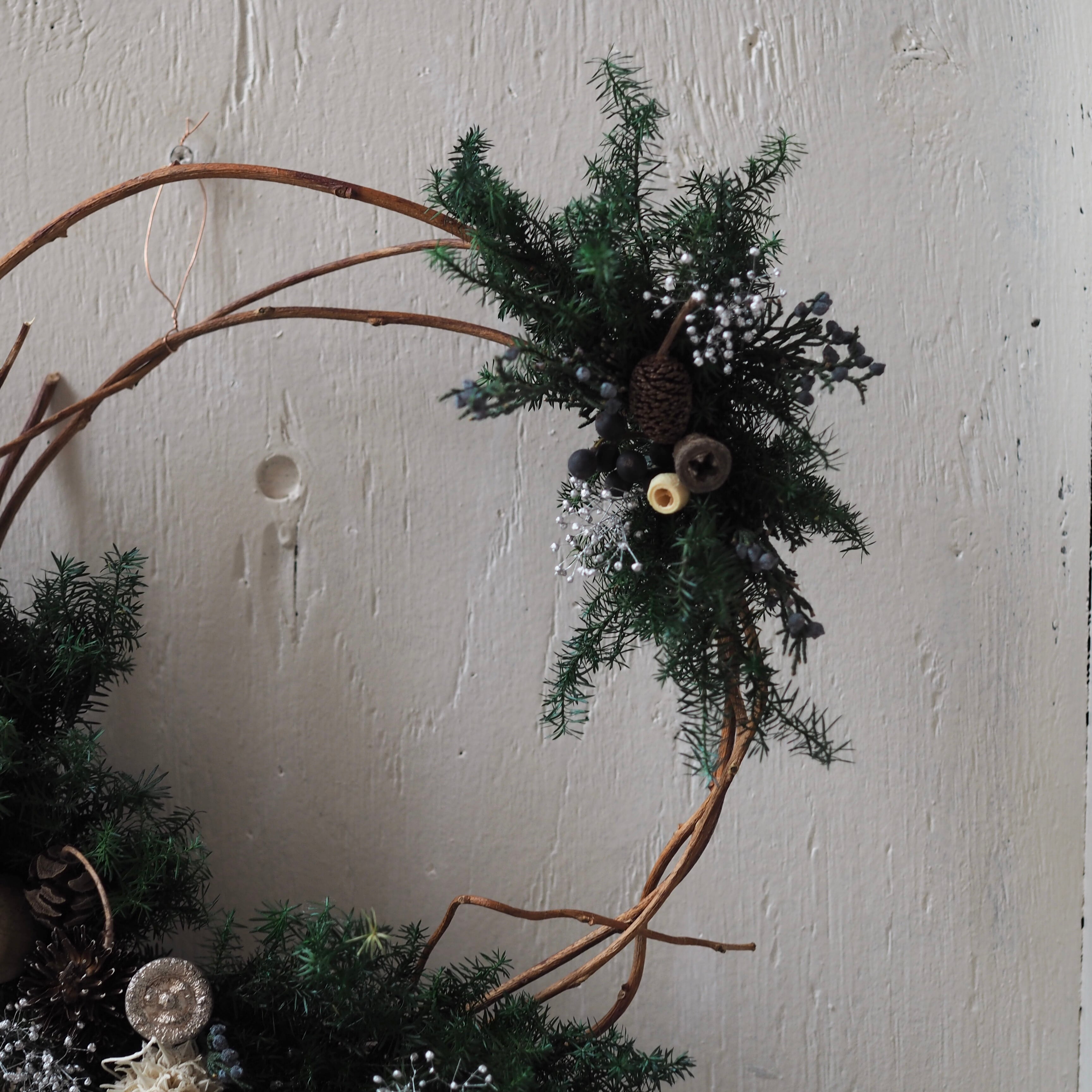 プリザーブドグリーンのマウンテンジュニパーやヒムロスギをベースに、木の実をあしらったナチュラルなクリスマスリース。