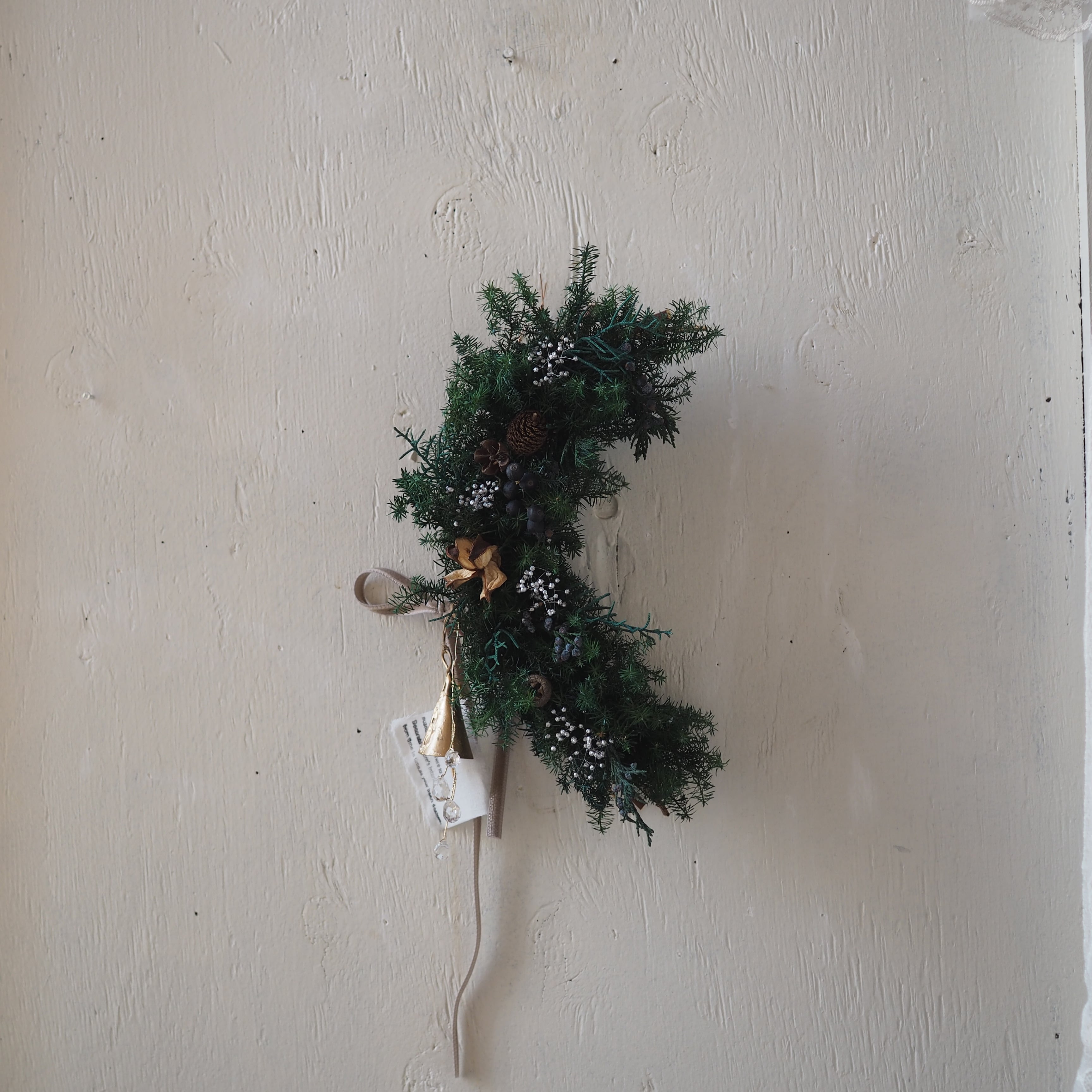 プリザーブドグリーンのヒムロスギやマウンテンジュニパーなど、針葉樹を使った三日月型の冬の壁掛けです。