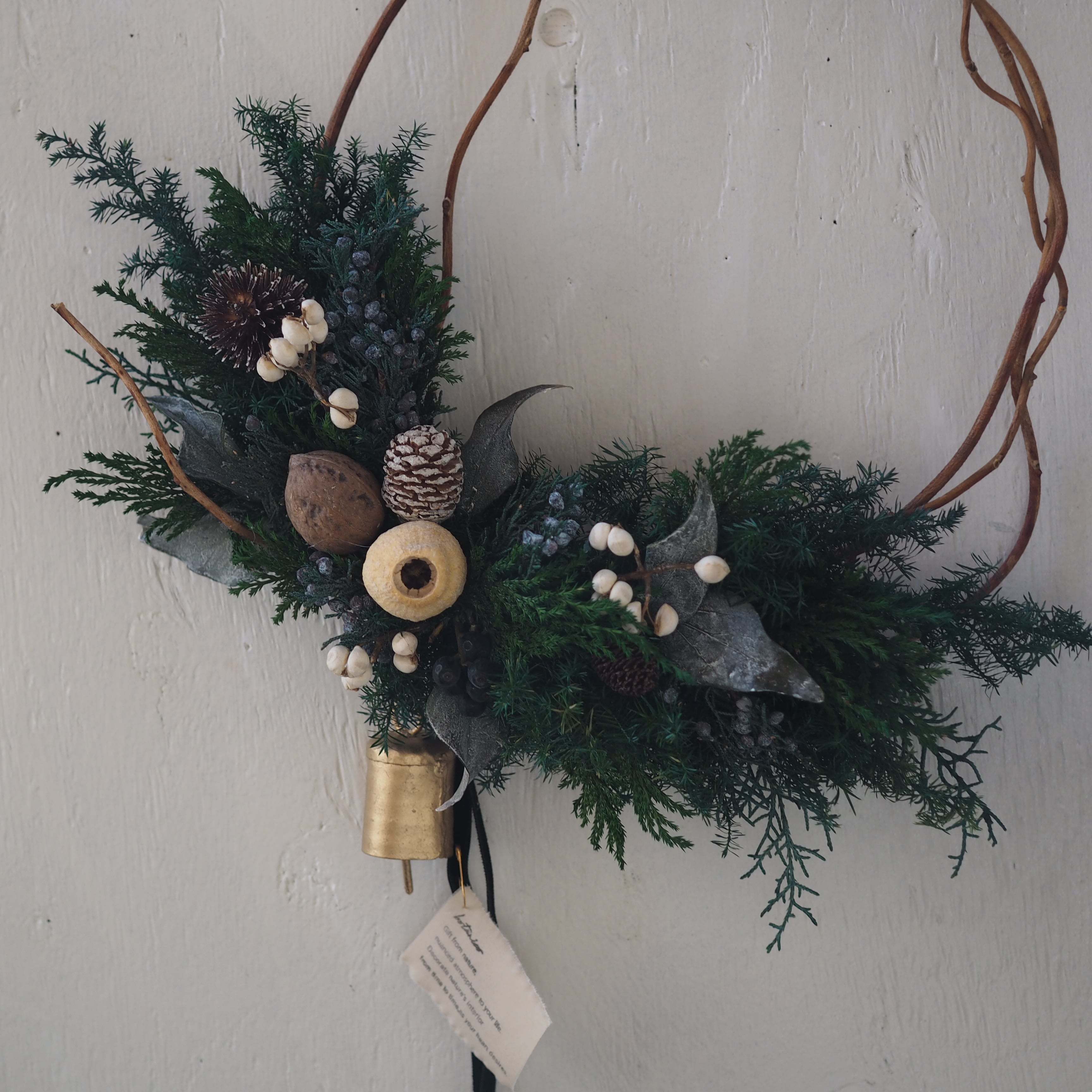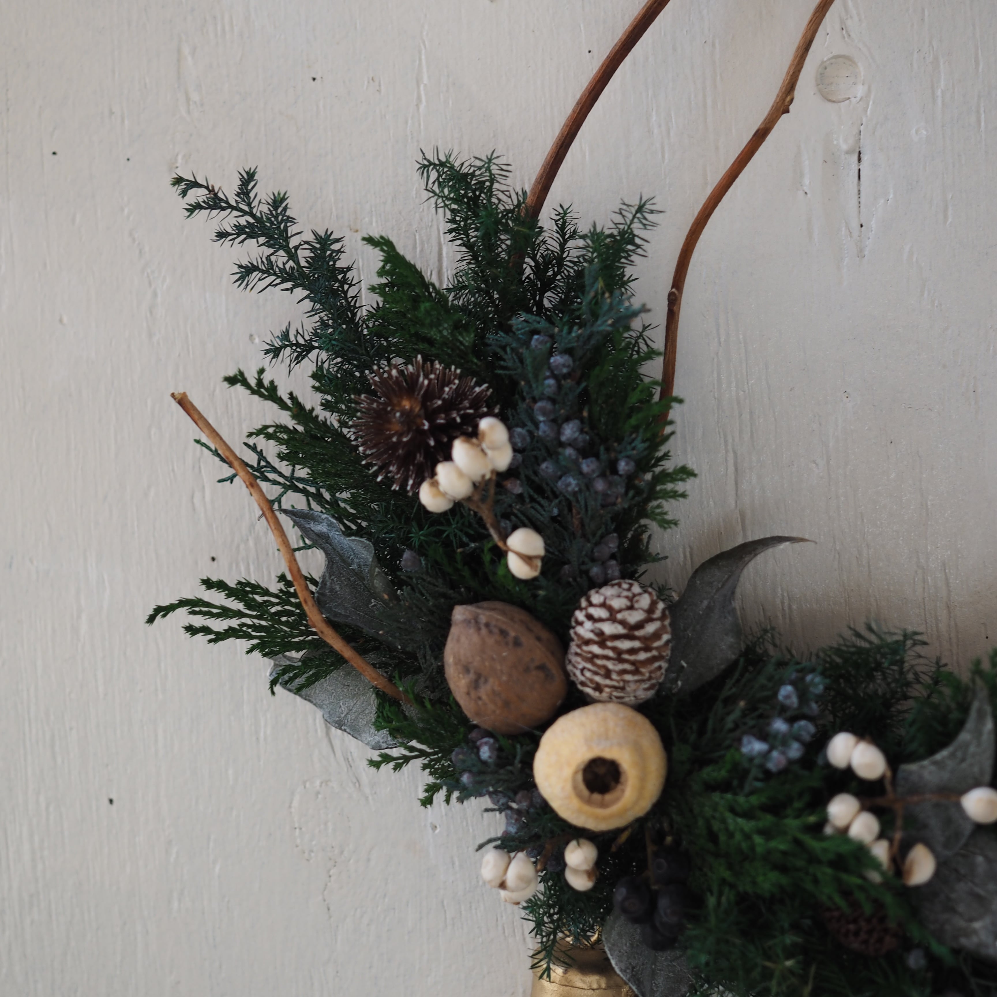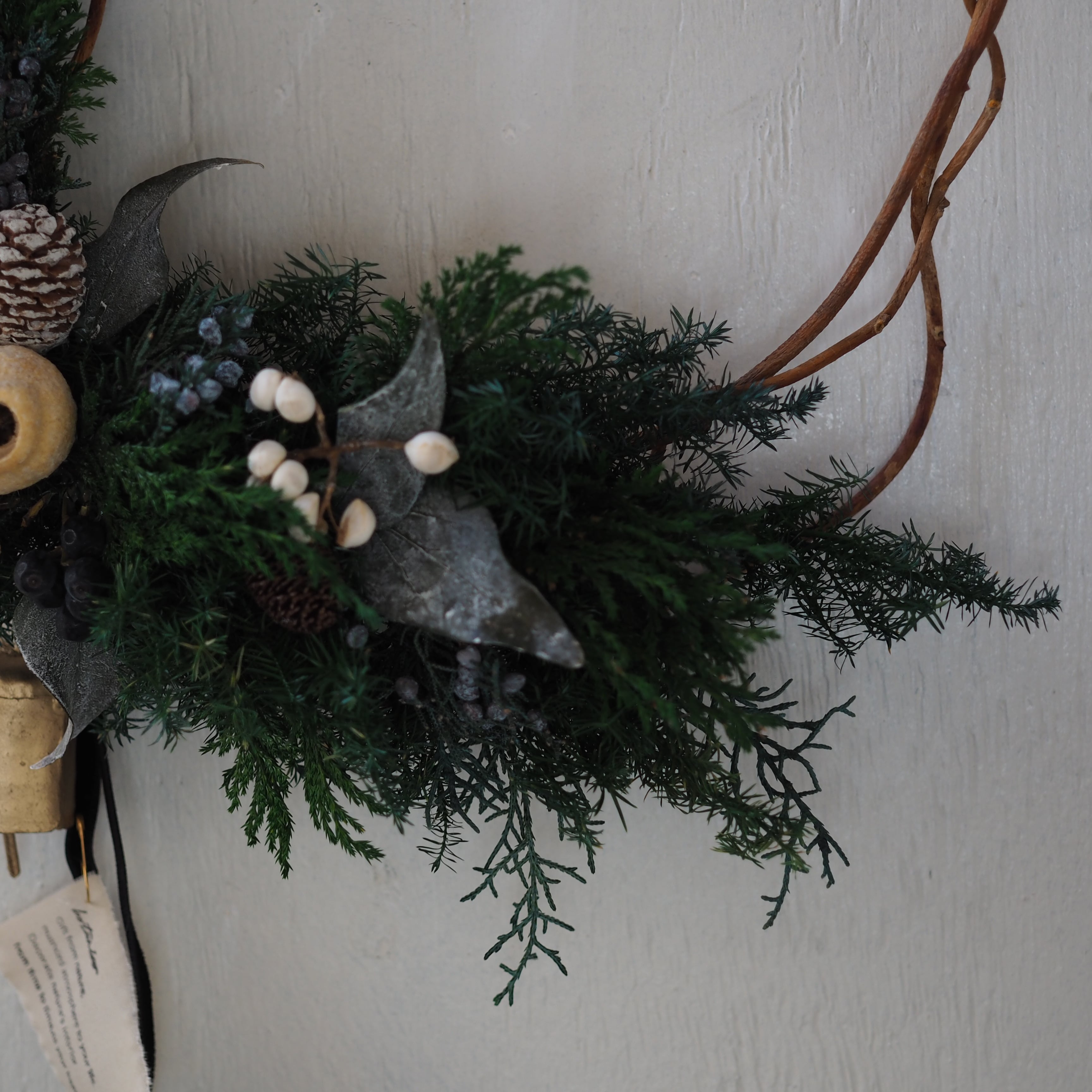 プリザーブドグリーンのマウンテンジュニパーやヒムロスギをベースに、木の実をあしらったナチュラルなクリスマスリース。