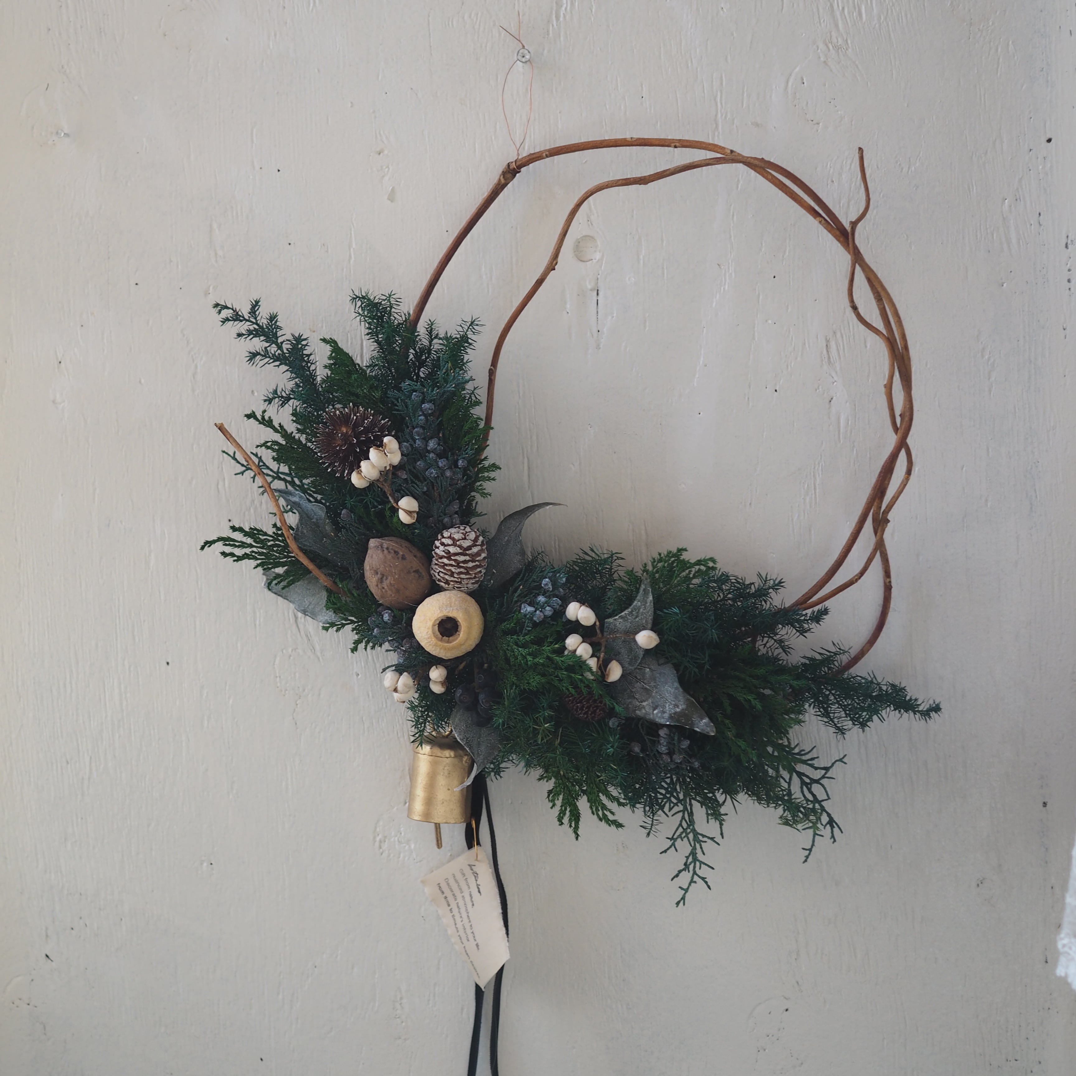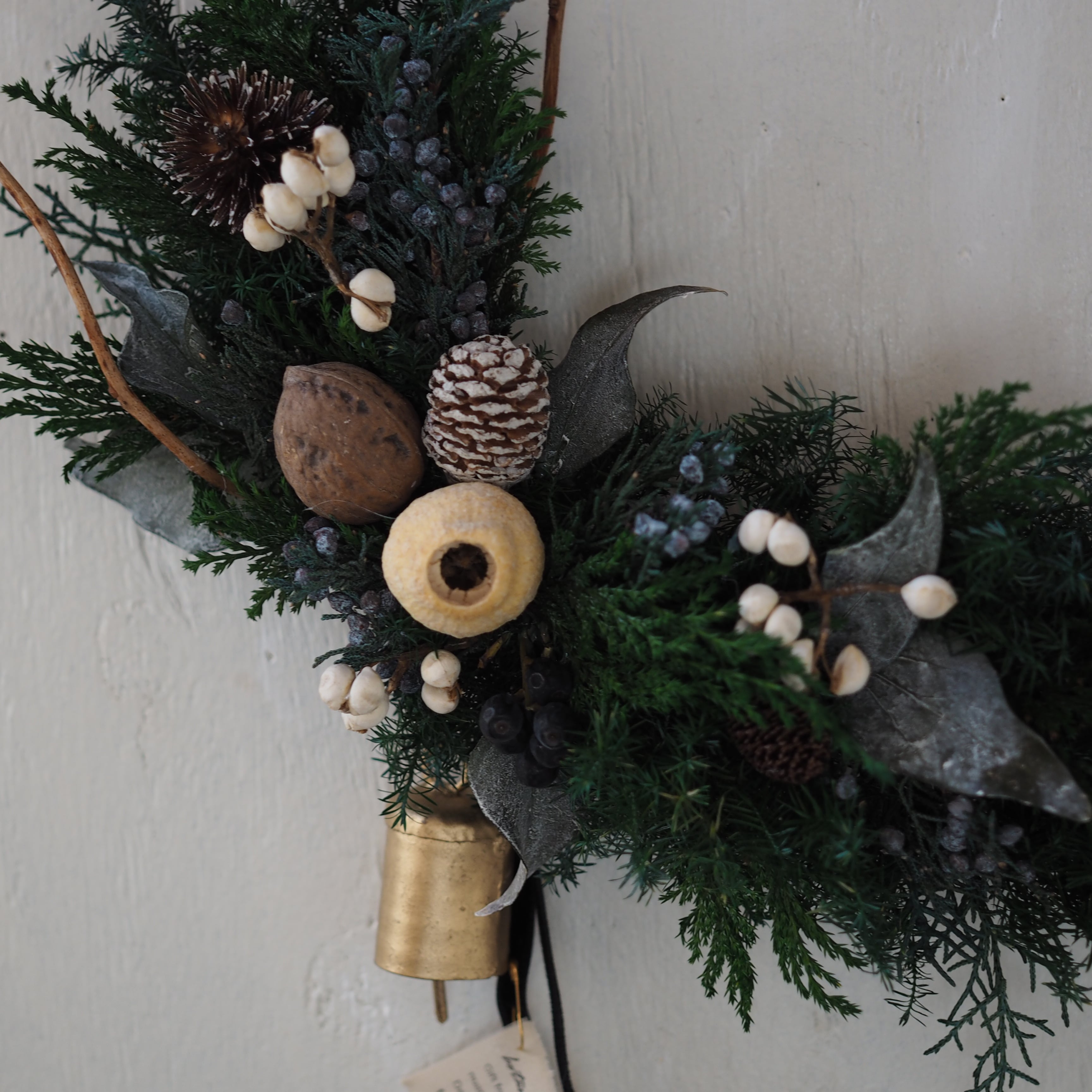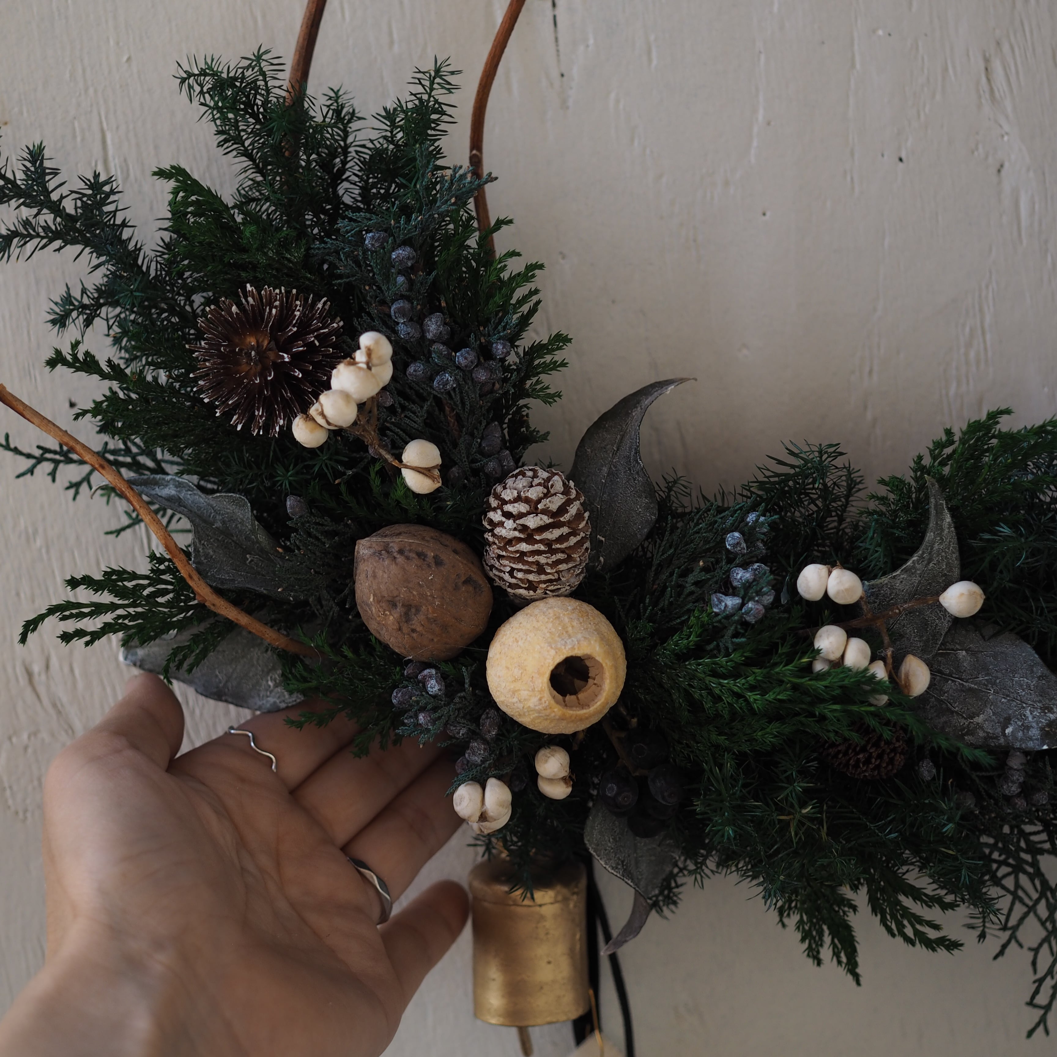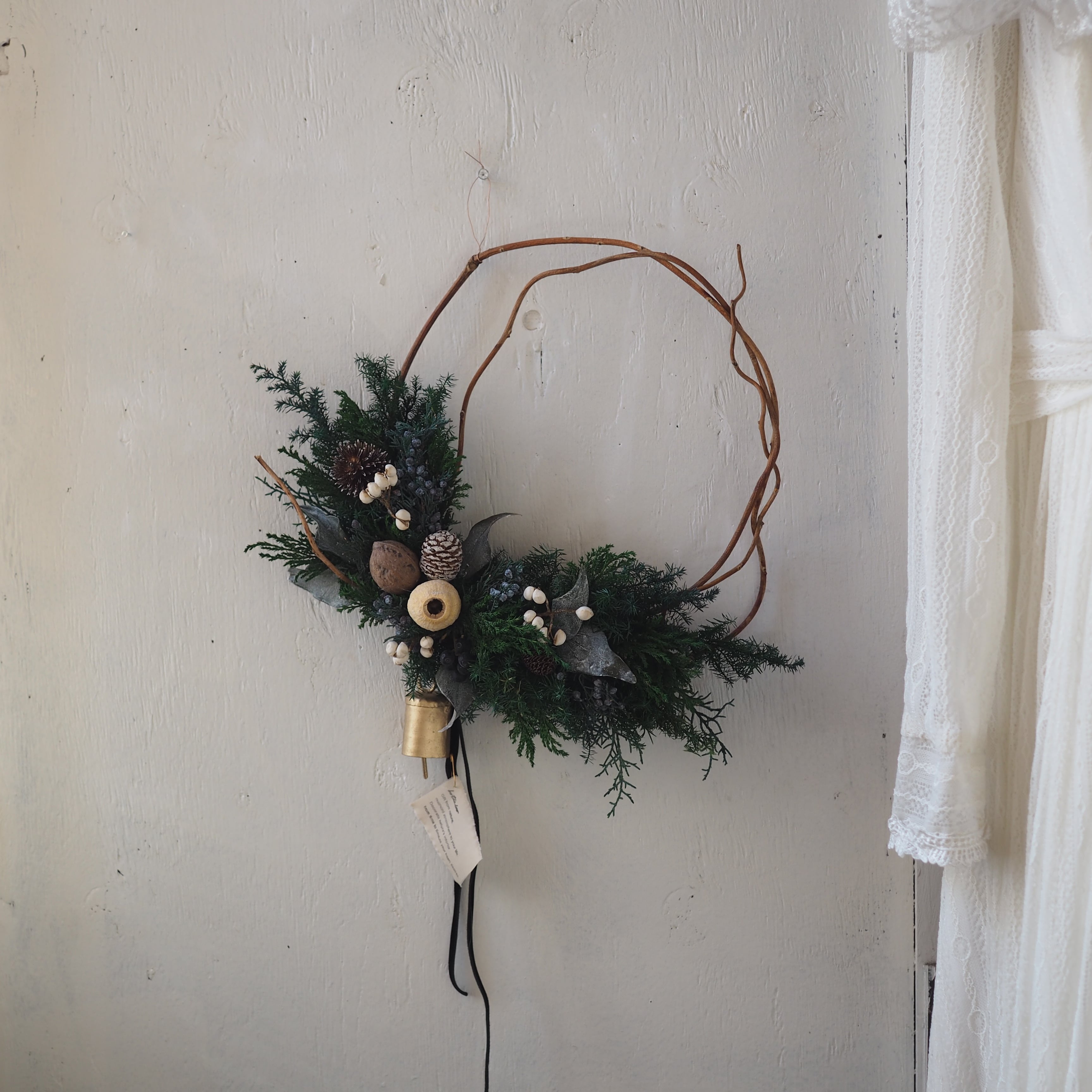 プリザーブドグリーンのマウンテンジュニパーやヒムロスギをベースに、木の実をあしらったナチュラルなクリスマスリース。