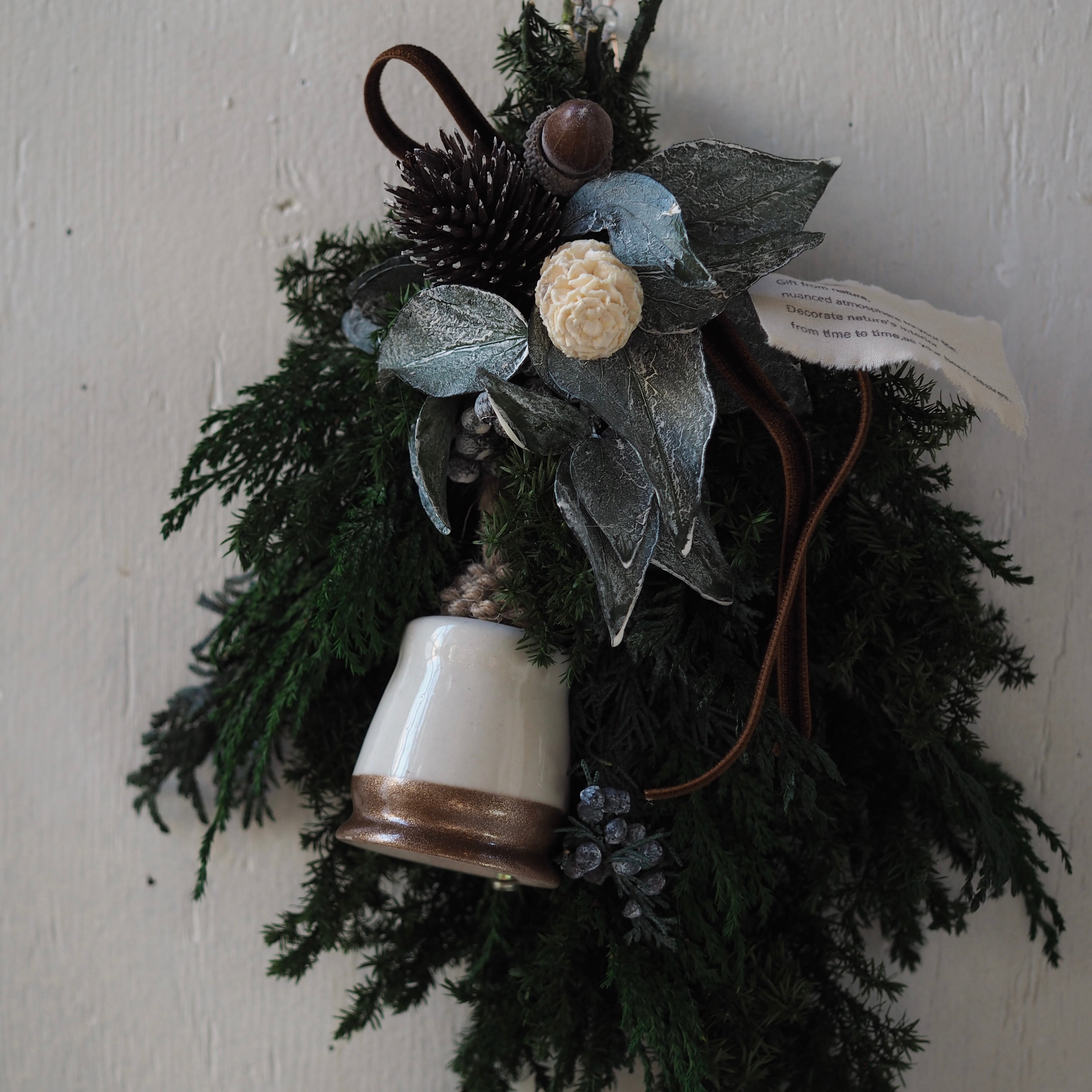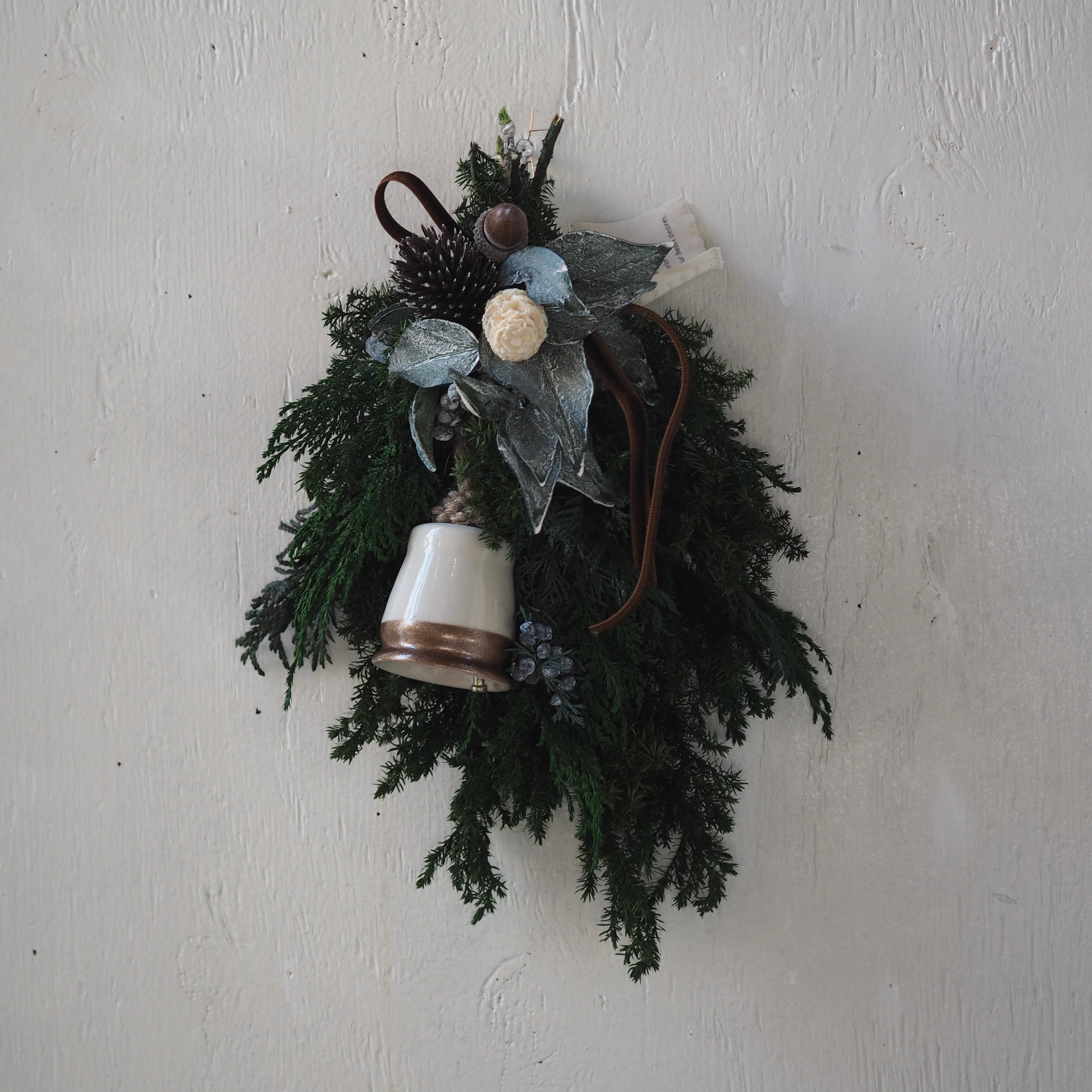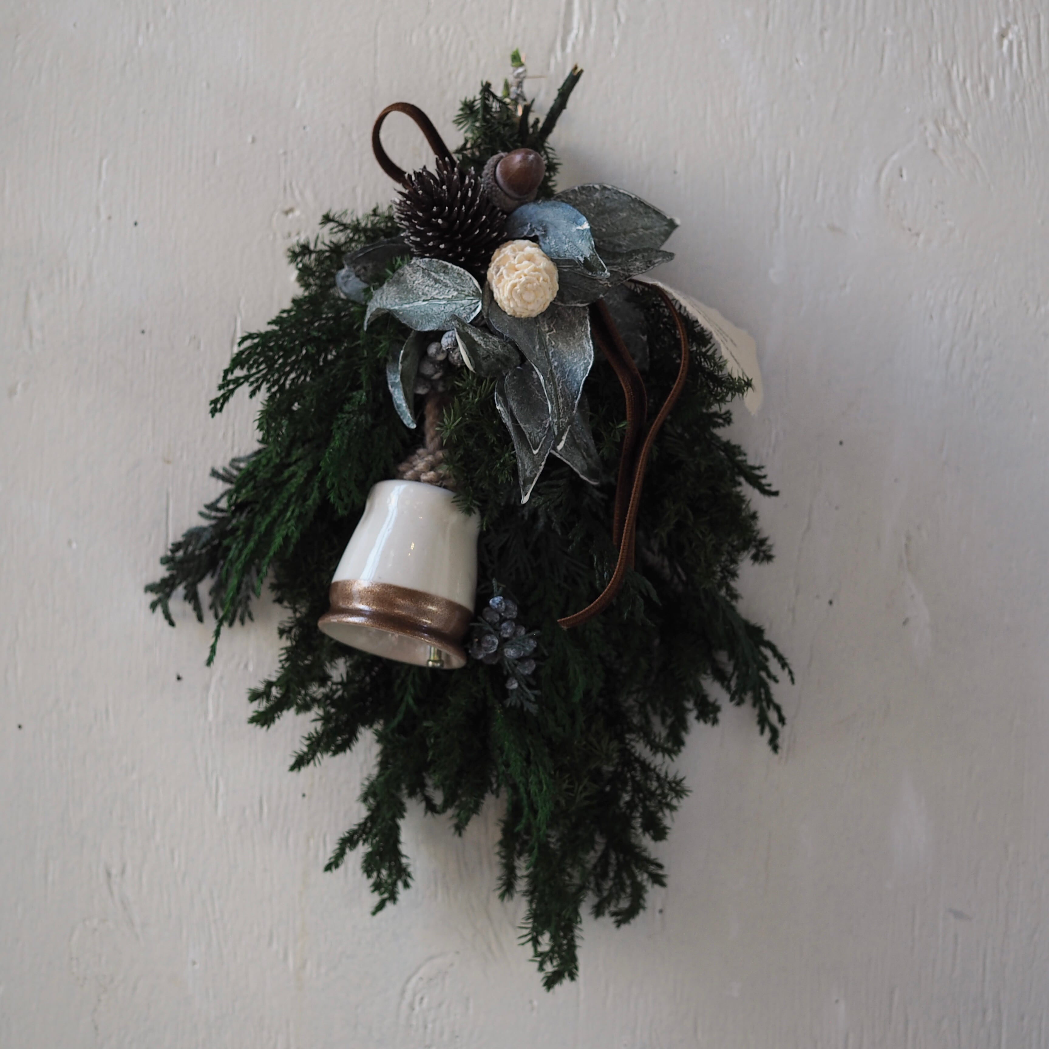 陶器のベルをつけた、シックなクリスマススワッグ。