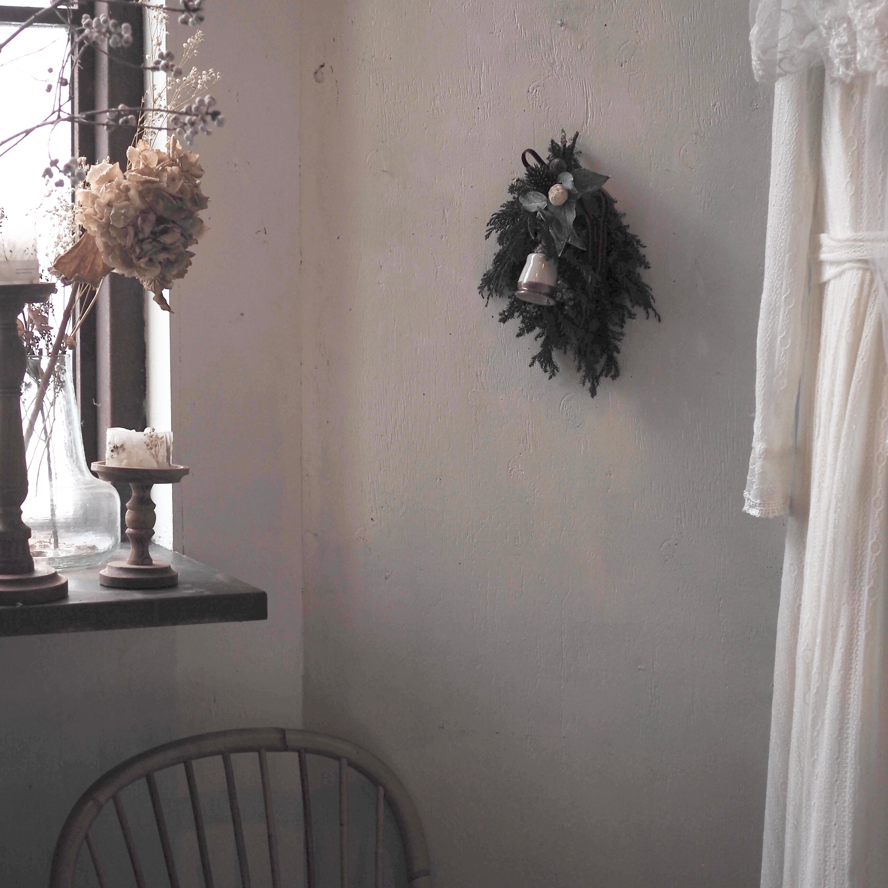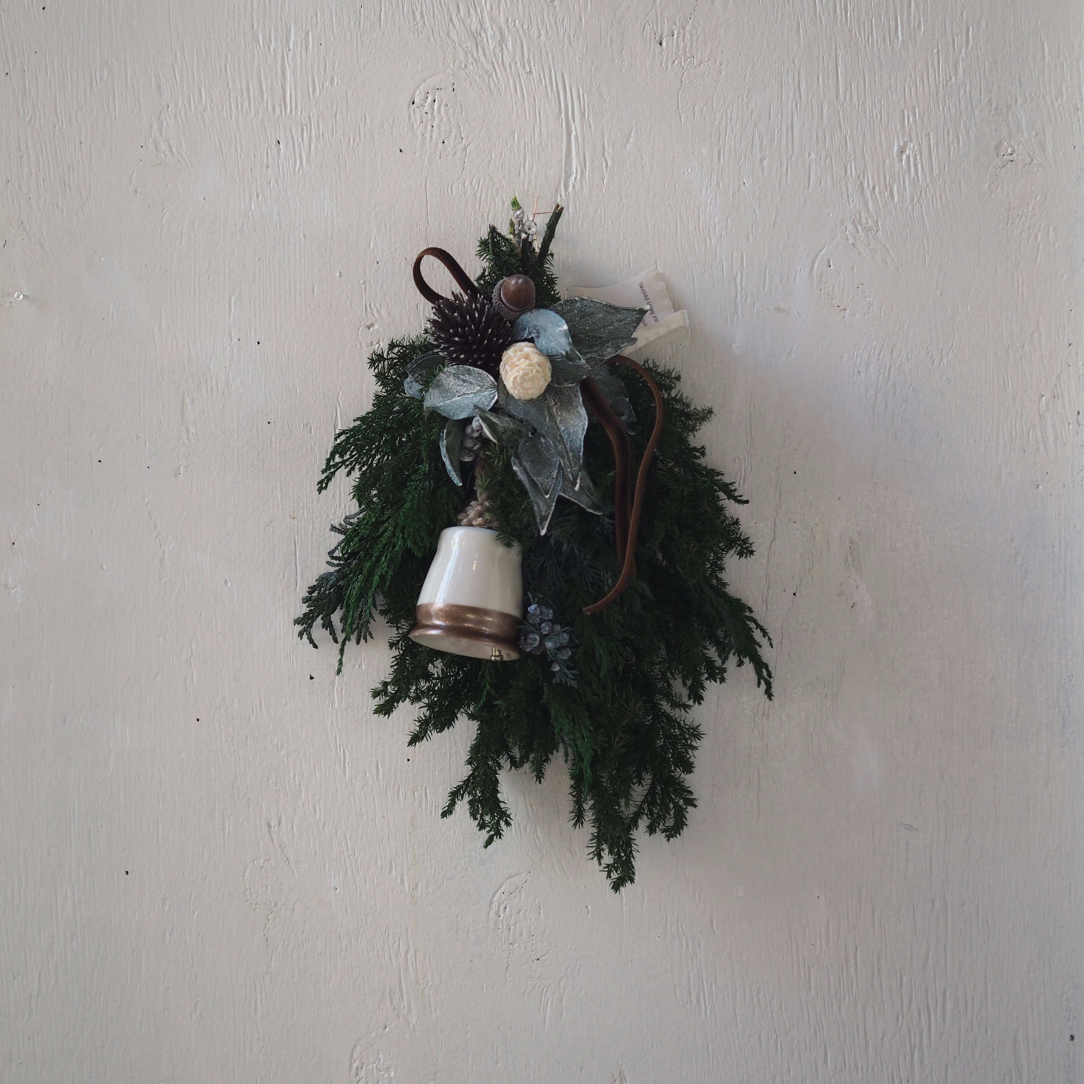 温かみのあるベルと、深いグリーンのコントラストが美しく、クリスマスシーズンのデコレーションにもおすすめです。