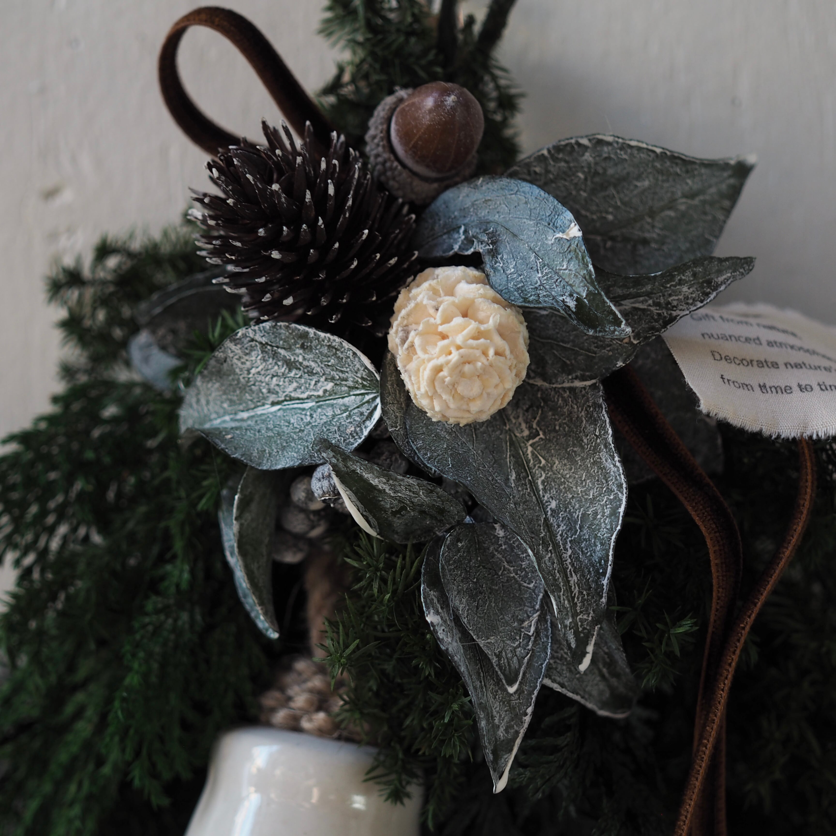 プリザーブドのマウンテンジュニパーやヒムロスギを束ねて、冬らしい森の香りを感じるようなデザインにしました。