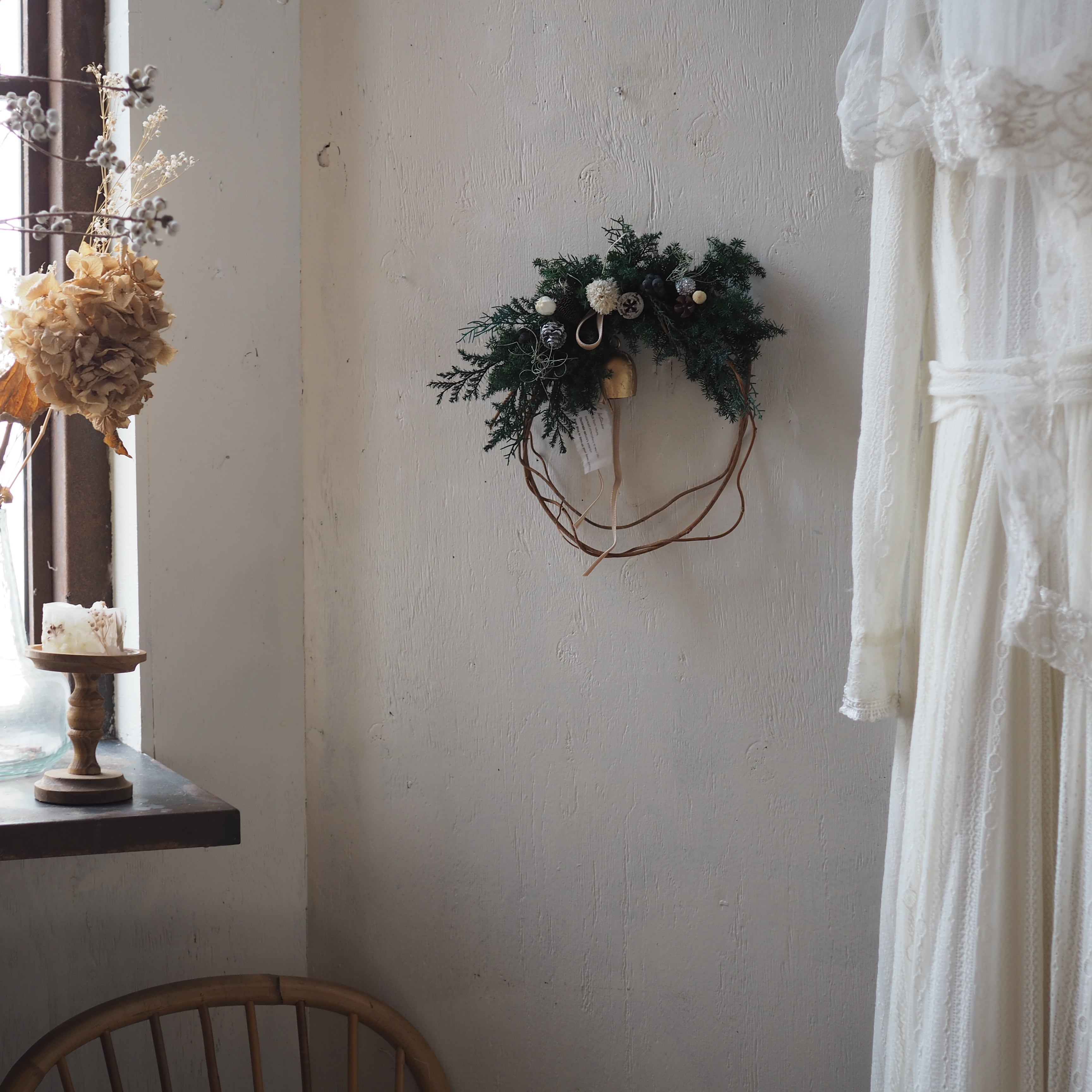 プリザーブドグリーンのマウンテンジュニパーやヒムロスギをベースに、木の実をあしらったナチュラルなクリスマスリース。