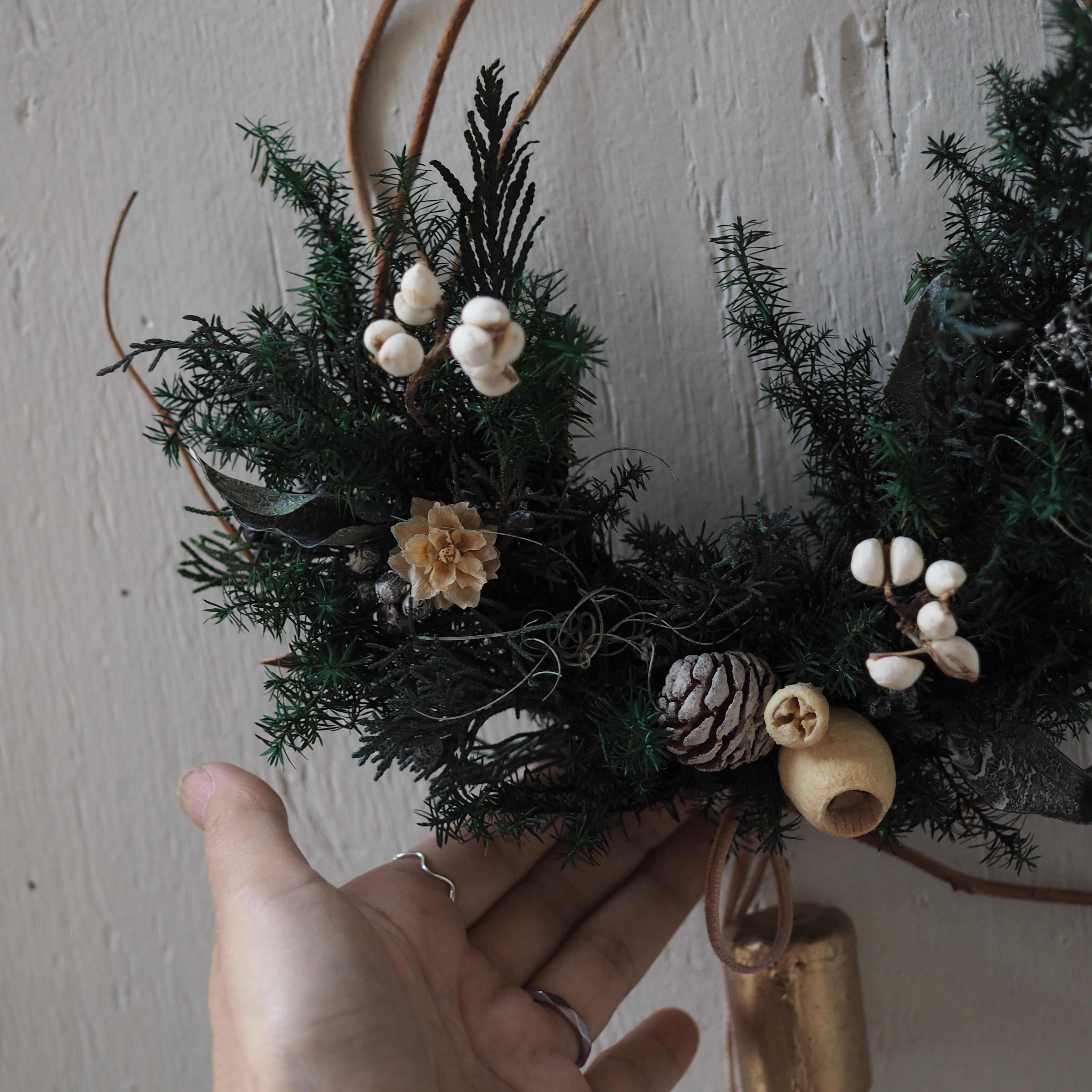 プリザーブドグリーンのマウンテンジュニパーやヒムロスギをベースに、木の実をあしらったナチュラルなクリスマスリース。