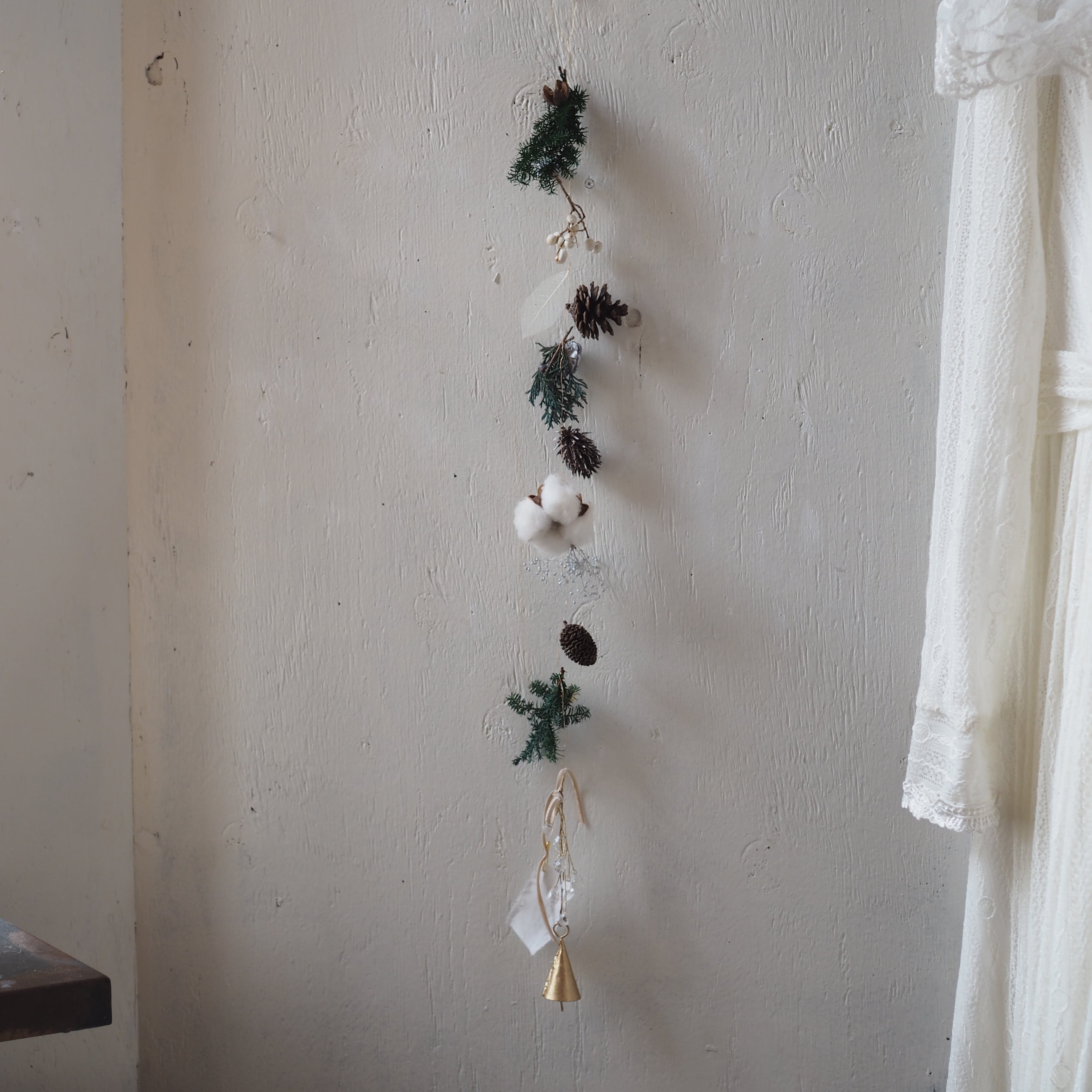 木の実やコットンフラワーをアクセントに、深みのあるグリーンをところどころにあしらったクリスマスガーランドです。