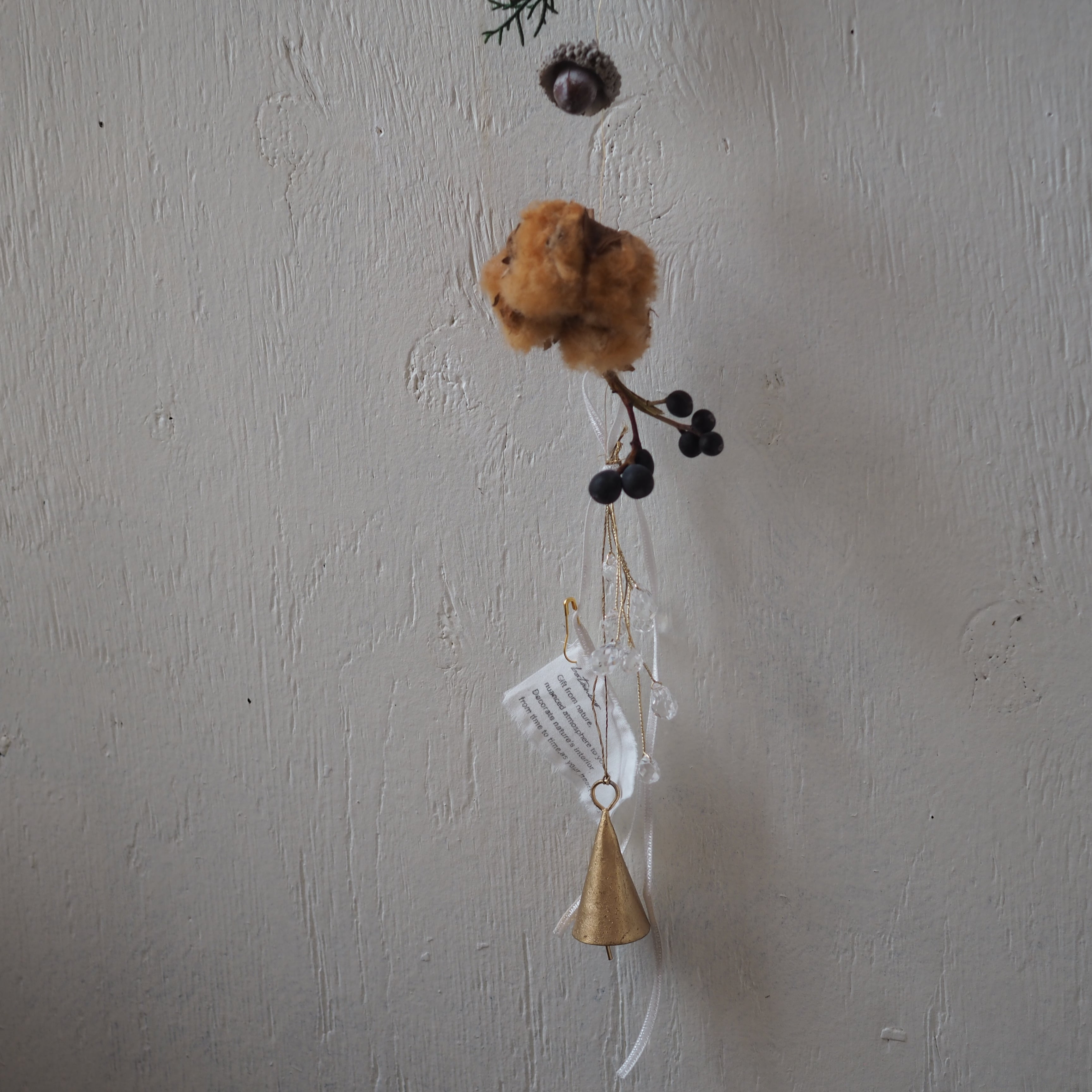 木の実やコットンフラワーをアクセントに、深みのあるグリーンをところどころにあしらったクリスマスガーランドです。