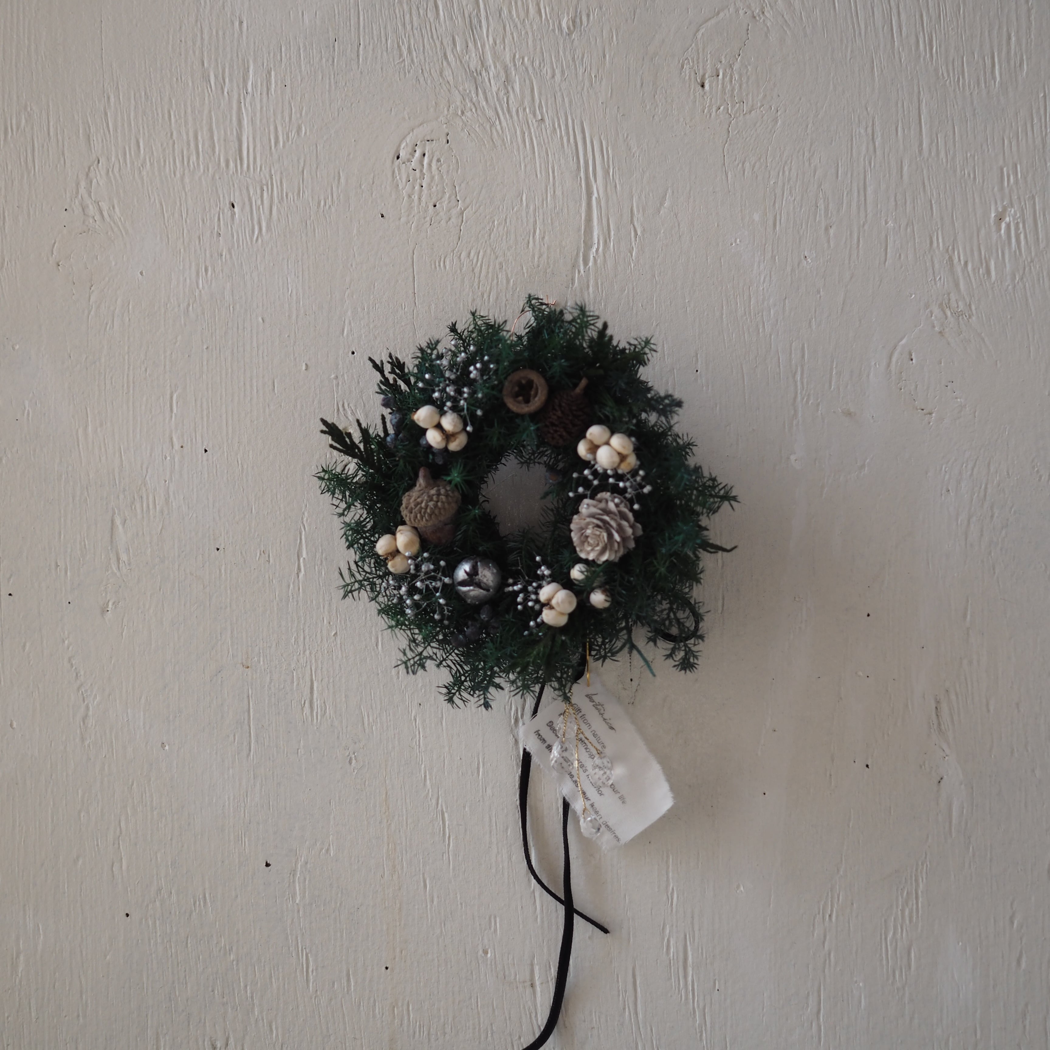 プリザーブドグリーンのマウンテンジュニパーやヒムロスギをベースに、木の実をあしらったナチュラルなクリスマスリース。